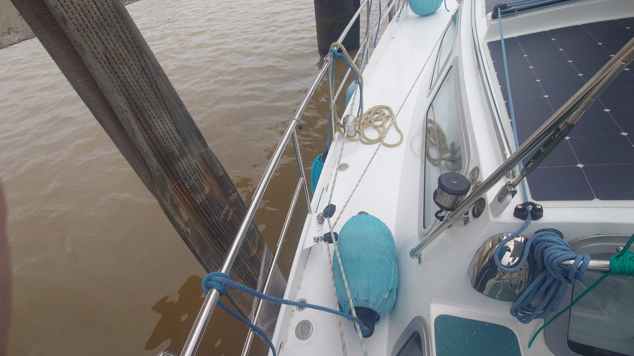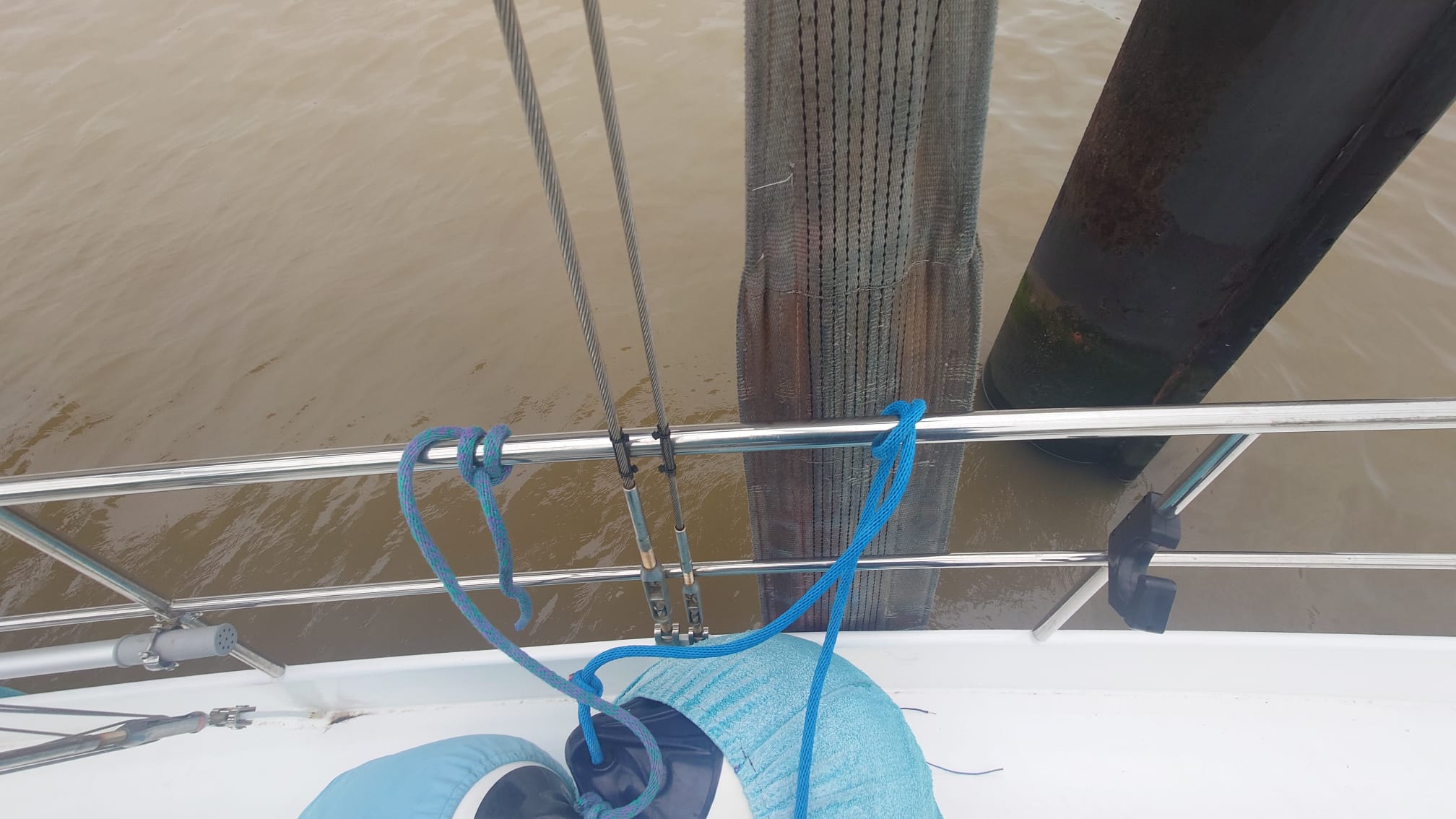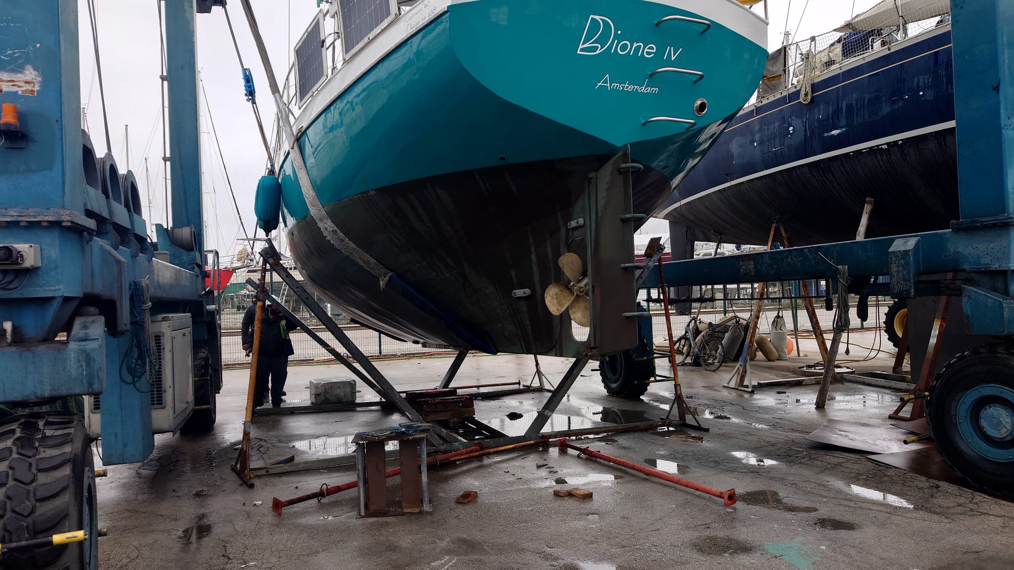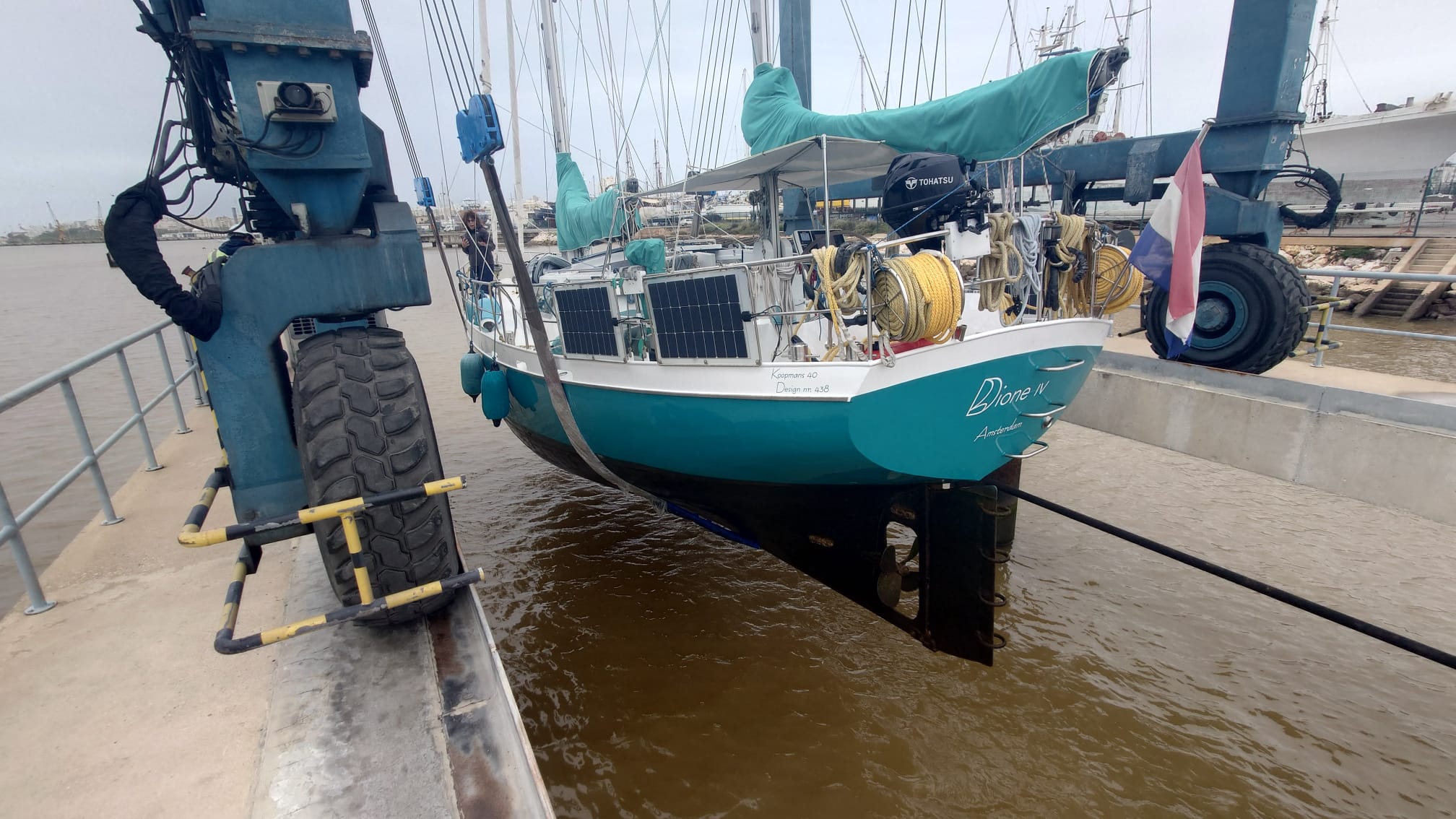 Then we move to the travel lift portal. No travel lift there, no boatyard people. We call the office again. “Wait till you see the travel lift and our people”. Hm. We wait 45 minutes…hovering in the wind, in front of the portal… and then the travel lift appears and the men wave us. We have to go in, in reverse. The portal is all concrete which it way too high for our boat fenders at half tide. Well, with help of the bow thruster Wim manages to move Dione IV in without touching the concrete 🫡. Once we’re over the slings they quickly hoist a bit and we stay free of the concrete.