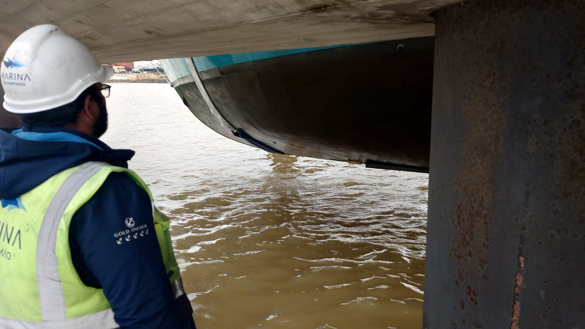 First they carry Dione IV to the area for high-pressure cleaning. We have only a very light layer of algae so this is an easy job.