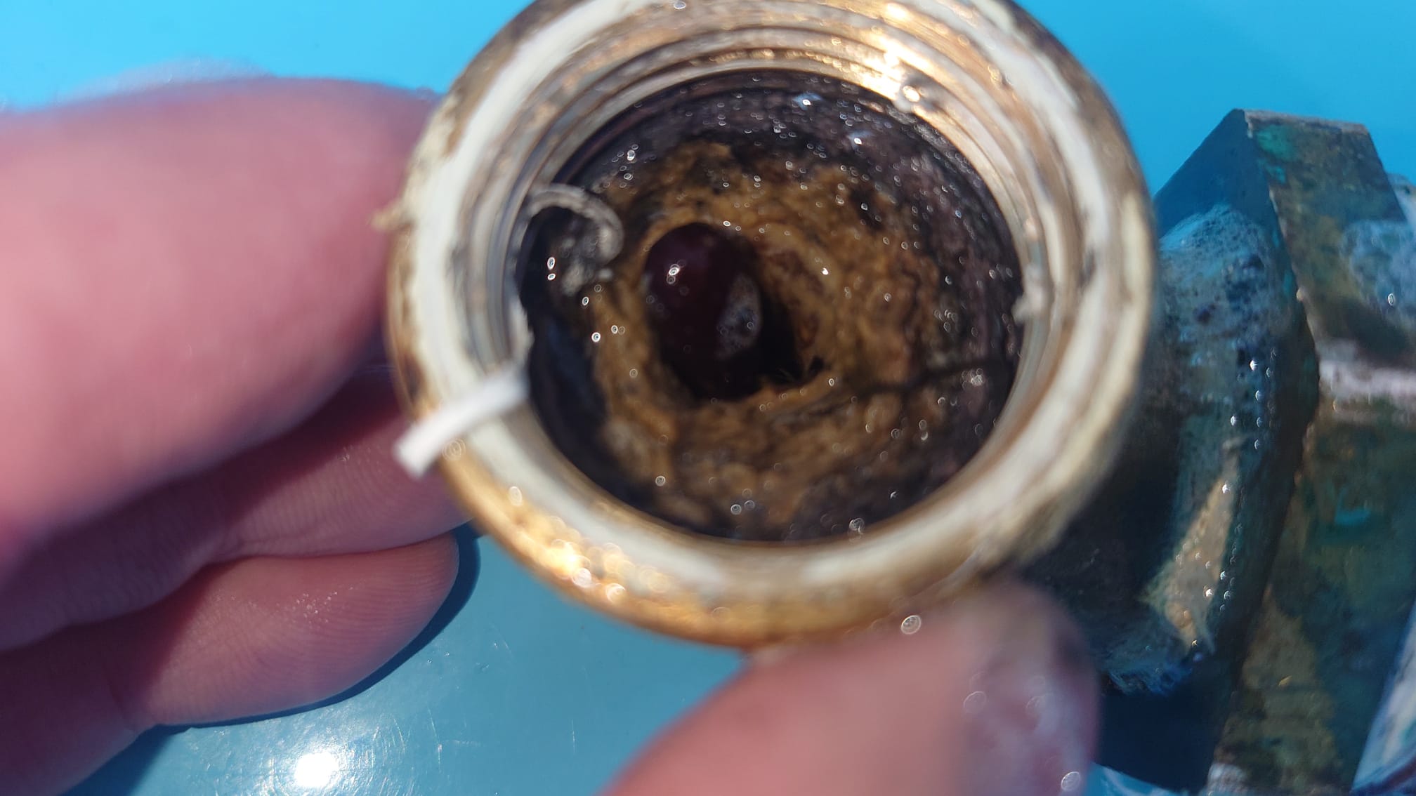 The big 1-1/4″ T-piece is full of limescale with only a 10mm hole left. In that hole sits an anona pit!