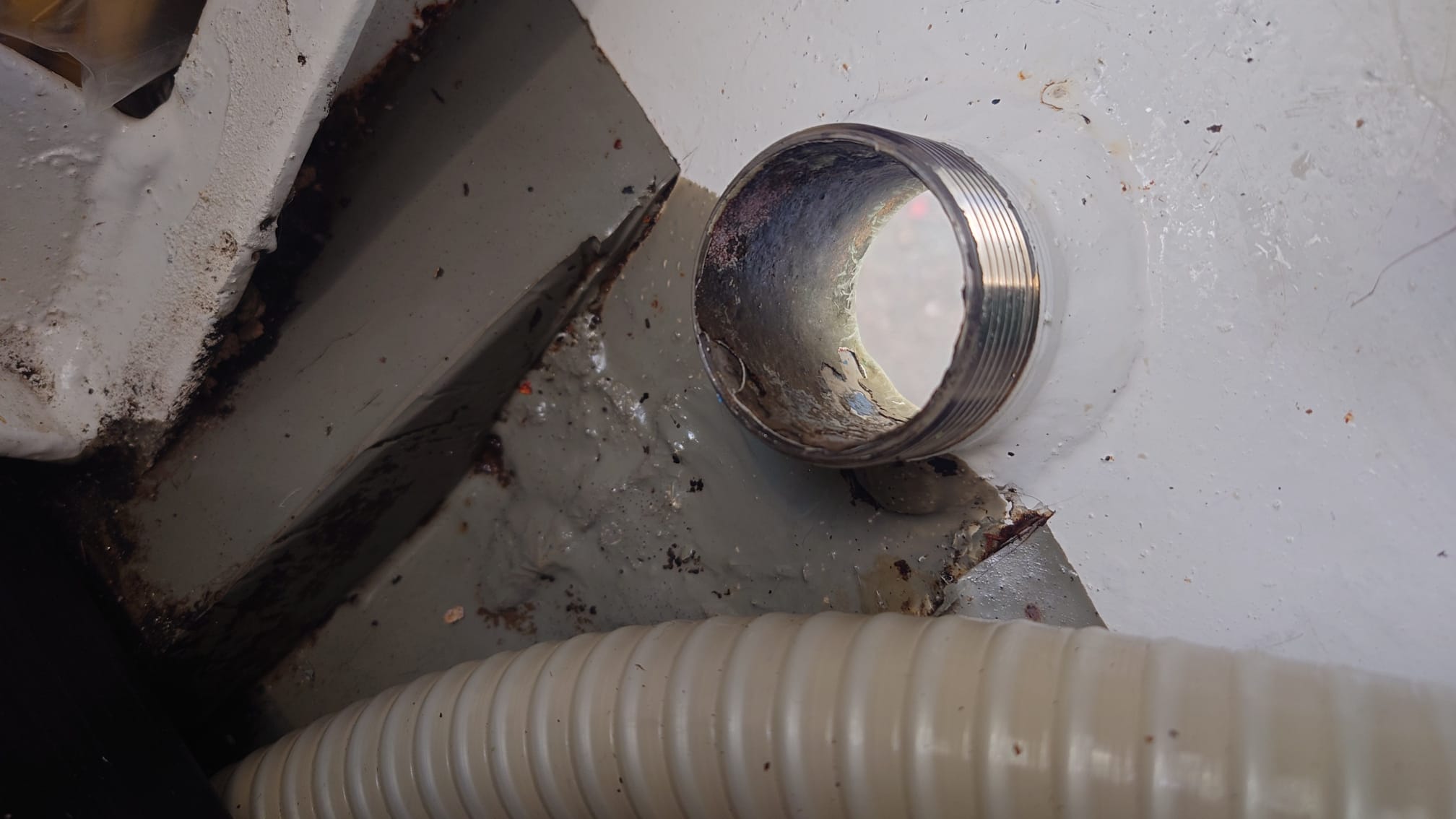 But the first one is gone! The galley drain. This was the easiest one. The stainless steel fitting looks like new! That is great! We were uncertain about corrosion. It’s different metals together: the bronze valve, the stainless steel fitting, the steel hull. That could cause a nasty electrolytic corrosion. But, nothing at all! That’s perfect! 🥳
