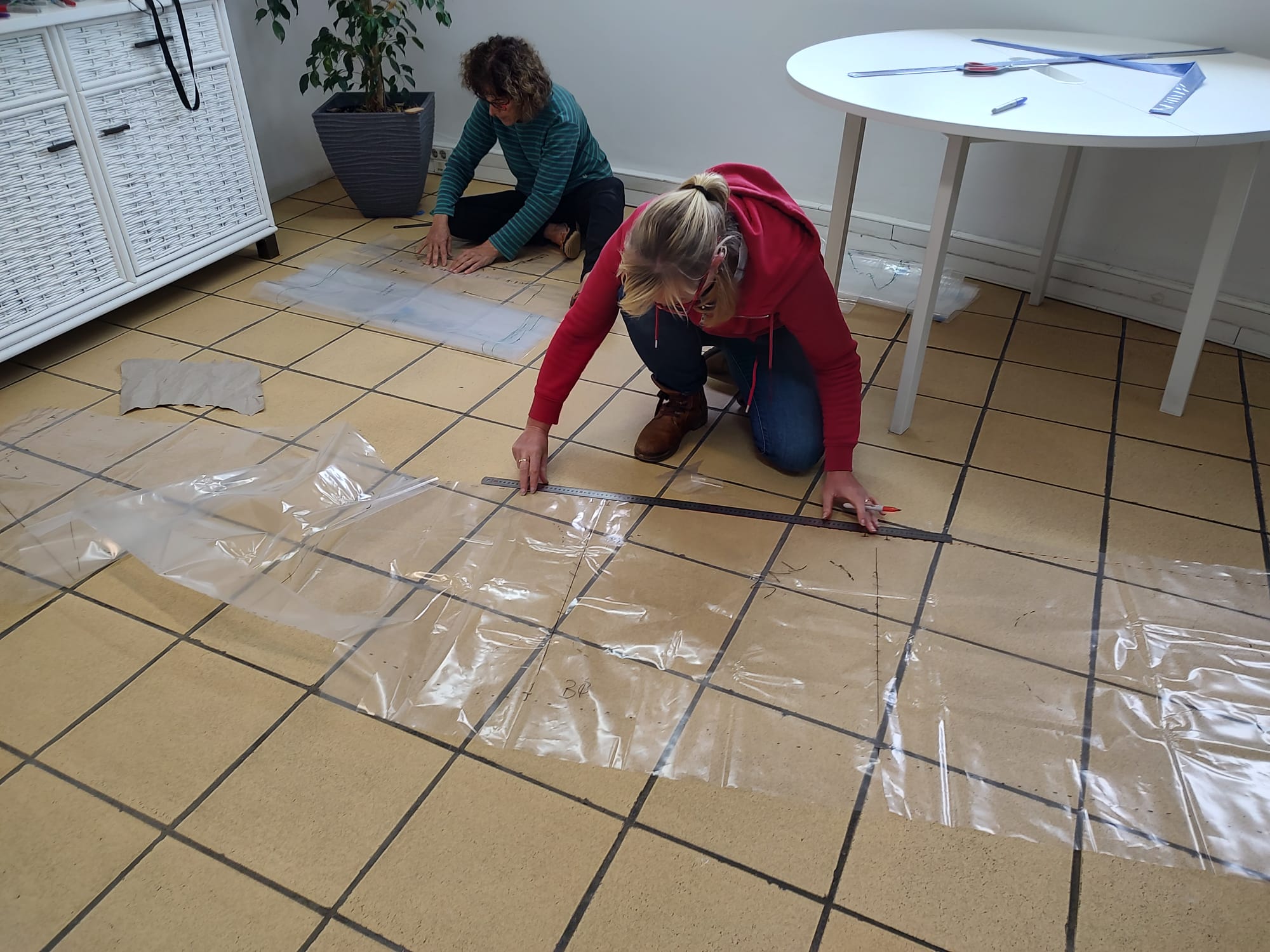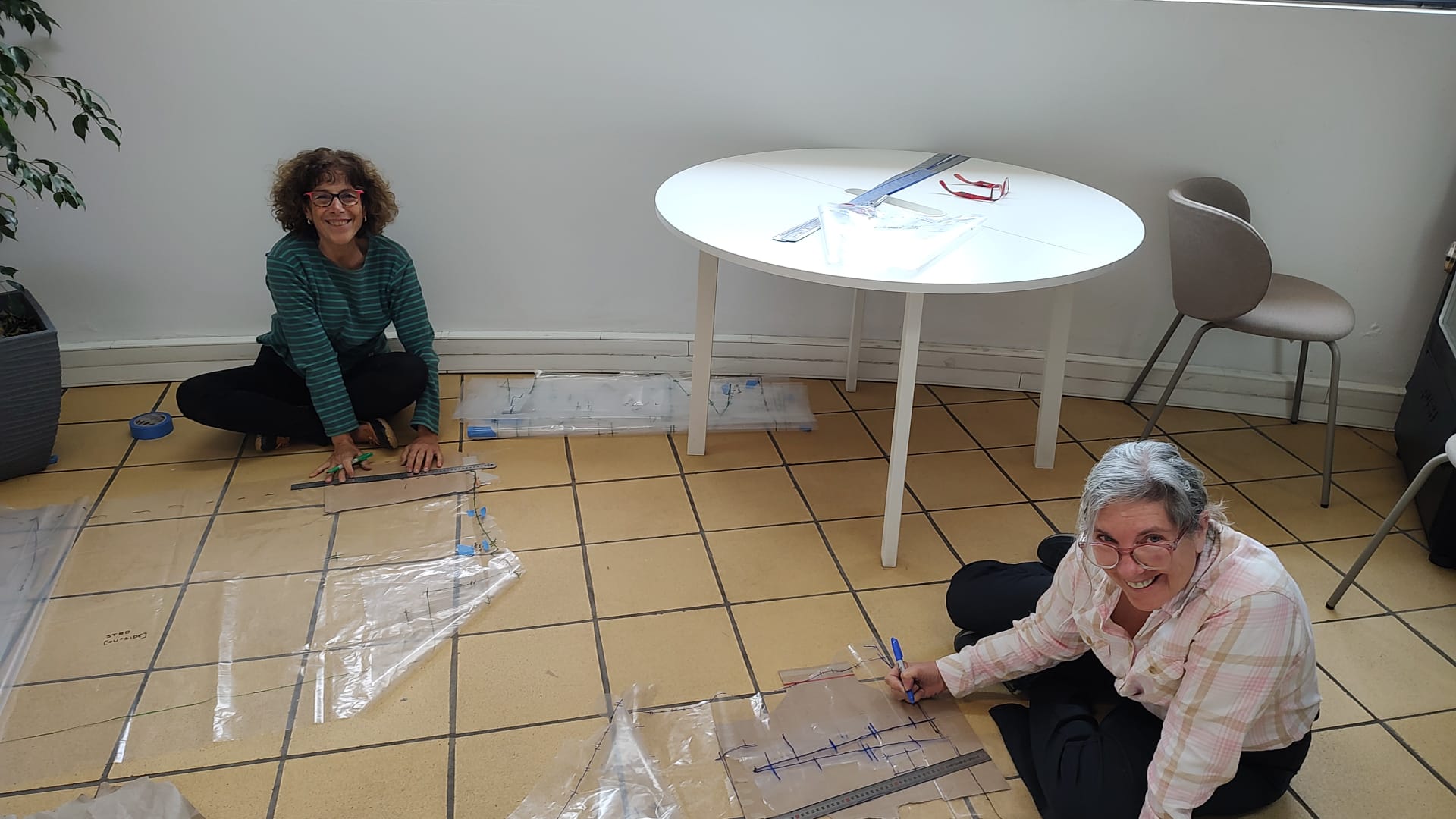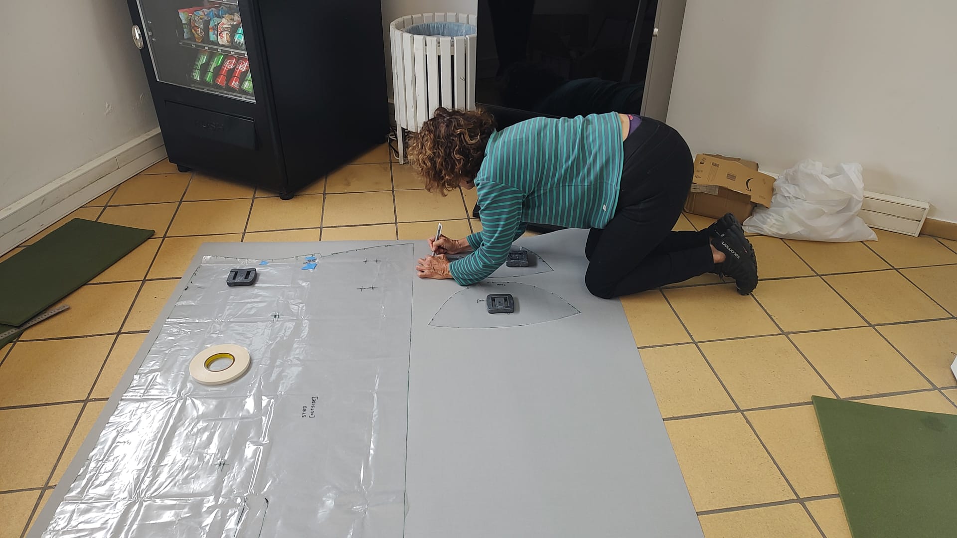 After that, Sher takes a Bolt taxi to the marina. Sacha (boat “Smile”) has arranged that the ladies can work on the dinghy chaps patterns in the marina office. They’re fitting the patterns together.