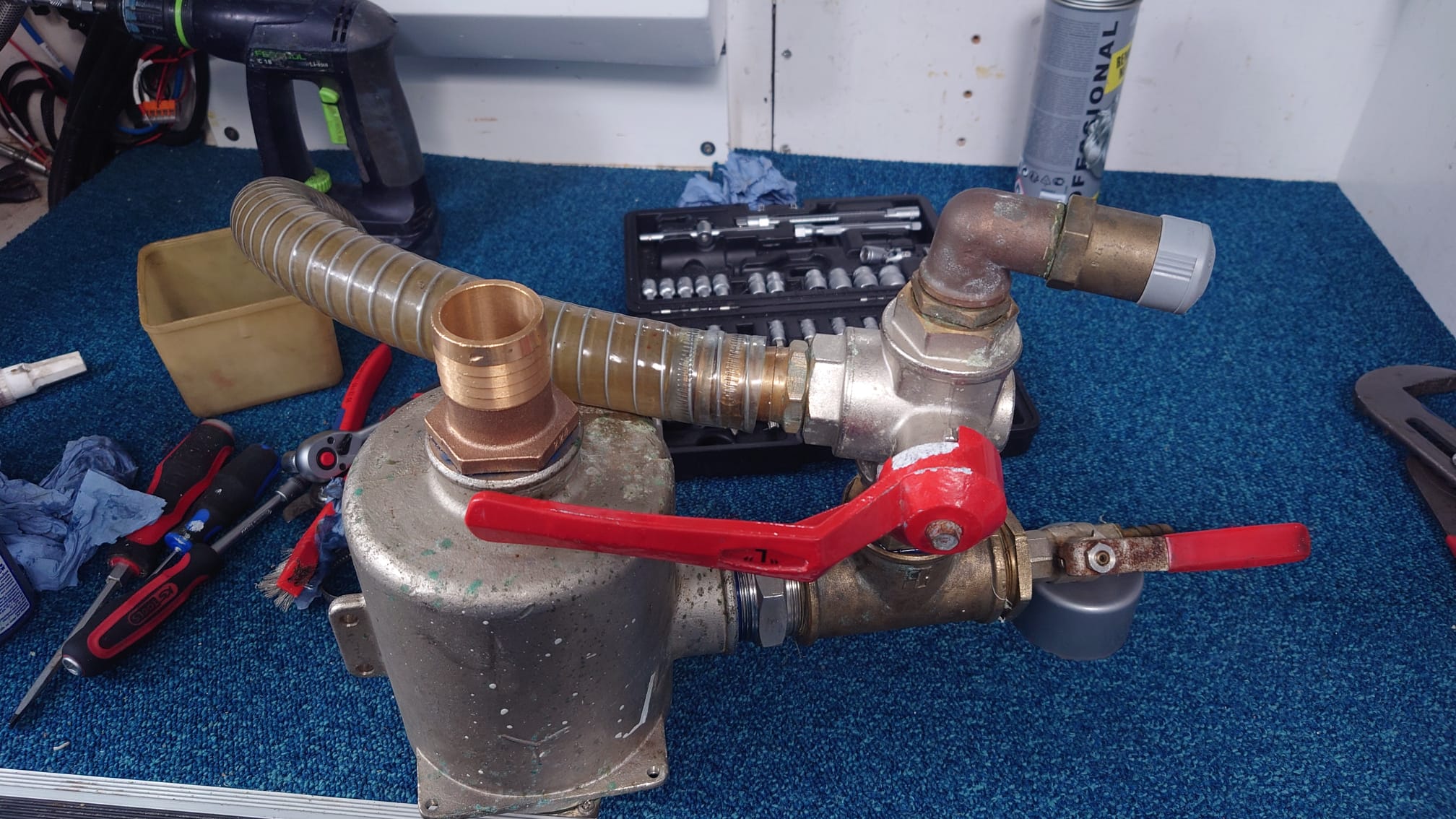 Here’s some old plumbing which was intended to use for pump-out the holding tank but that was never used. Not easy to reach with big heavy tools, everything turns very hard and it’s very a complicated order of disassembly. It takes Wim the entire day and sore muscles in his in hands, arms, neck and back 😫…