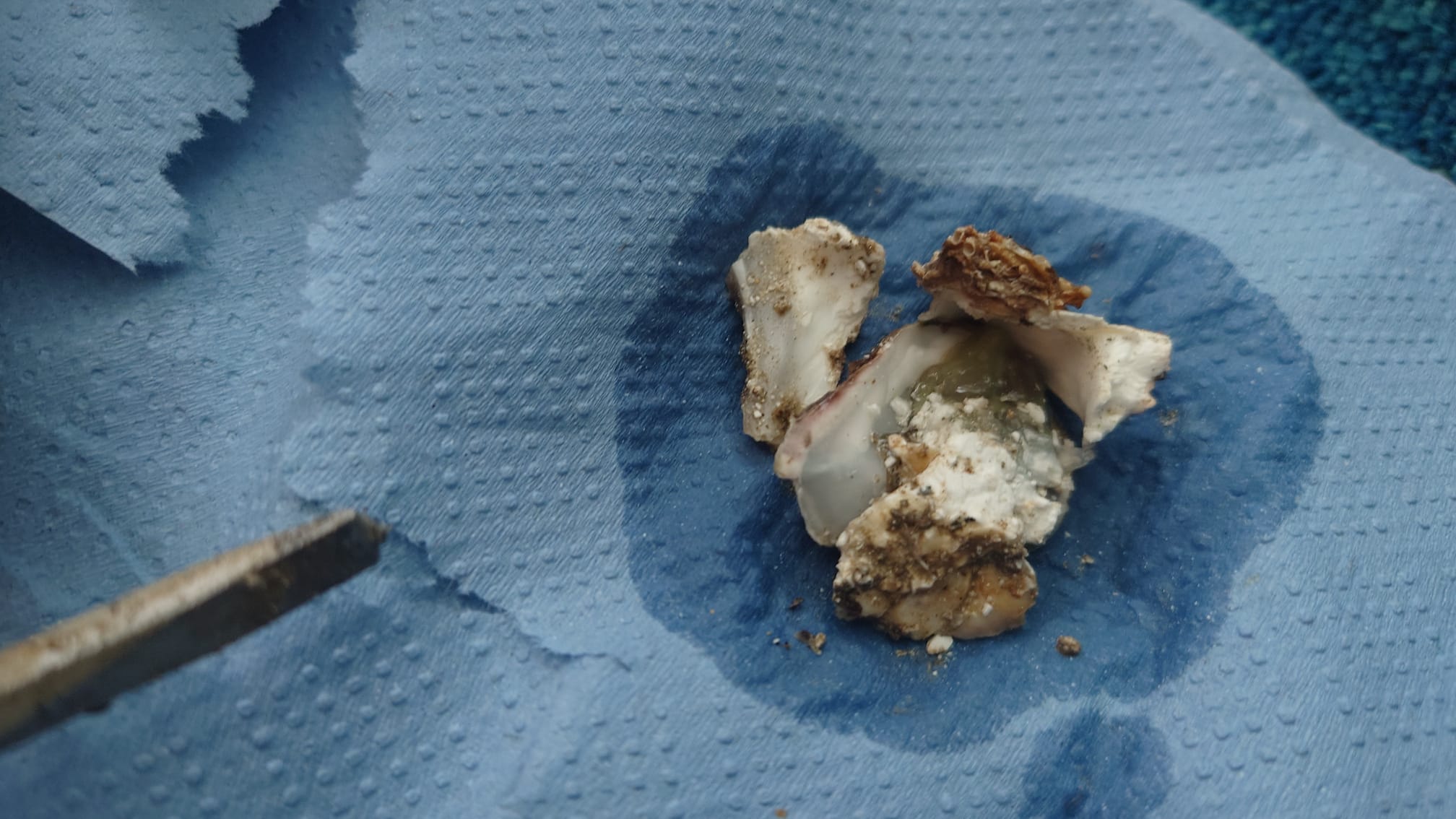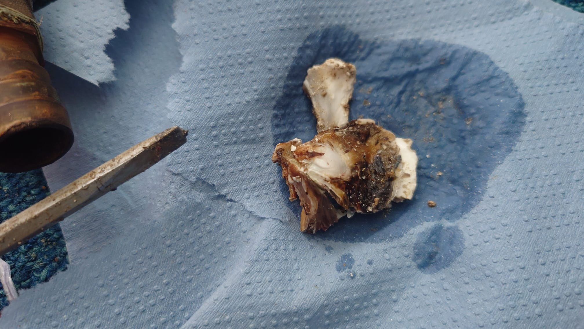 Remember we had some trouble with mussels in our seawater inlet in Ria de Arousa? Now that we have the valve removed we can have a look in the pipe. There is an oyster in it!!