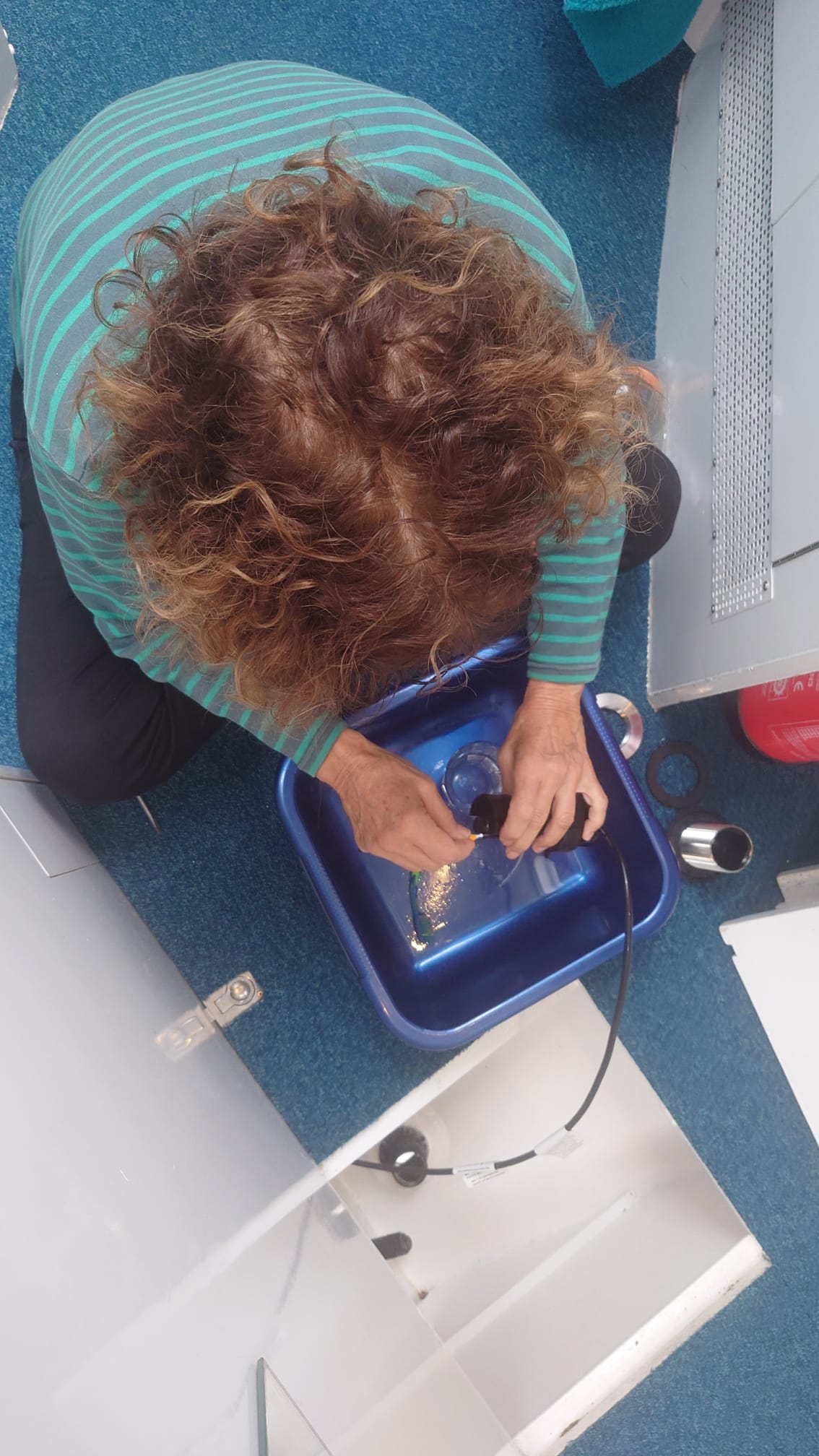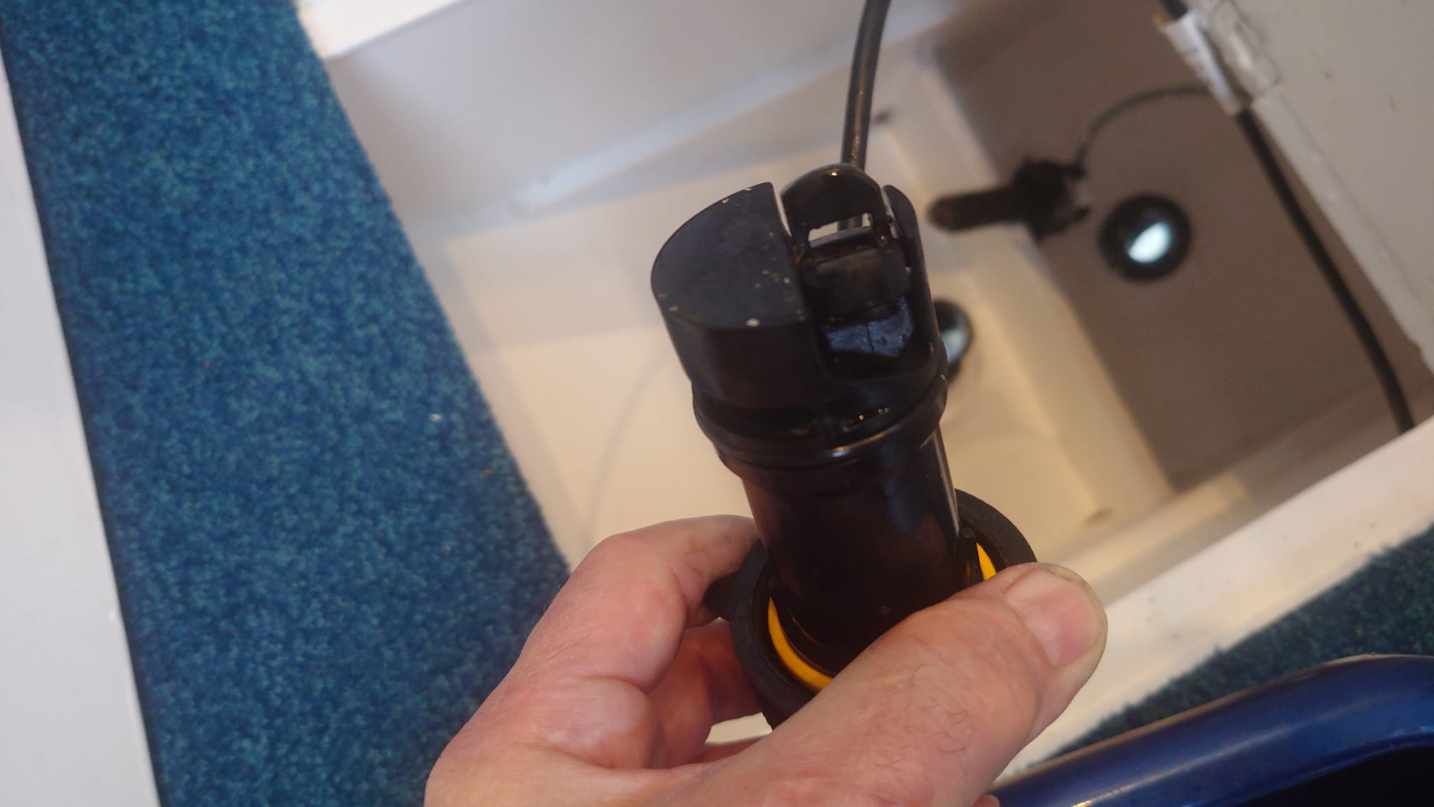 But, of course there’s no antifouling on the transducers (they don’t work with paint on it) so all kinds of sea life (mussels, shrimps, barnacles, seaweed) grows on it and thus, they need regular cleaning. That is done by pulling out the transducer, sea water sprays in the boat and you must quickly insert a plug in the tube. Then, we clean the surfaces, pull out the plug, seawater sprays again and quickly insert the transducer. This is not only stressful but also messy. Everything gets wet and since we don’t want salt water in our bilges, we have to clean and dry everything with fresh water. One on the most tricky and stressy things is: what if the plastic tube breaks while we’re moving things in and out? And we can’t close the hole any more? 😱