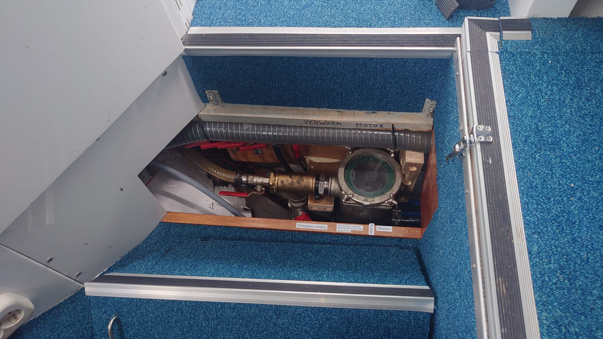 The last and most difficult valve: the seawater inlet for the engine, toilet and water maker. We have to disassemble the side of the engine compartment and the floor in the aft cabin.