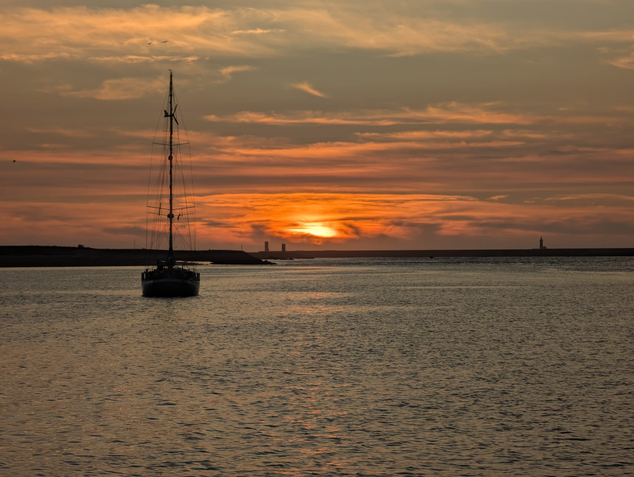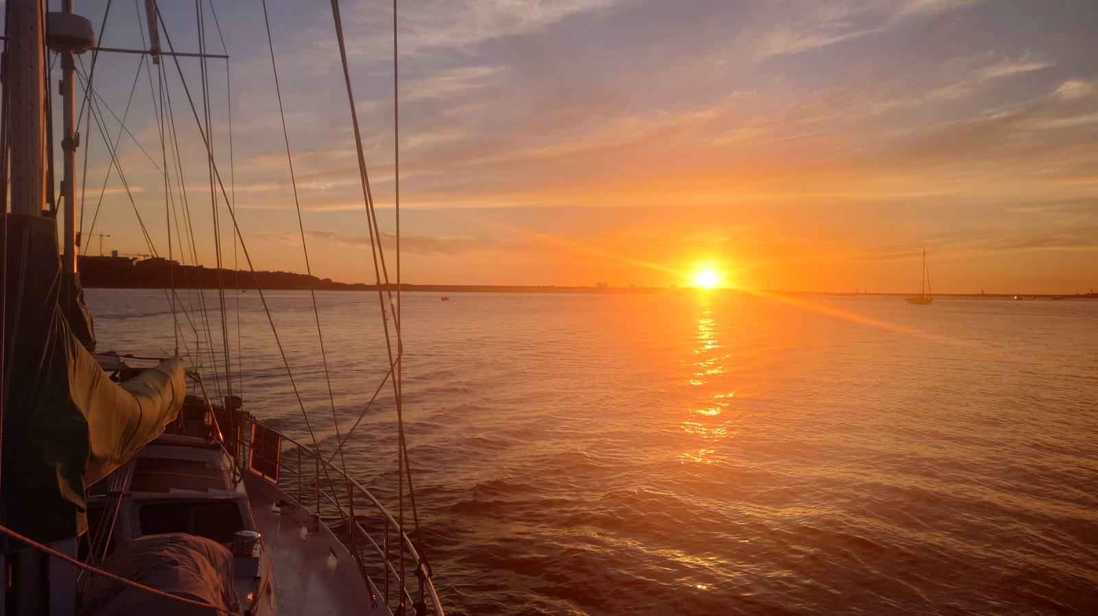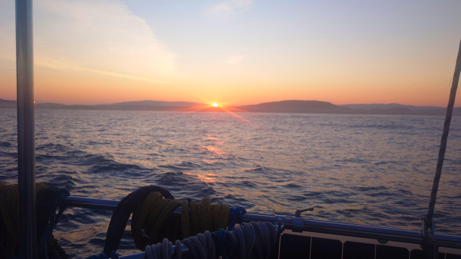 As the sun rises behind us, we sail out of the Douro with a big current on our stern. The Douro spits us out with a speed of 7-8 knots as if to say: you have been here long enough, onwards! 😄