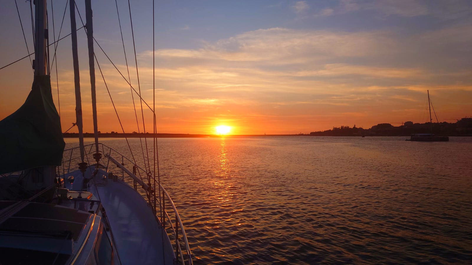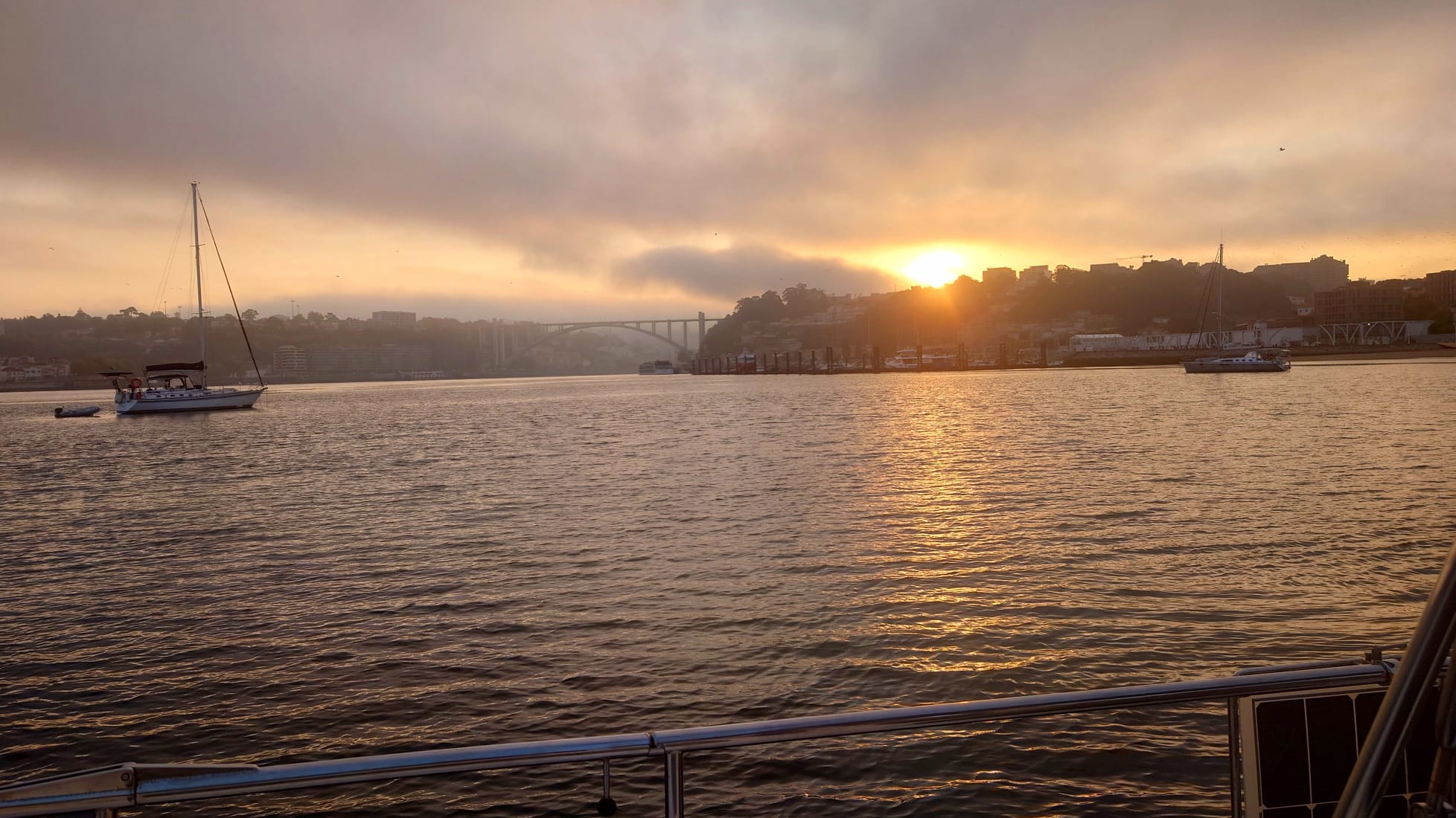 As the sun rises behind us, we sail out of the Douro with a big current on our stern. The Douro spits us out with a speed of 7-8 knots as if to say: you have been here long enough, onward you two! 😄