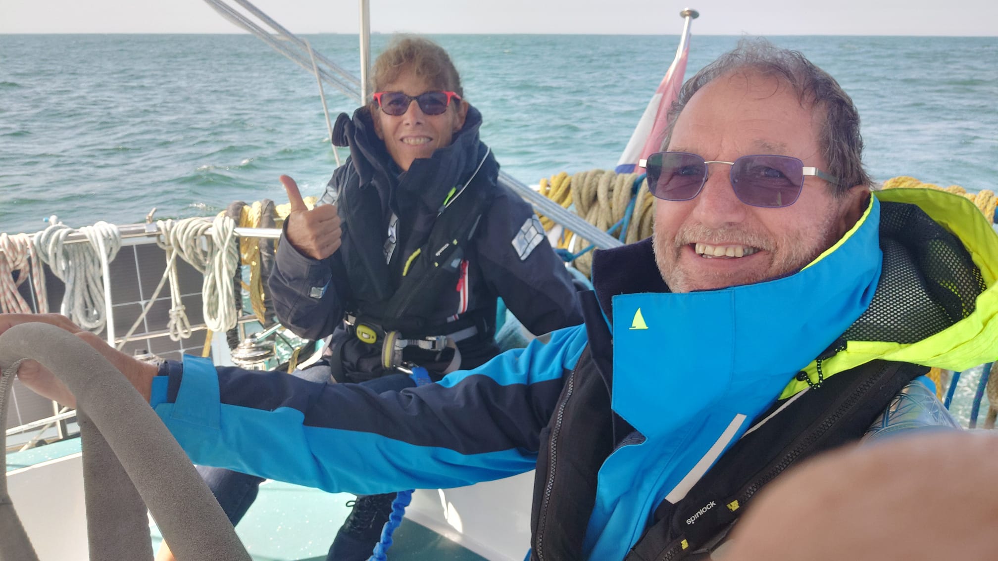 Around noon, the wind increases to 10-15 knots, broad reach. We unfurl the Yankee sail and turn the engine off.
