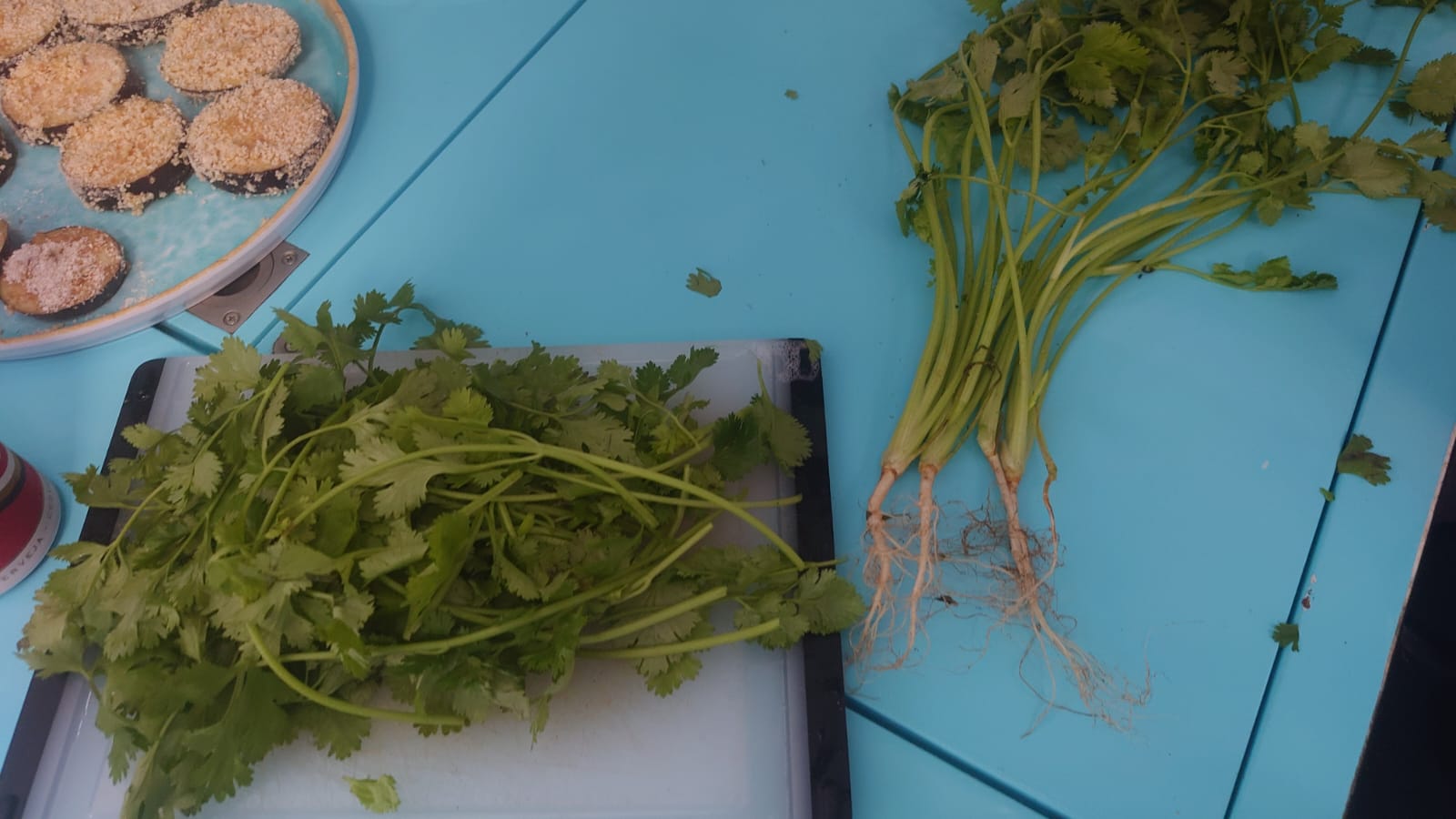 There’s a lovely open fresh market here. Sher buys some delicious Aubergines and very fresh Cilantro. We make our favorite Ottolenghi Parmigiano 😋