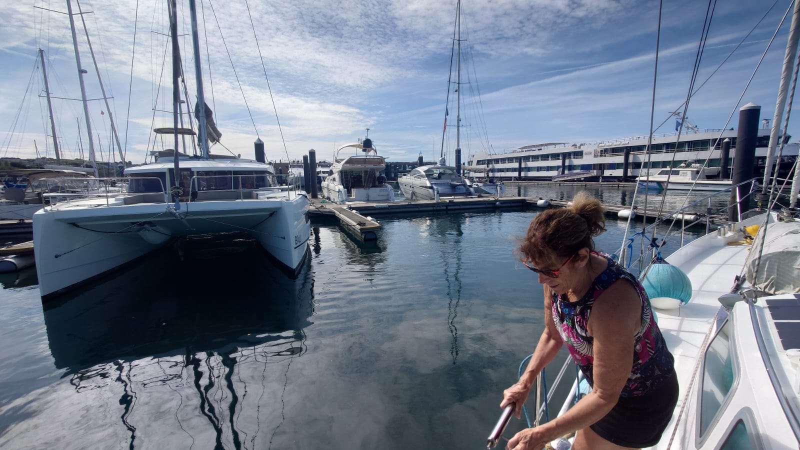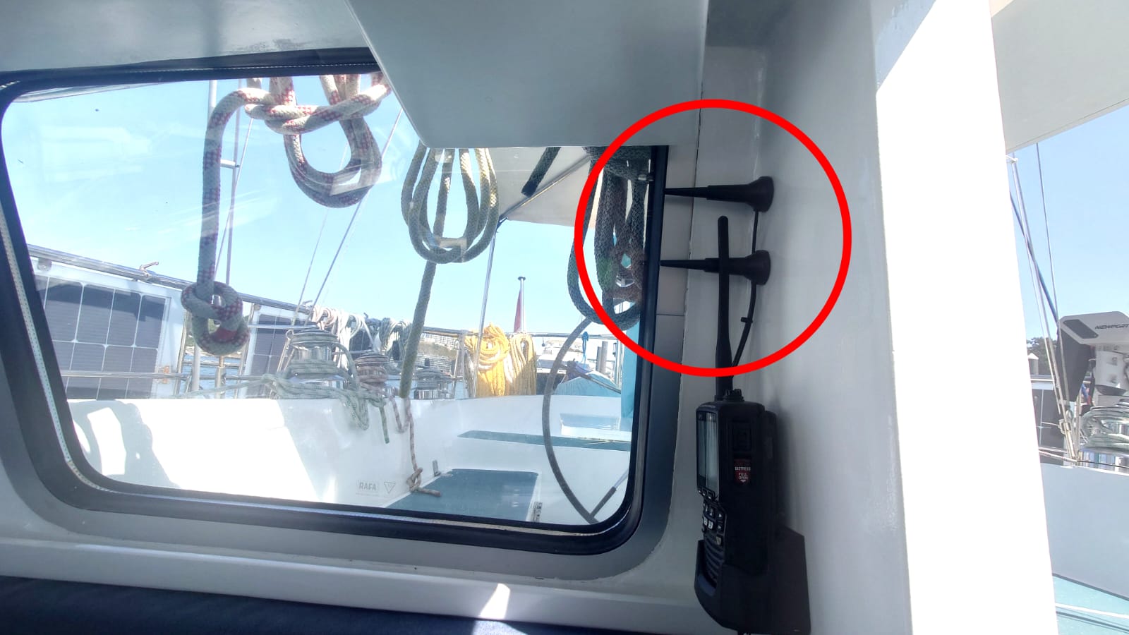While Sher visits a fabric store in the city with Marcia, Wim relocates the WiFi antennas from the router. They were in the lazarette, next to the router. But we had a lousy WiFi reception in the cockpit because the 5GHz signal was shielded too much by the steel. So we had to switch to 2GHz, which suffers less from shielding. But that was a much slower connection. Now, the antennas are next to the window and we have good 5GHz reception everywhere: 300-500 Mbps.