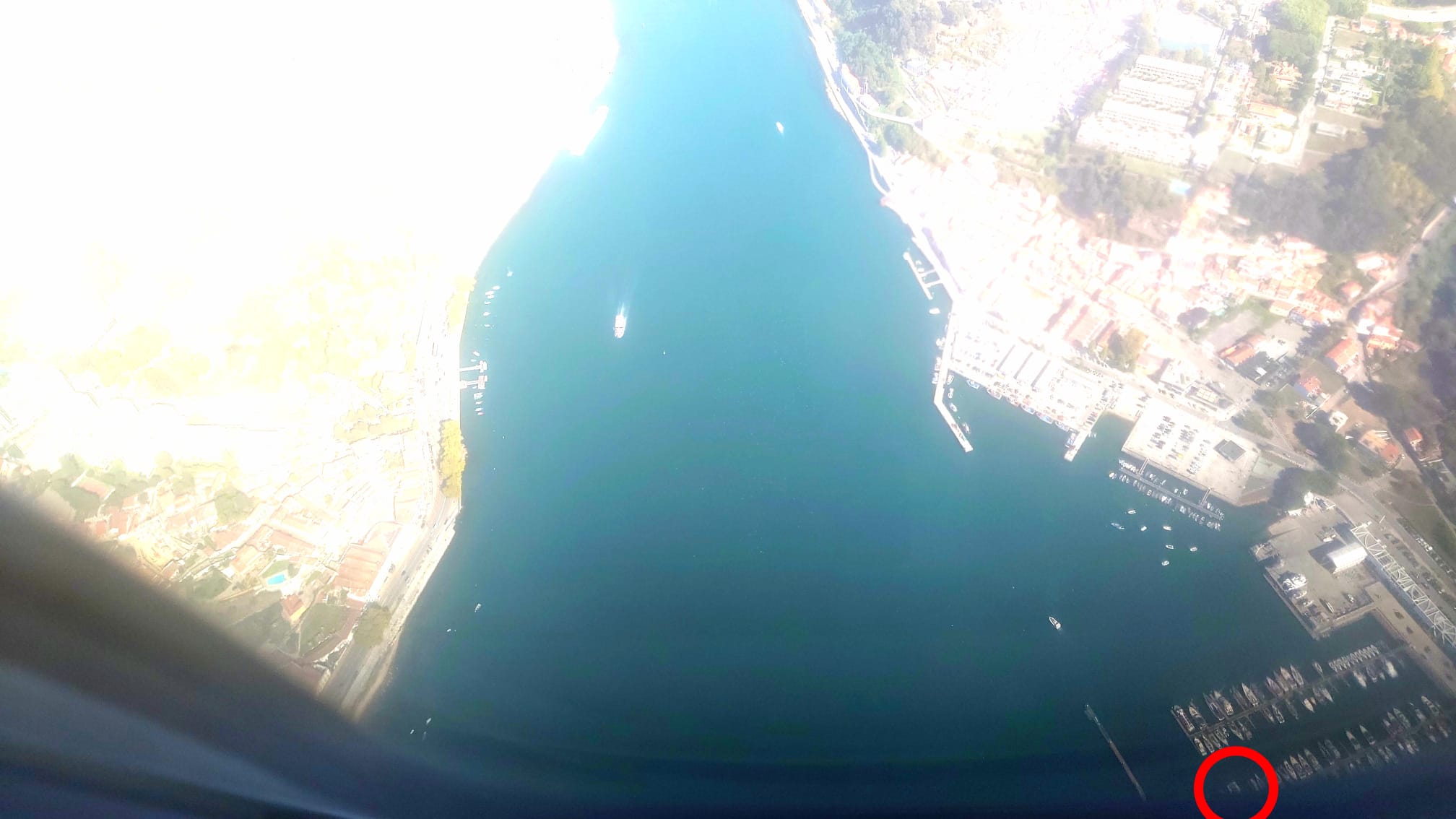 Almost back home! At our descent to Porto airport, we fly over the marina. Dione IV is still there! When you zoom in on this picture, you can see the rear part of her stern in the circle!