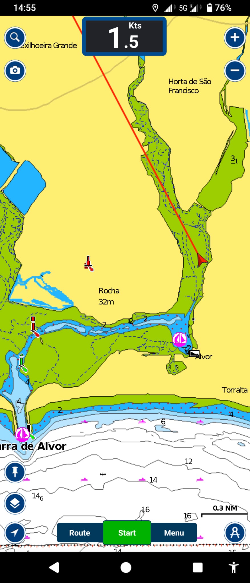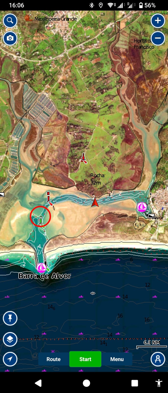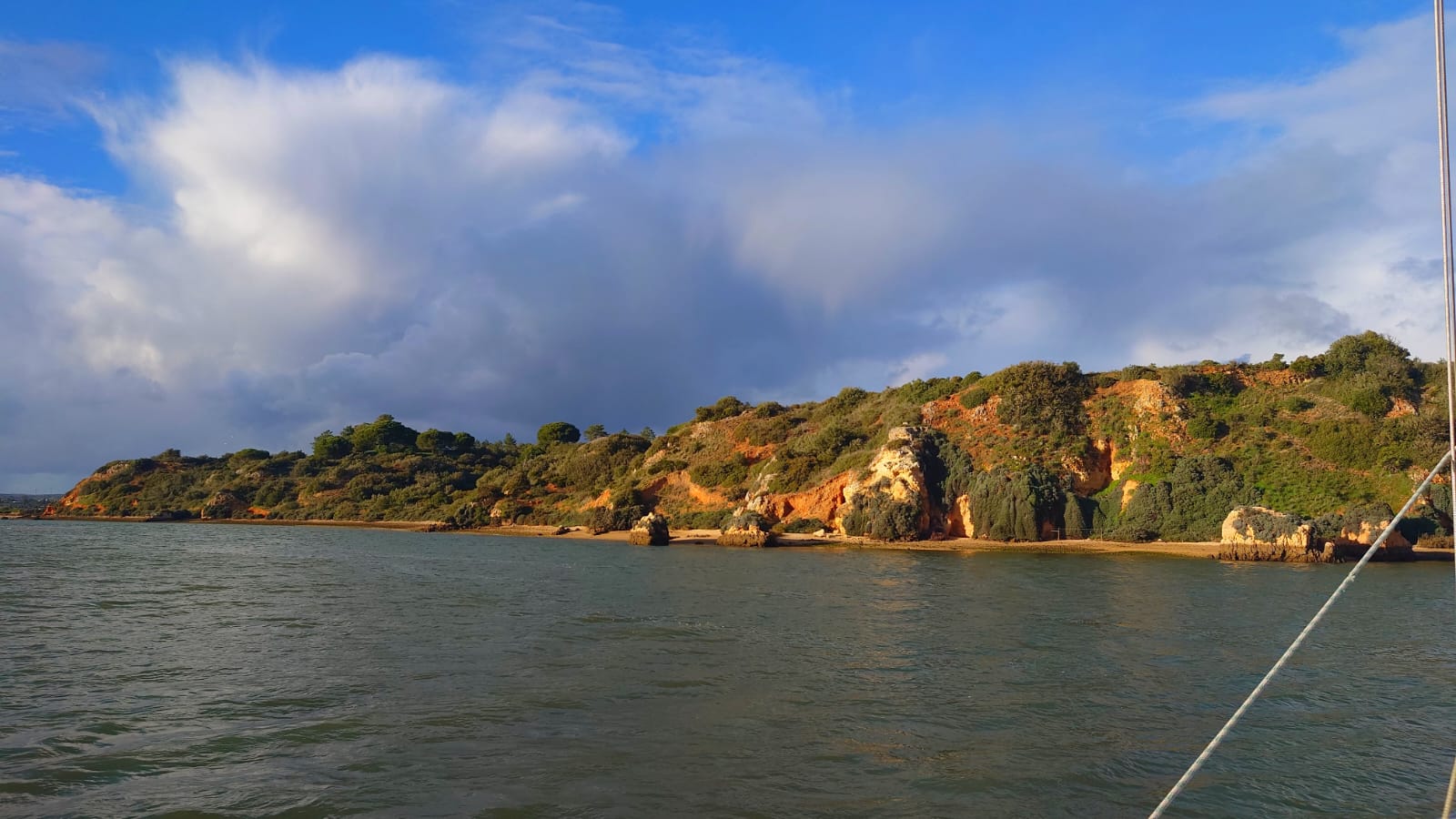 We leave the bay of Portimão at 1430h. There’s no wind so we motor along the coast in westerly direction. At 1530 we enter the breakwaters of Alvor.