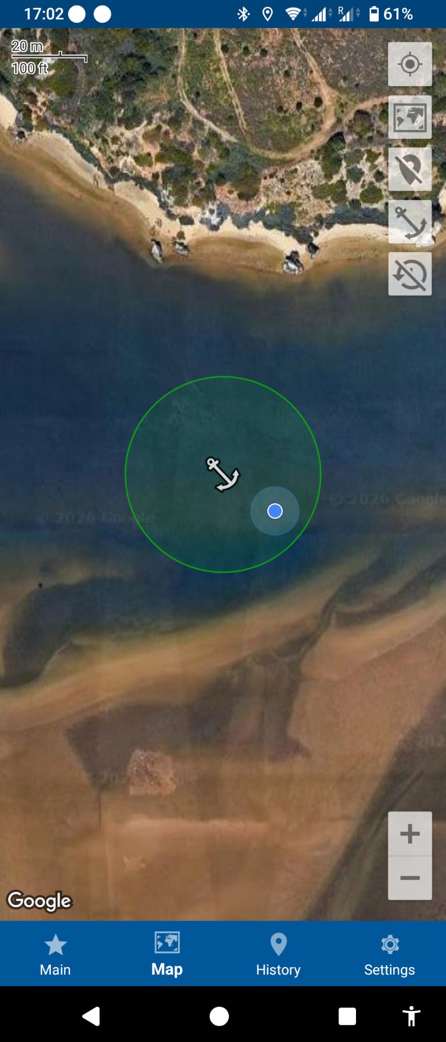 The channel is narrow at low tide. We estimate about 70m wide. So, we drop our anchor in the middle and let out 25m of chain. The depth is about 6m at high tide and 3m at low tide. Like that, we can easily swing around our anchor (the green circle is a 40m radius in our anchor alarm app) and stay at a safe distance from the rocks.