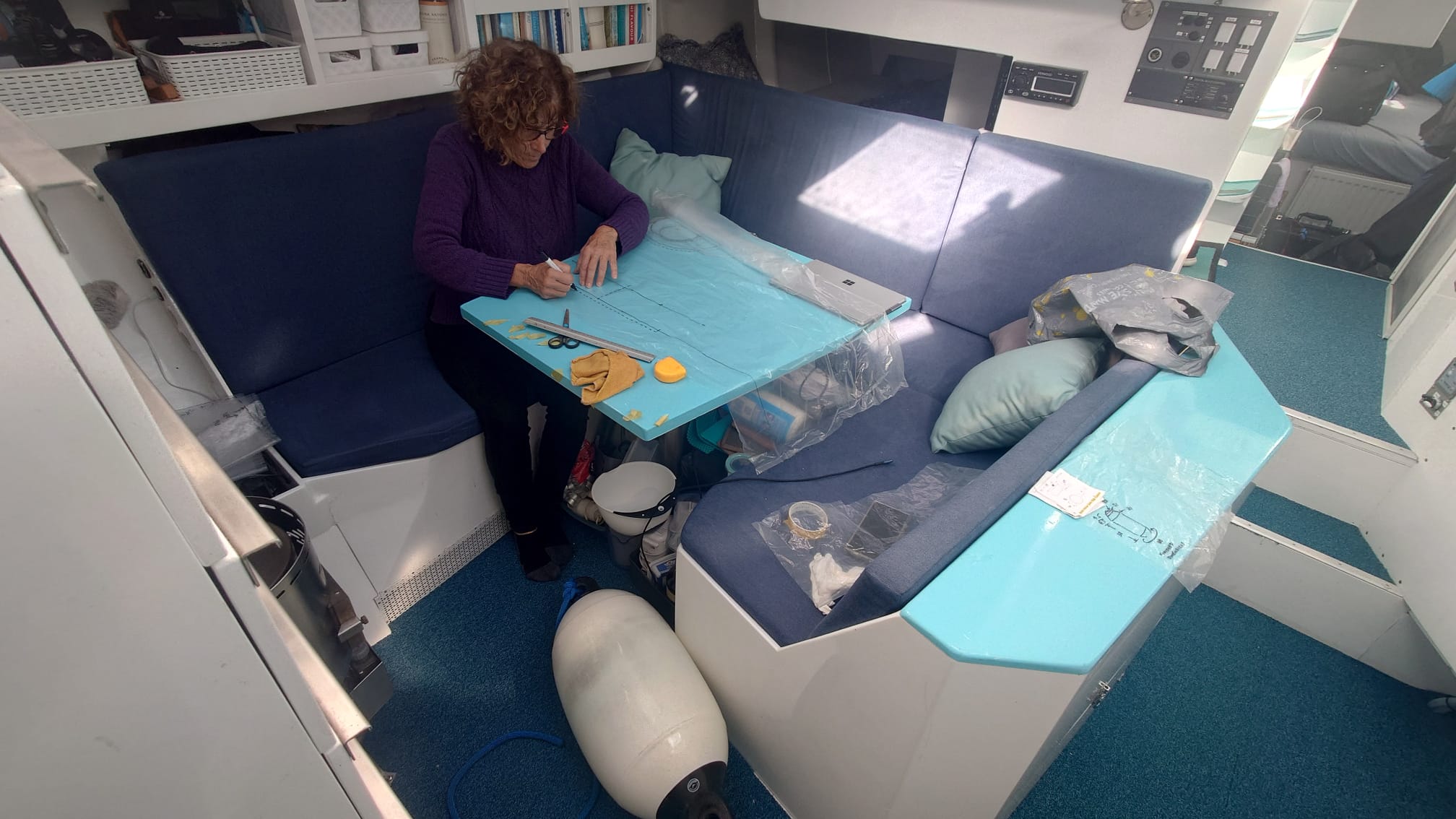 We decide to let the paint cure for an extra day.So, time for another job: Sher has a new idea for the boat fender covers.