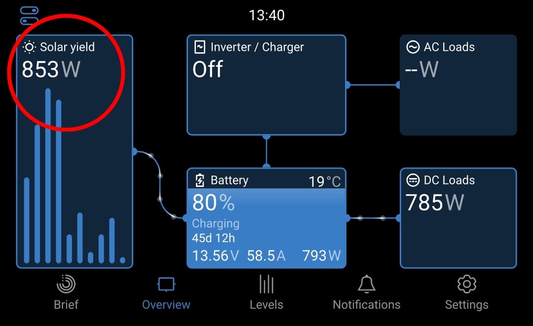 The sunny parts of the day are just enough to keep our batteries at the same level (50-60%), with a little help from the wind generator. Although that’s not much, there’s not much wind.