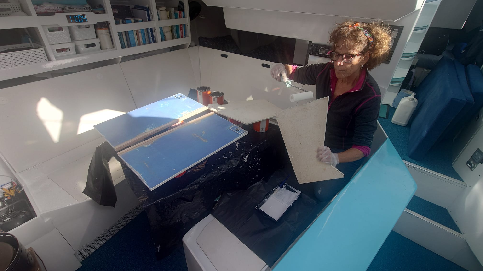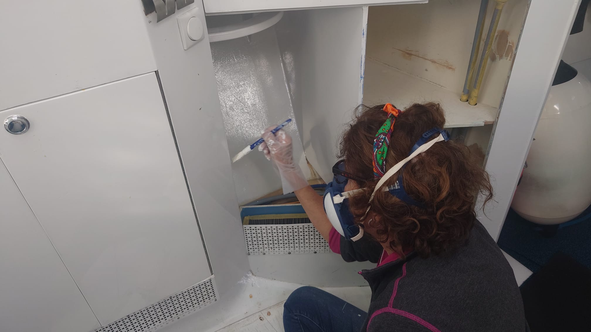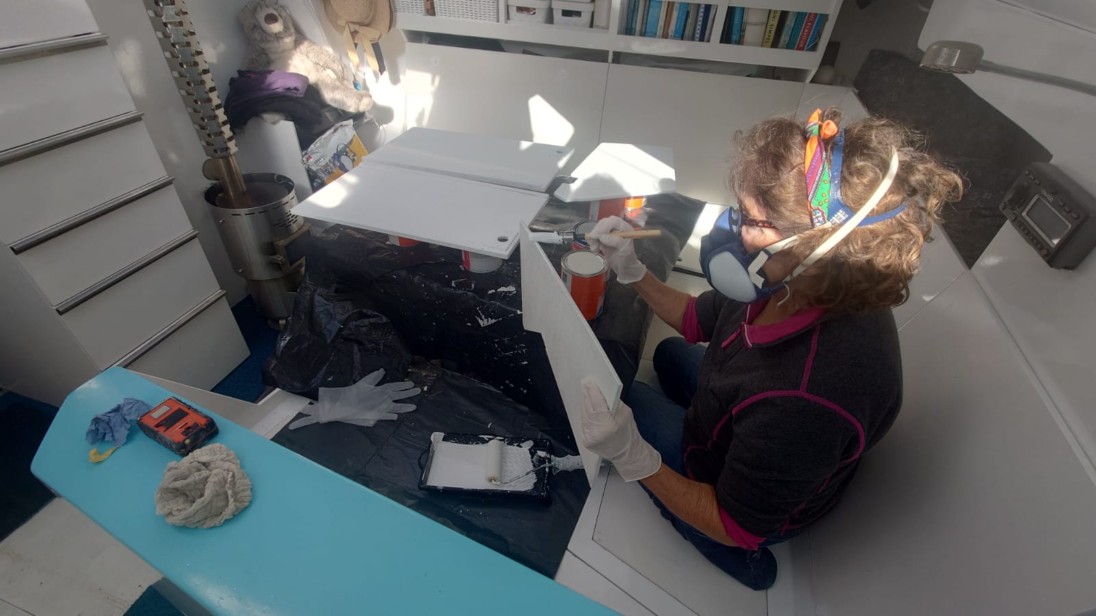 The next project is moving on to the next set of cupboards in the galley. The cupboards have their new stainless steel piano hinges and everything has been filled and sanded. Sher puts her respirator mask on and paints the first layer of primer inside the cupboard and the doors and shelves on top of the table.