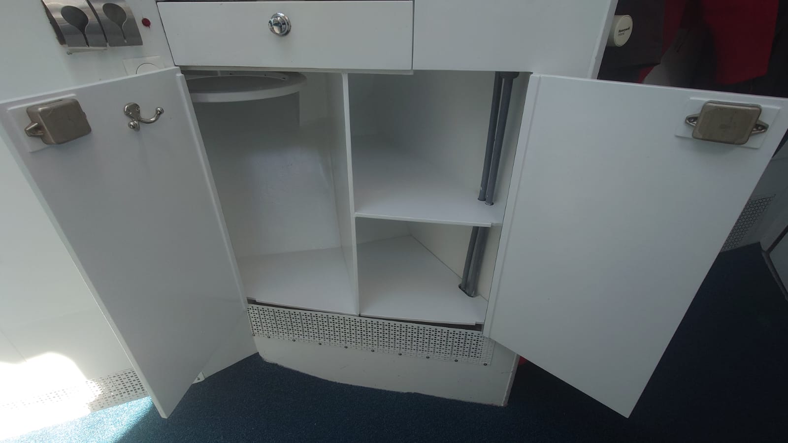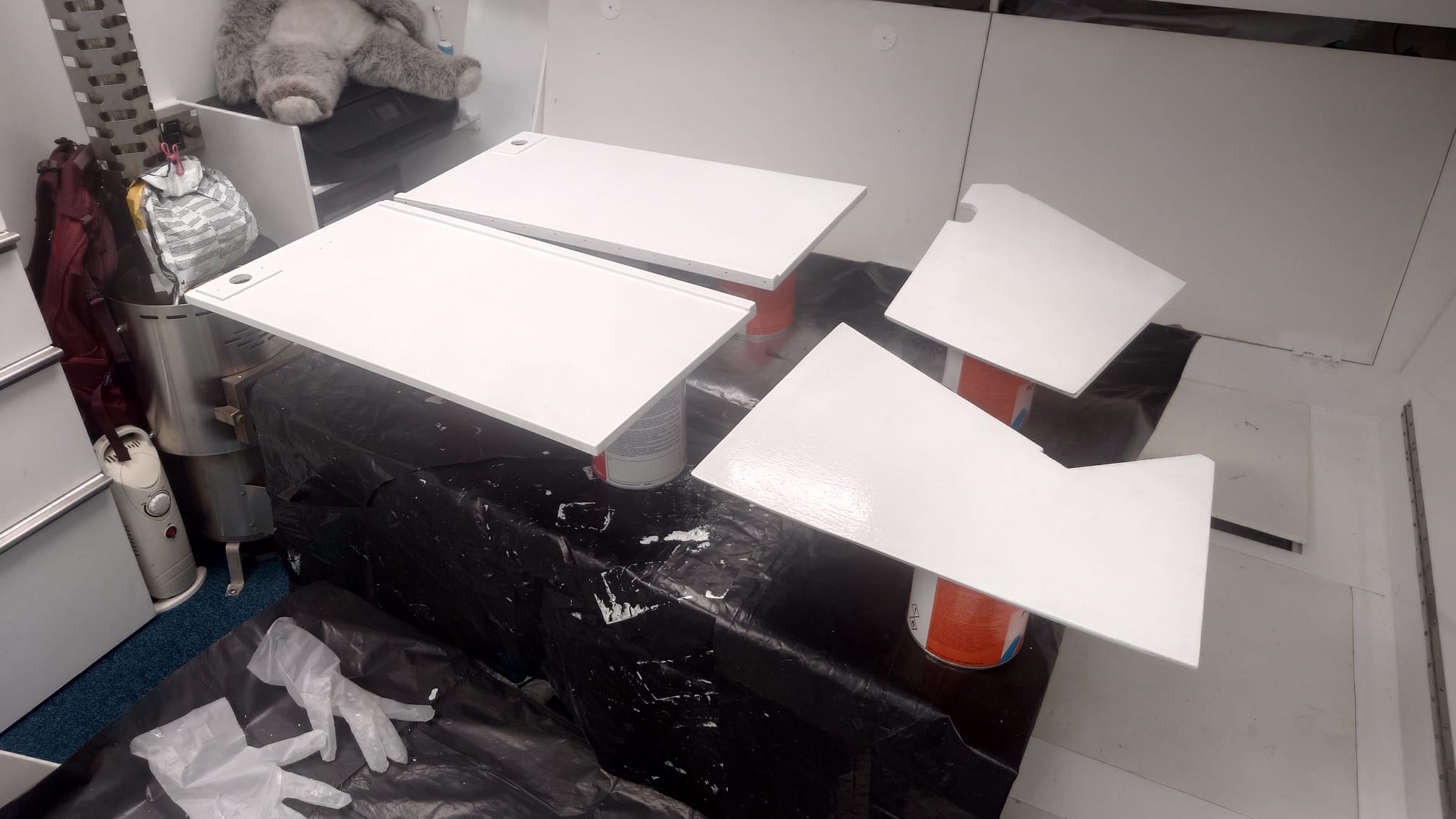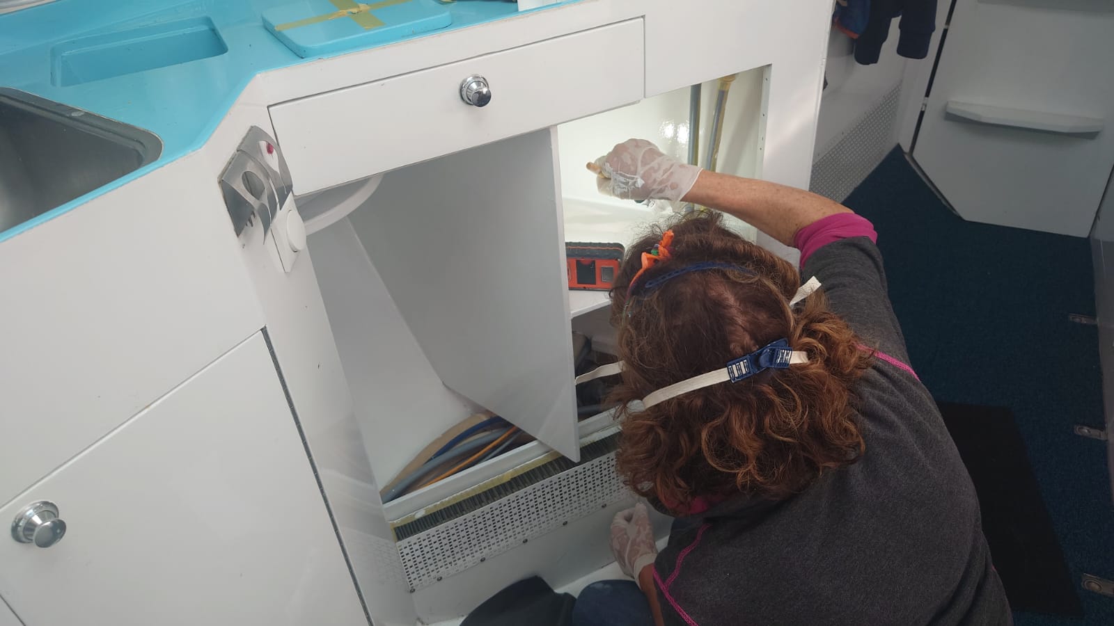 The next project is moving on to the next set of cupboards in the galley. The cupboards have their new stainless steel piano hinges and everything has been filled and sanded. Sher puts her respirator mask on and paints the first layer of primer inside the cupboard and the doors and shelves on top of the table.