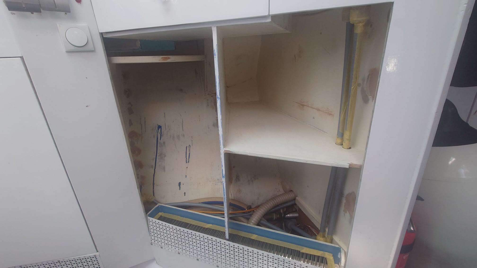 The cupboards have their new stainless steel piano hinges and everything has been filled and sanded.
