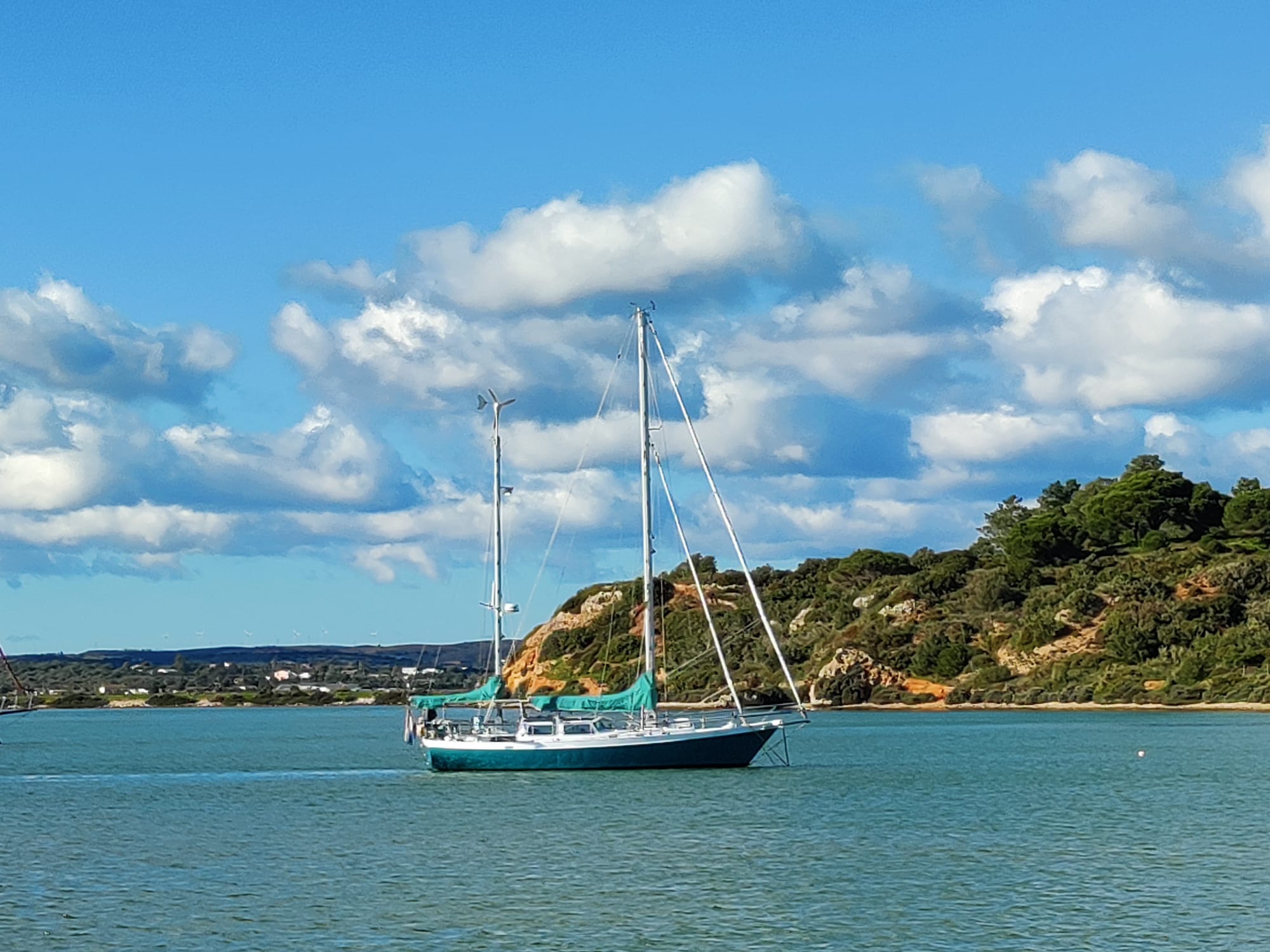 We have some time here in Alvor to work on projects… In Portimão, there’s a Seldén (Seldén is our masts brand) dealer. We ask for a quotation for a whisker pole for our jib. We’re also planning to replace our wind generator for the new one we purchased. For that, we need an adapter flange to mount the new wind generator to the existing base. Wim makes a drawing and sends it to the welder guy (named Rui) who’s going to do the welding work on the through-hull sensor positions. He answers he can make it. 👍🏻 In the meantime, Sher has made a new and improved design and pattern for boat fender pajamas (covers).