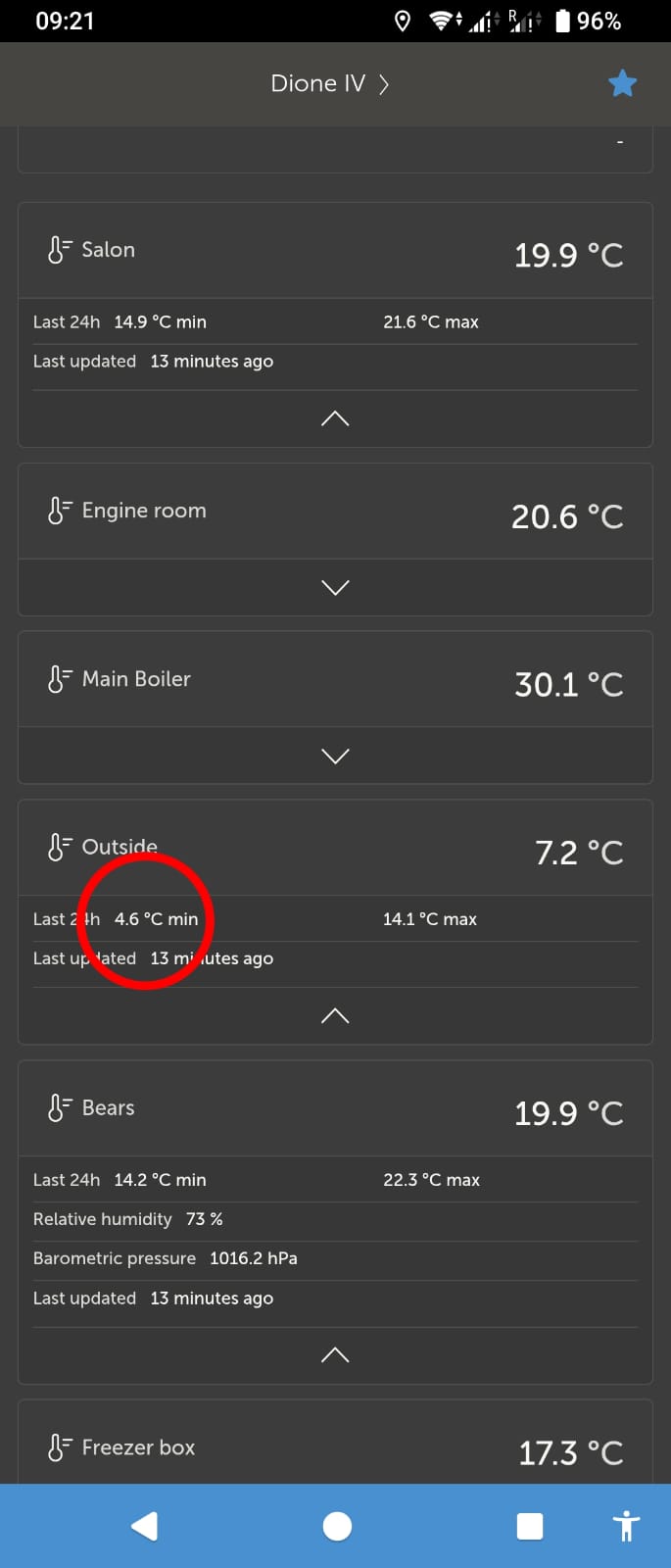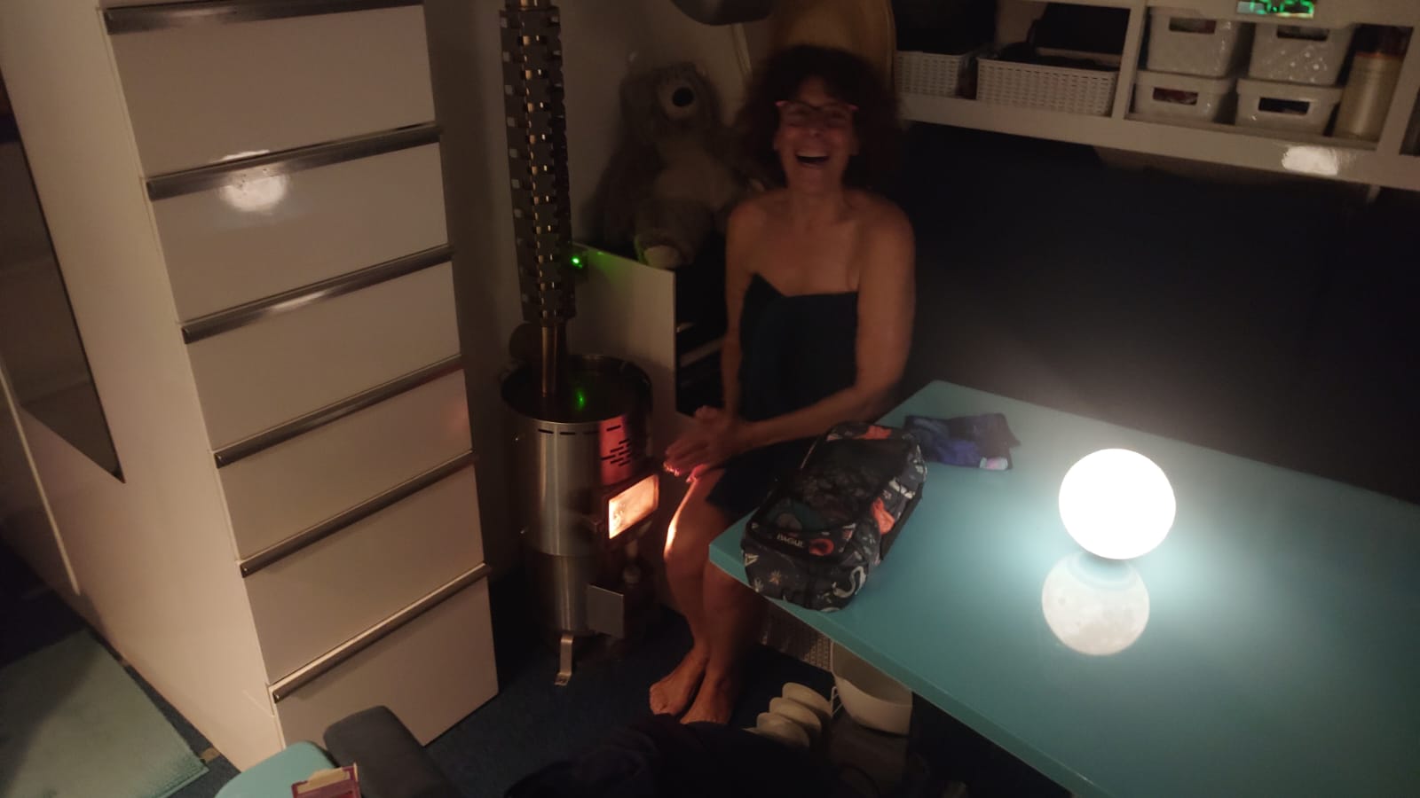 The weather turns rainy and the temperature drops down to 14ºC. Inside is 18ºC and the humidity is somewhat high (70%) so we feel a bit chilly. We decide to light our Dickinson heater. After it has burned an hour, the temperature is nice and comfy. 😊