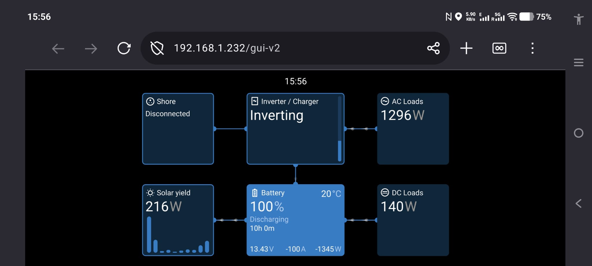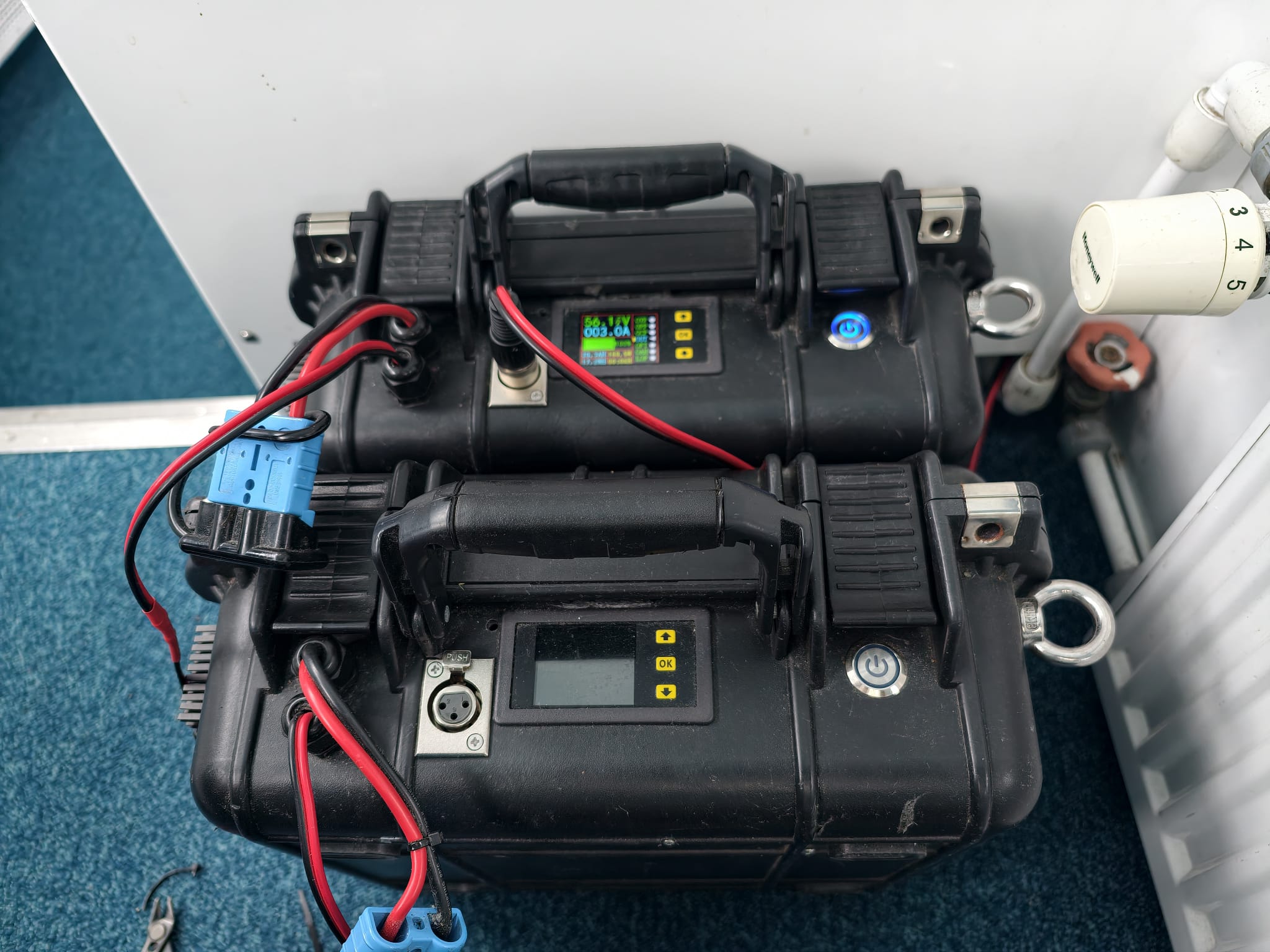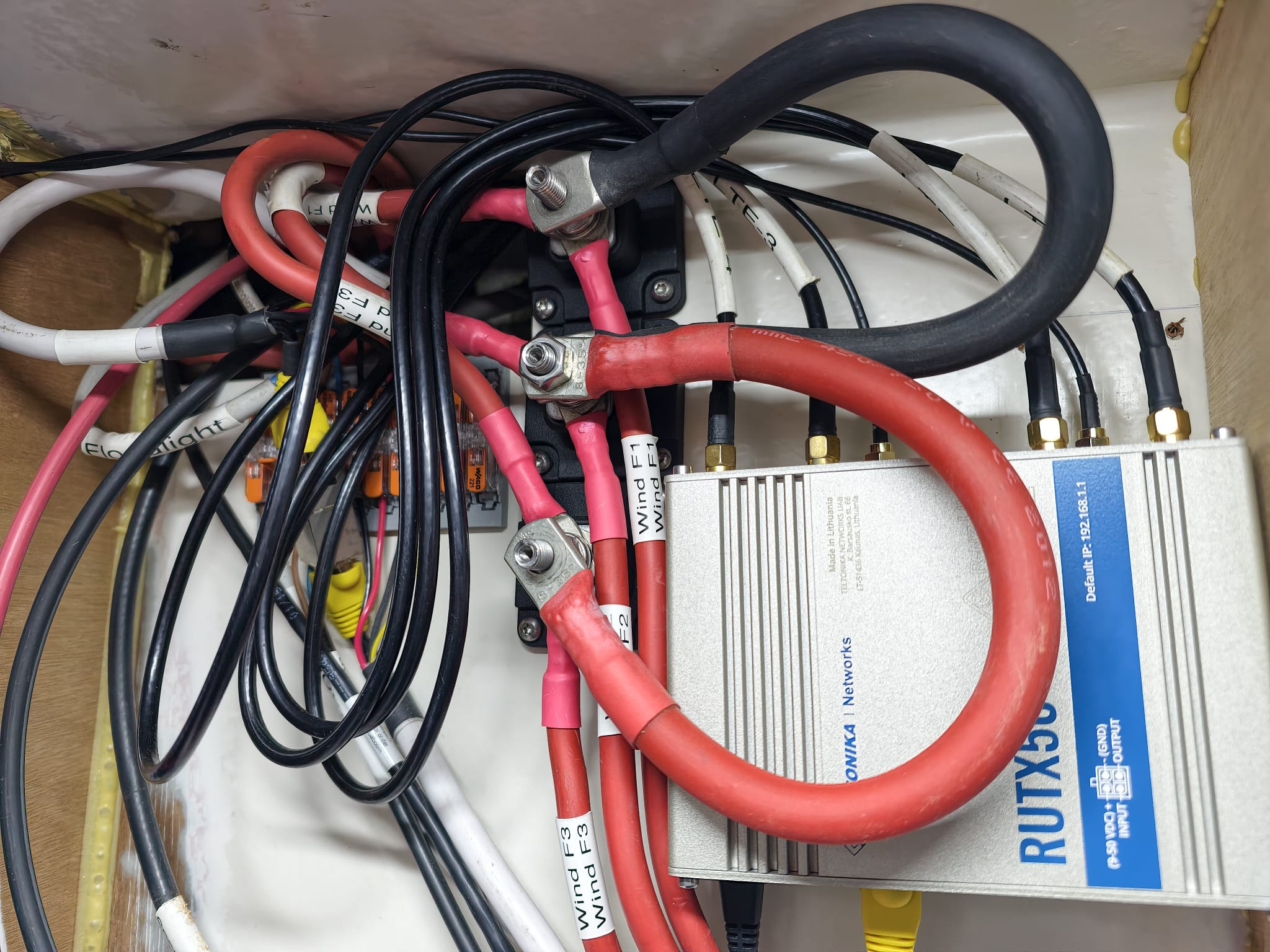 While pulling a cable along the MG battery bank, the MG Master LV BMS switches off it’s main contactor and we are without 12v power. We get an error message: “No communication with the batteries”. Hm. Wim checks the CANbus cables and sees one that has been kinked but not damaged or a loose RJ45 connector or such. He clears the kink and reboots the MG Master LV. The error is gone and we have all power back online. Strange…🤔