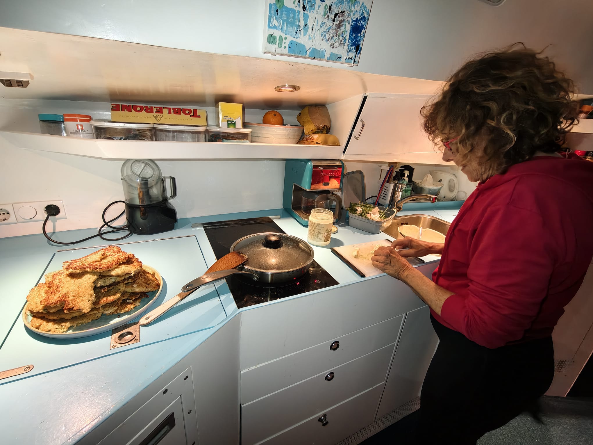 We settle in and cook one of our favorite meals: Quinoa “cookies” (pancakes) with spinach.