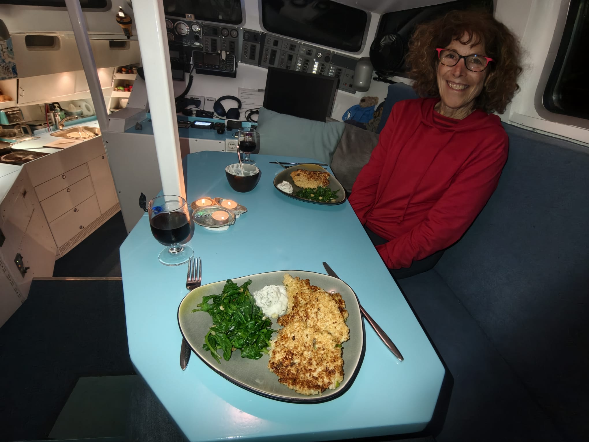 We enjoy the relaxed day. It’s partially sunny and the wind picks up to 25 knots. We let the new wind generator run and it yields 300W at 20 knots of wind and 500W at 25 knots. At 1600h, the battery bank is full but there’s still sun and wind. So we turn the big boiler on to use some energy.