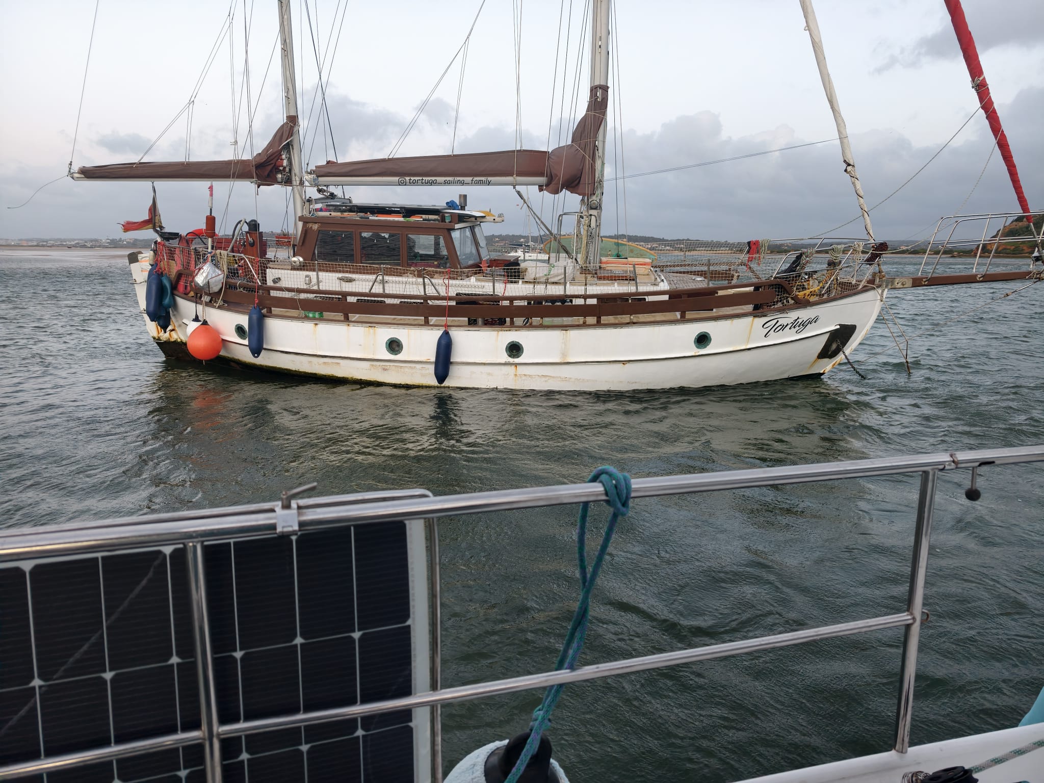 She’s not strong enough to keep us clear and the Tortuga is scratching our railing while the anchor winch pulls us forward. We change places: Wim pushing at full force and Sher operating the anchor winch. Slowly we move forward, sometimes touching. When we’re almost clear, Wim pushes the big bowsprit away and he shouts to Sher: Keep going! Keep pulling! The wind pushes the Tortuga heavily against us and touches a solar panel on the railing. Luckily just a scratch. One last big push while the anchor winch pulls us forward and with a vigorous force the Tortuga swings behind our stern! Missing us by only a few centimeters with her huge bowsprit! 🫡