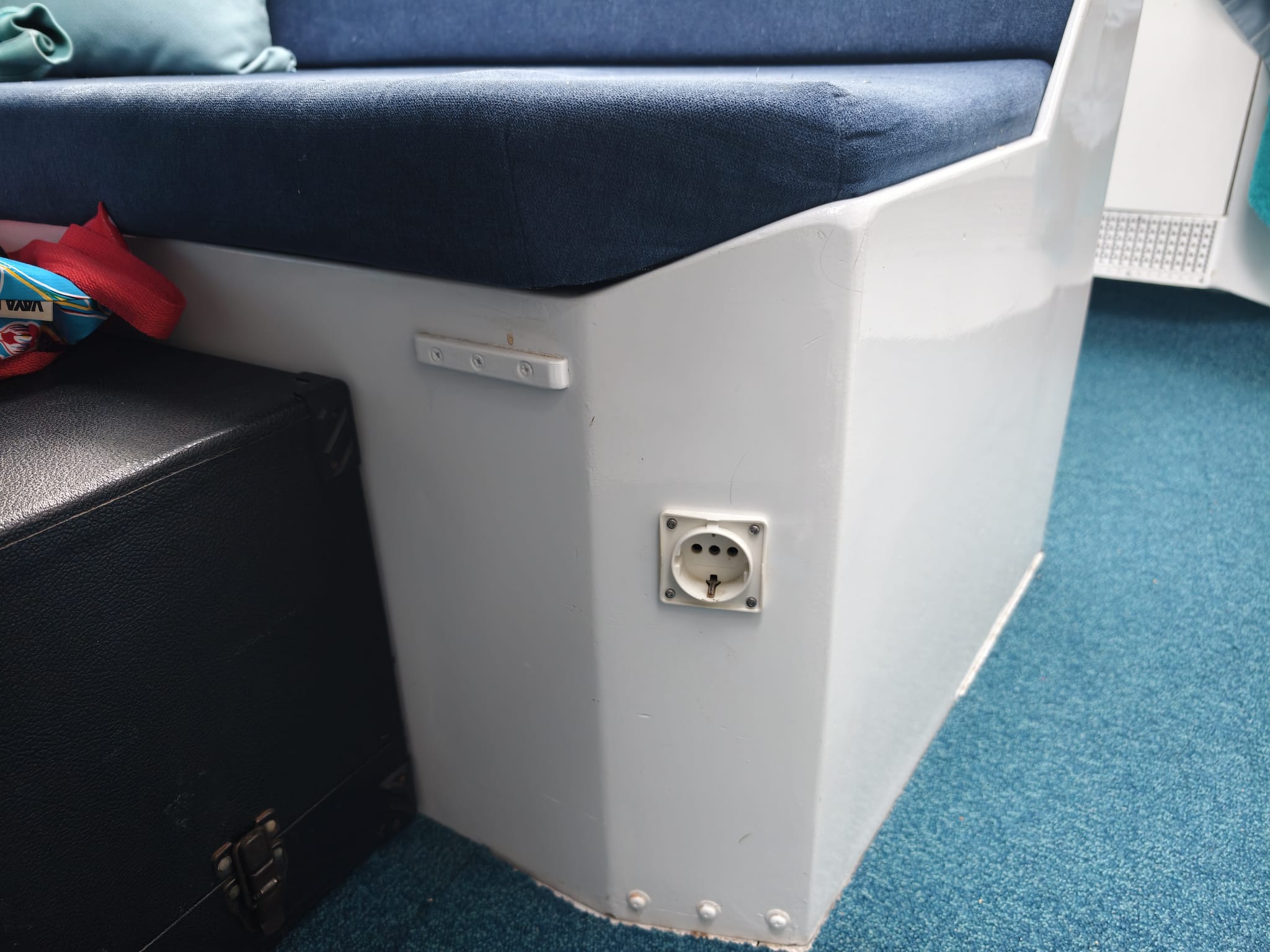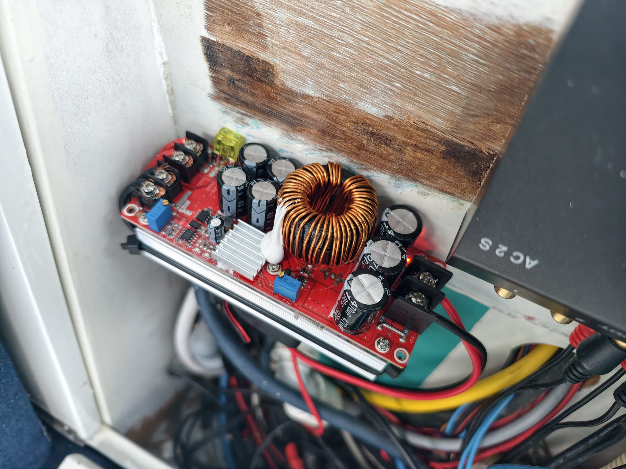While Wim is continuing to work on the battery-pack charger. These batteries have a 230v charger but having the inverter on at an anchorage just for charging a battery pack is inefficient. Wim had a better idea: charging with a DC-DC converter, from our 12v service battery bank. We bought this DC-DC converter on Amazon, a while ago. It can handle 1500W (well, that is 1500 Chinese watts 😅) and will be set to convert 13v from our board net to 58v for the battery packs. It goes into a place behind the couch, after Wim has cut away an obsolete wooden box that was used for a HDD in the past.