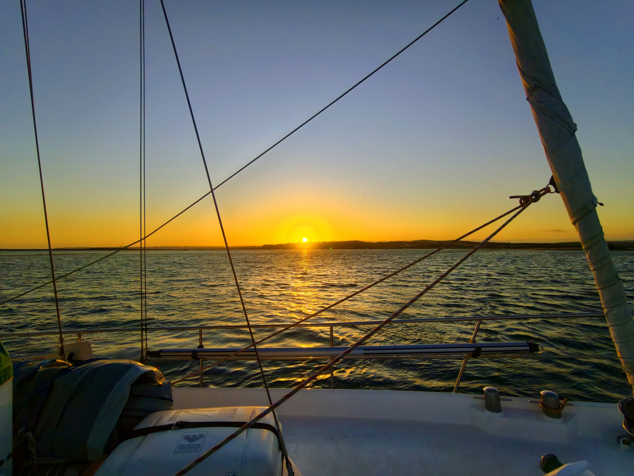 Once we are at sea, the sun rises. There’s no wind.