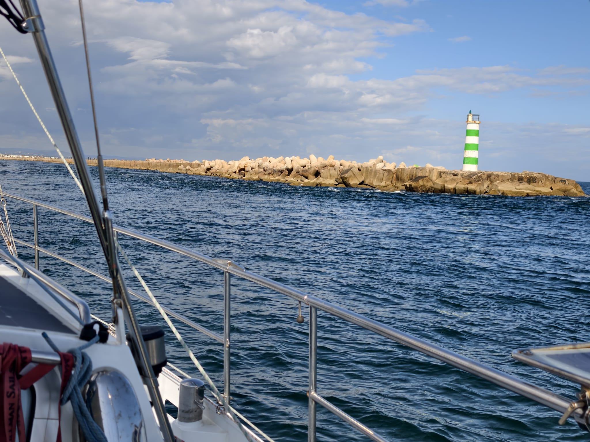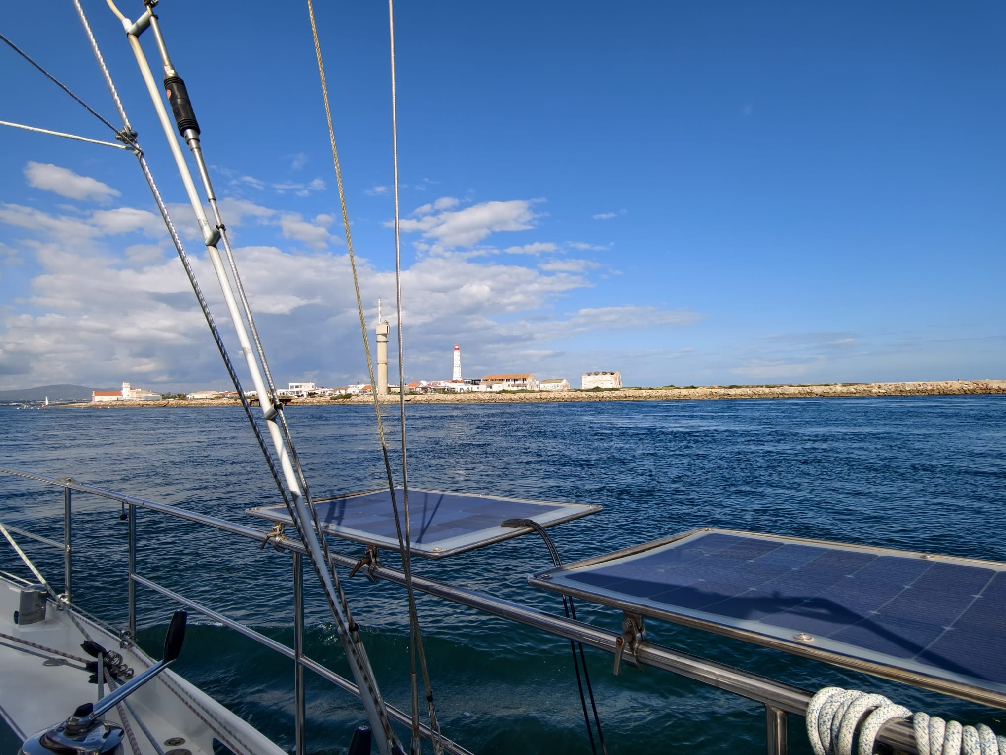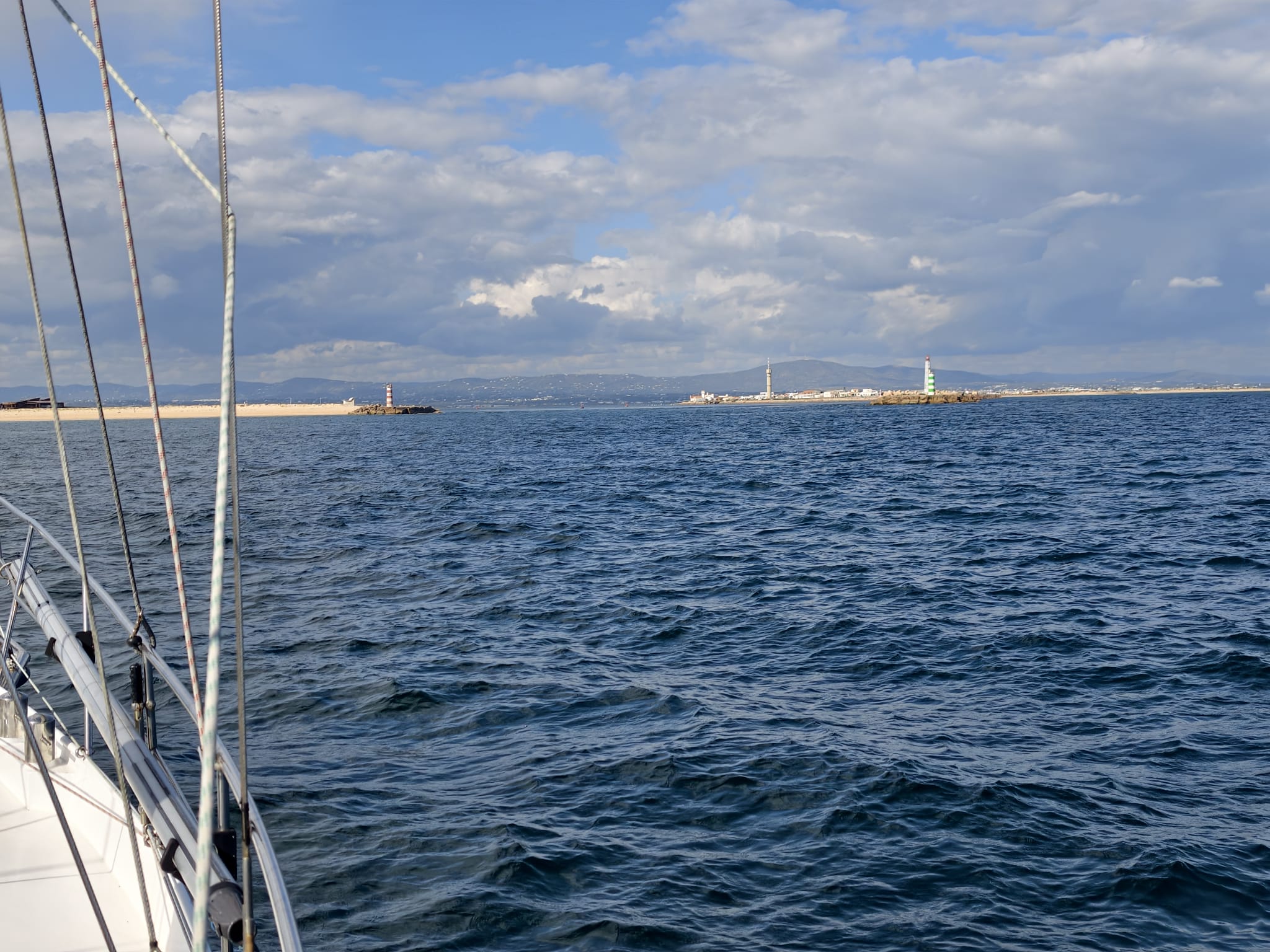 After a wind shift from the north to the south and a few hours with no wind in between, we get to the entrance of the Faro estuary at 1515h.