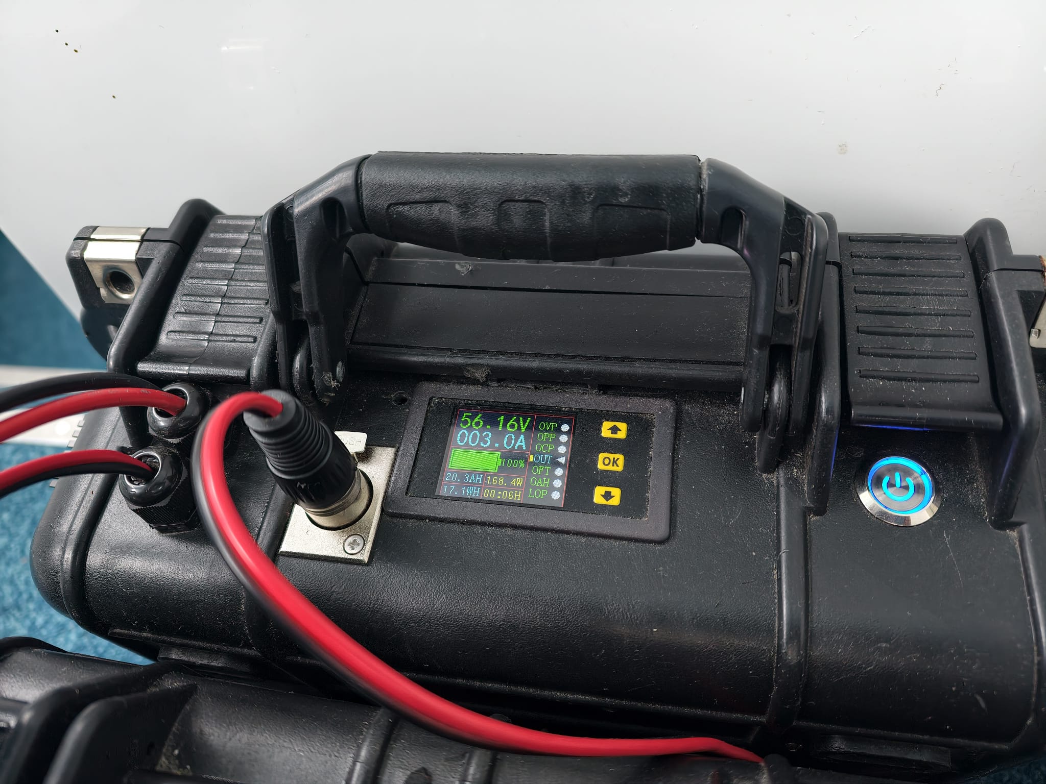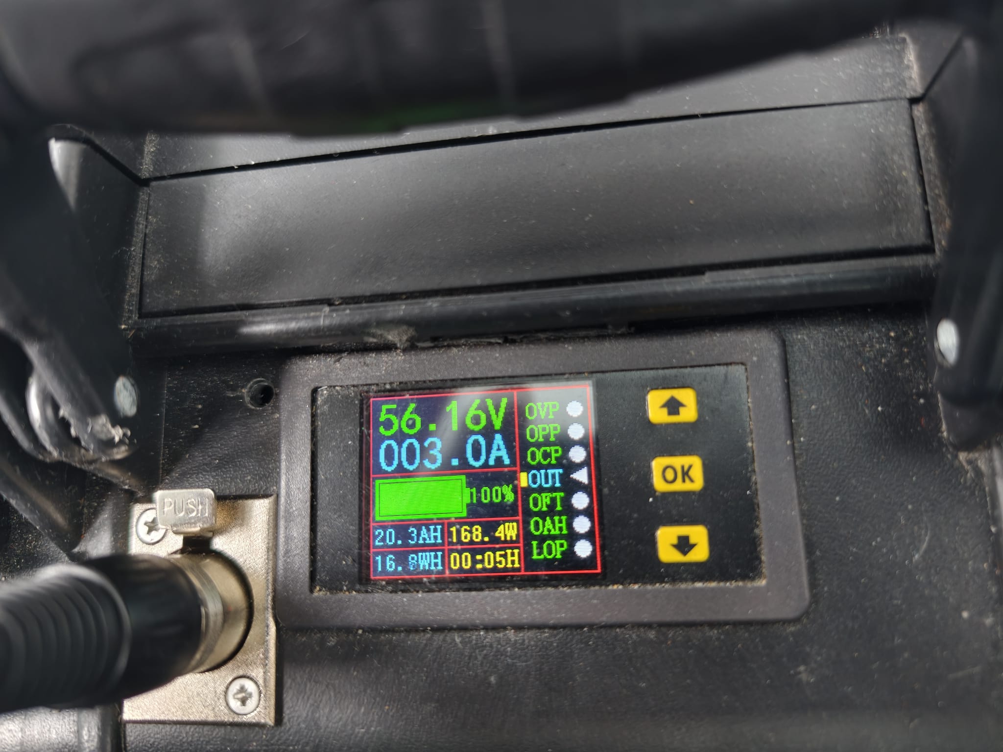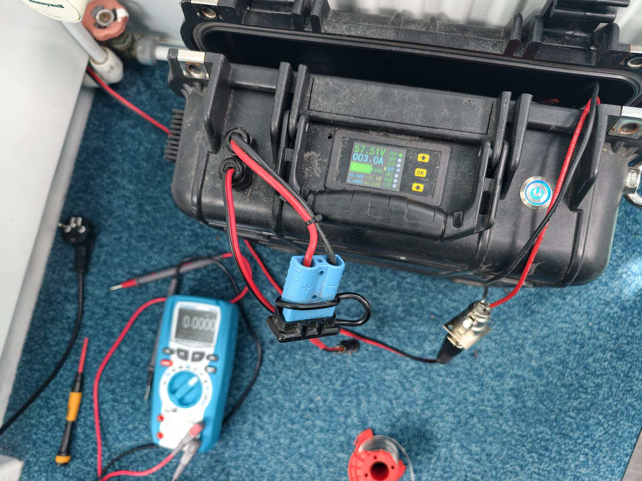 While Wim is continuing the battery pack charger. Setting the output current of the DC-DC converter at 3A at 58,1v corresponds with 15A at the input (13,5v). So, about 200 watts. The heat sink of the converter gets pretty warm and the little fan turns on and off. So, we shouldn’t any higher and this is perfectly okay to charge the battery packs. The factory supplied charger does 3A, too. But this is what we mean by 1500 Chinese Watts… 200 is a safe value… Maybe 300, with the fan contentiously running 😅