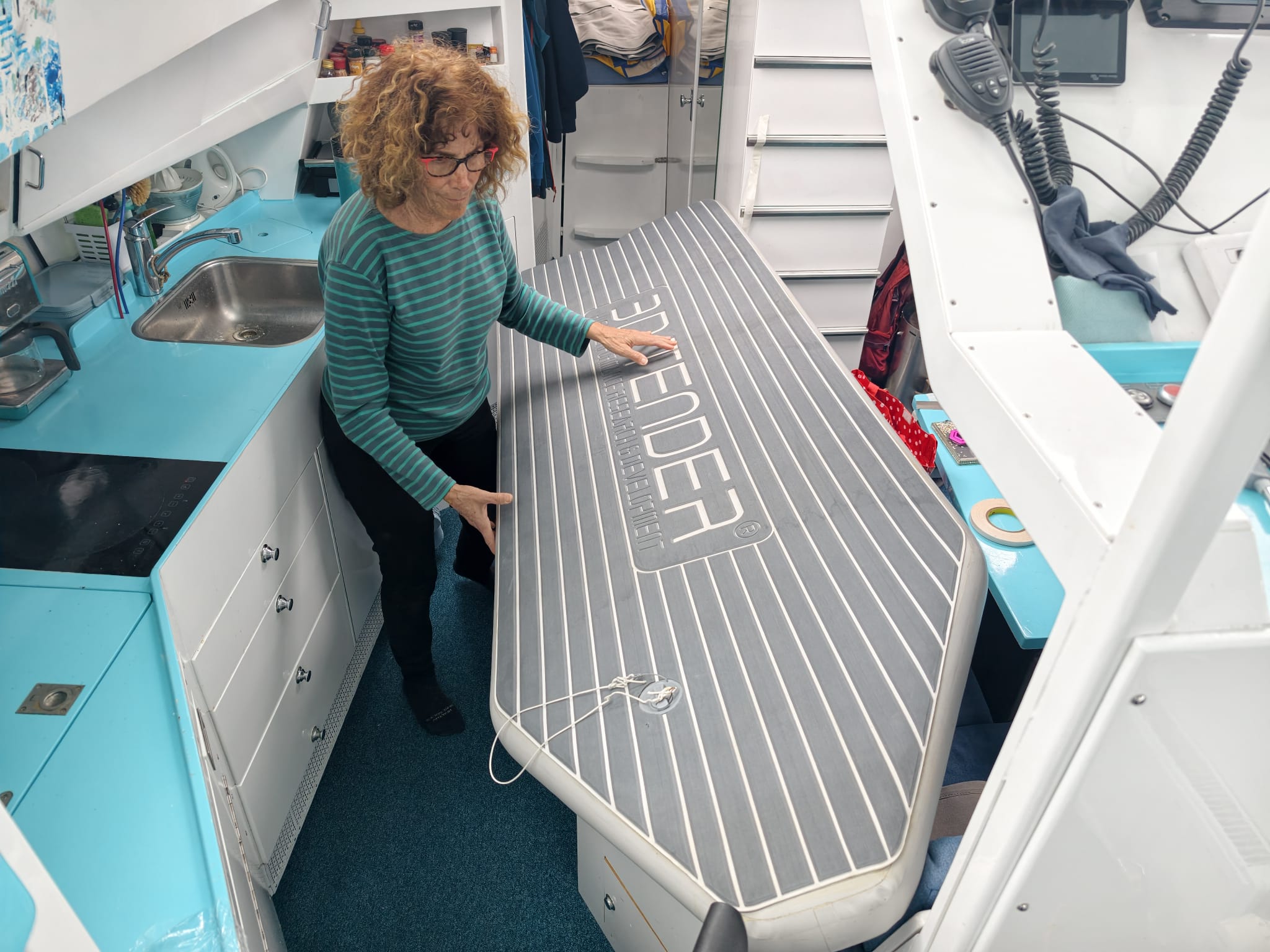 Meanwhile, Sher continues the dinghy floor cover project…