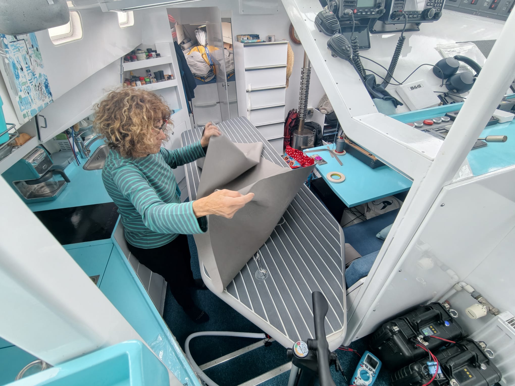 All day, Sher works on the dinghy floor cover.