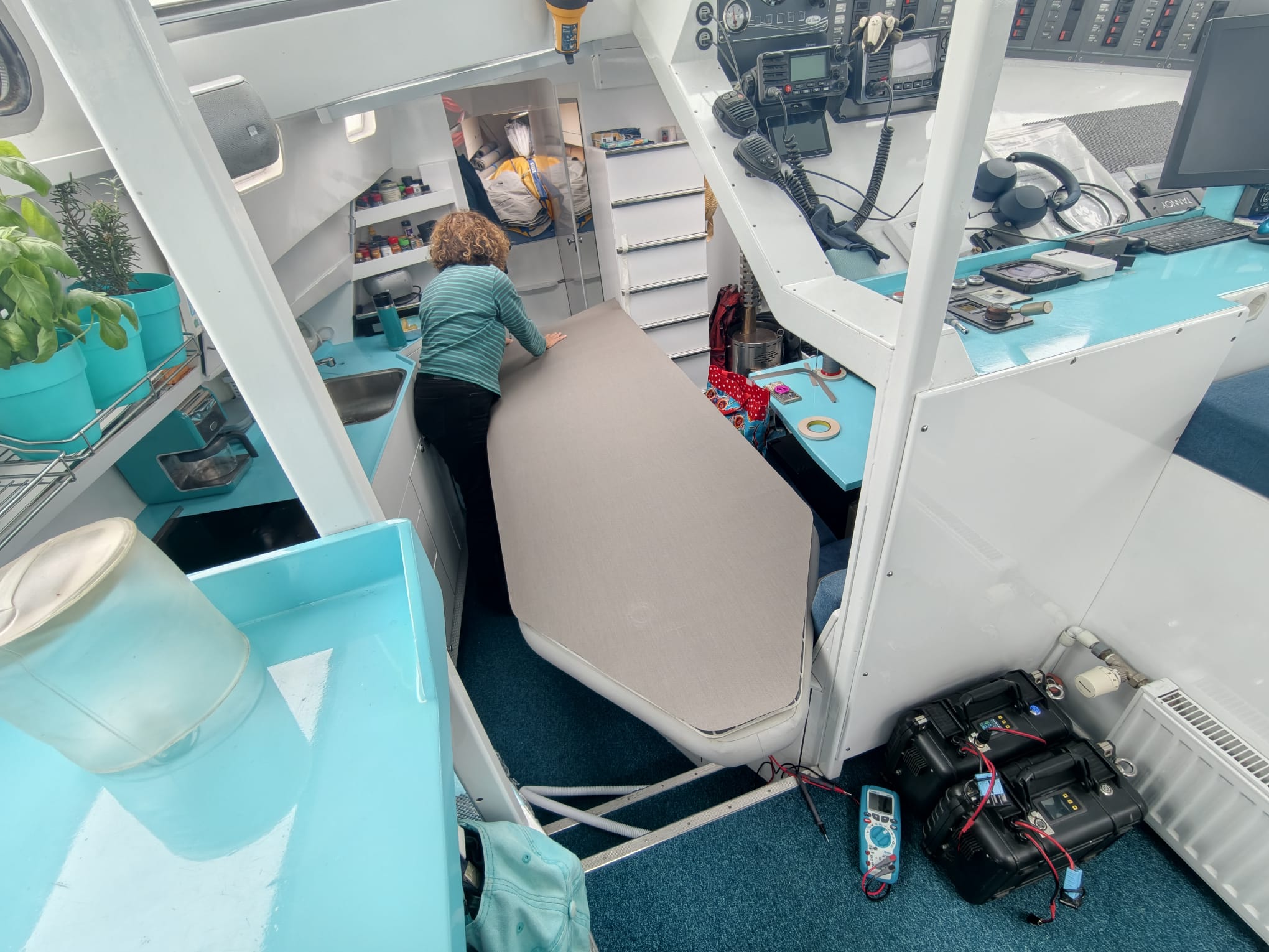 While Sher continues her sewing the dinghy floor cover, Wim realizes a little project that had been on the list for some time: a charger for the battery packs (for the dinghy motor and scooters). These batteries have a 230v charger but having the inverter on at an anchorage just for charging a battery pack is inefficient. Wim had a better idea: charging with a DC-DC converter, from our 12v service battery bank. We bought this DC-DC converter on Amazon, a while ago. It can handle 1500W (well, that is 1500 Chinese watts 😅) and will be set to convert 13v from our board net to 58v for the battery packs. It goes into a place behind the couch, after Wim has cut away an obsolete wooden box that was used for a HDD in the past.