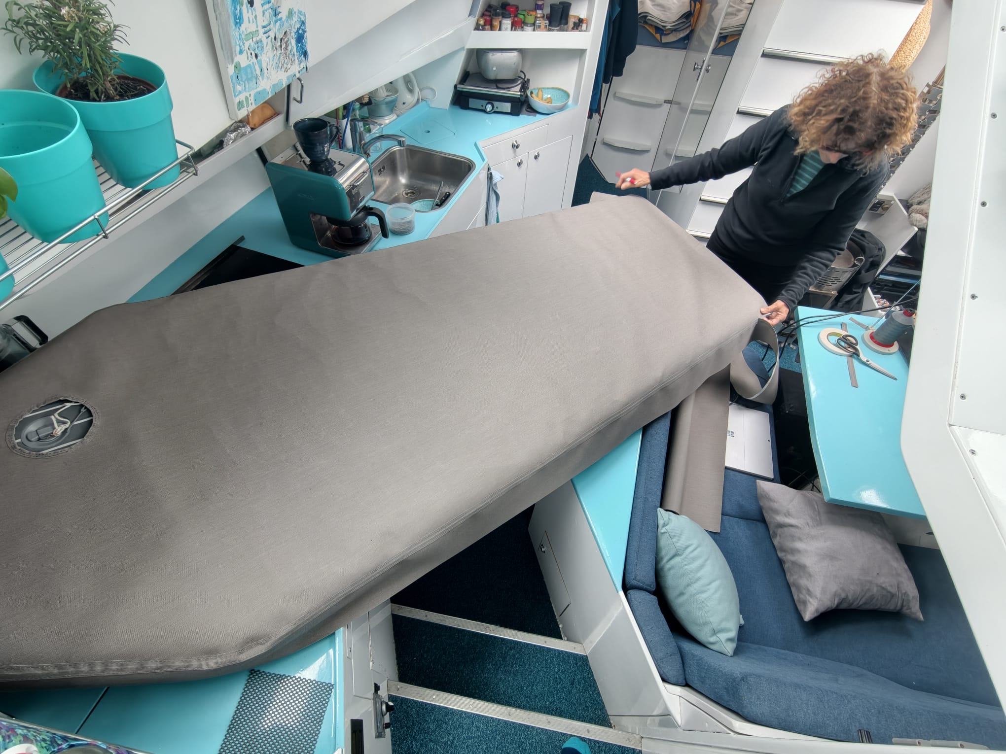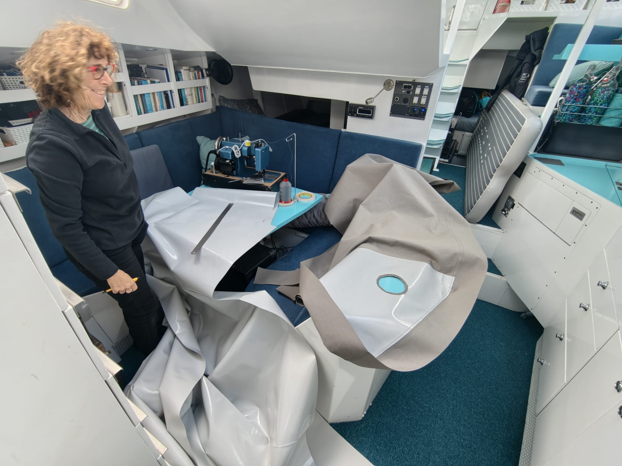 All day, she works on the dinghy floor cover.
