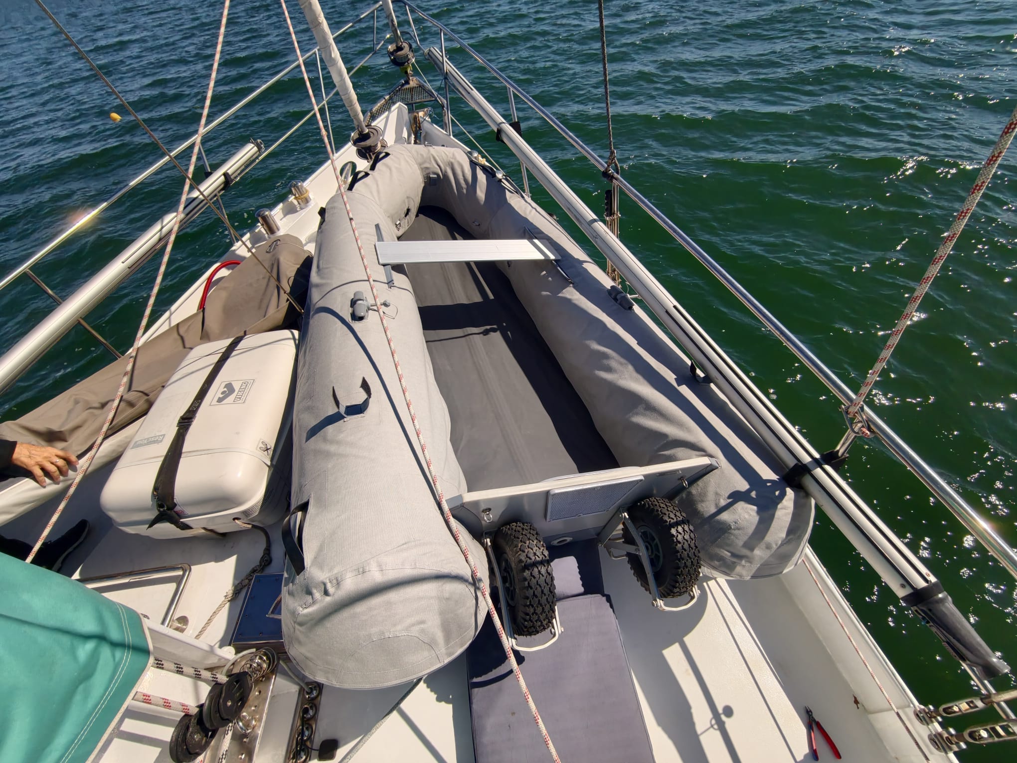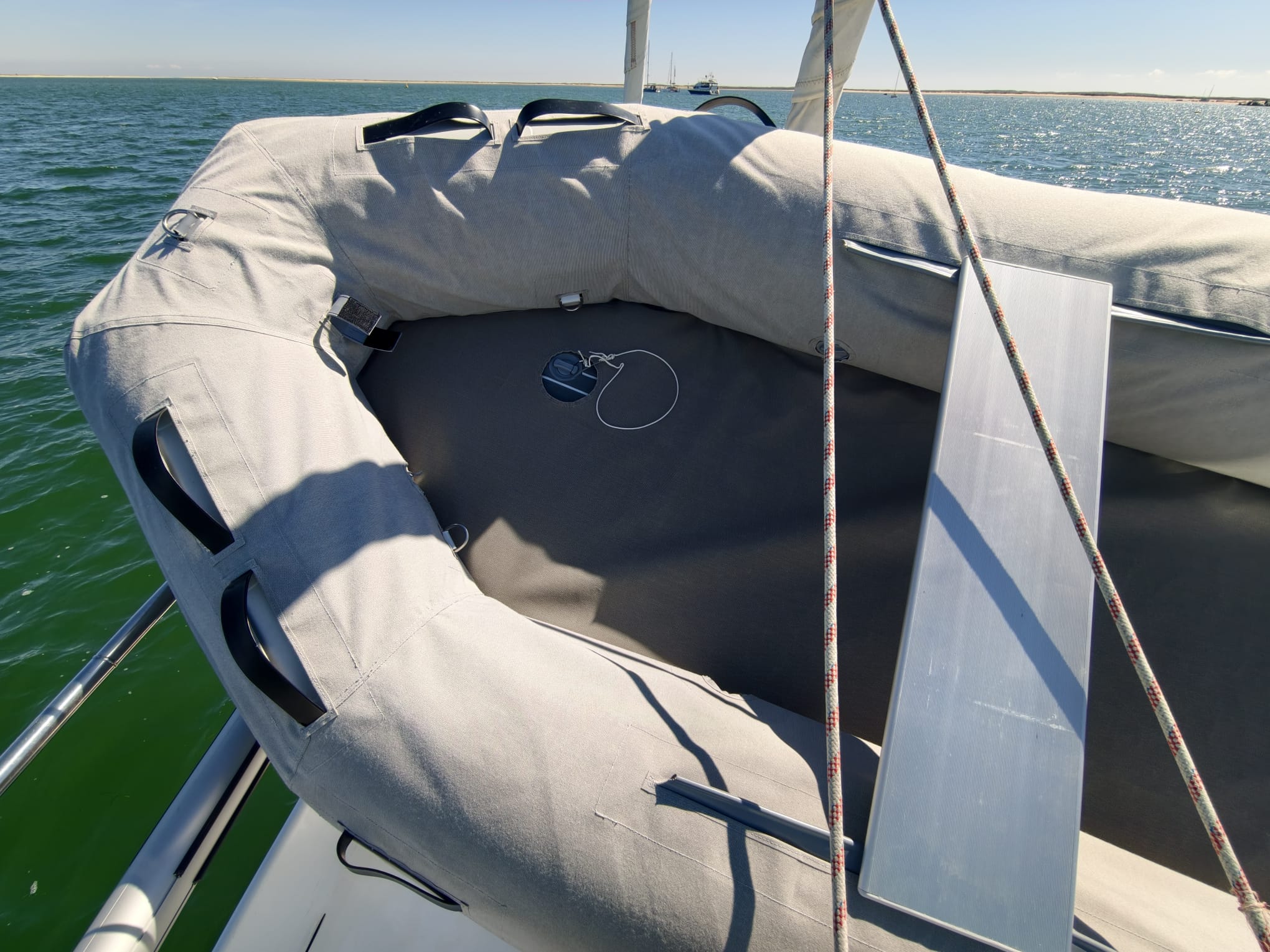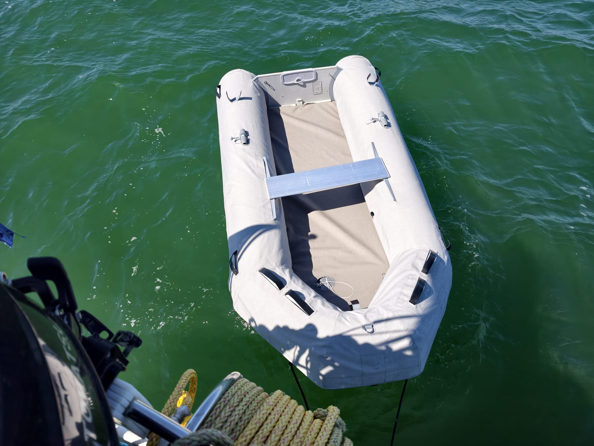 Then we put the deflated floor in the dinghy and pump it to pressure. The floor holds the tube covers nicely in place on the inside. Dinghy fully dressed! 🤩