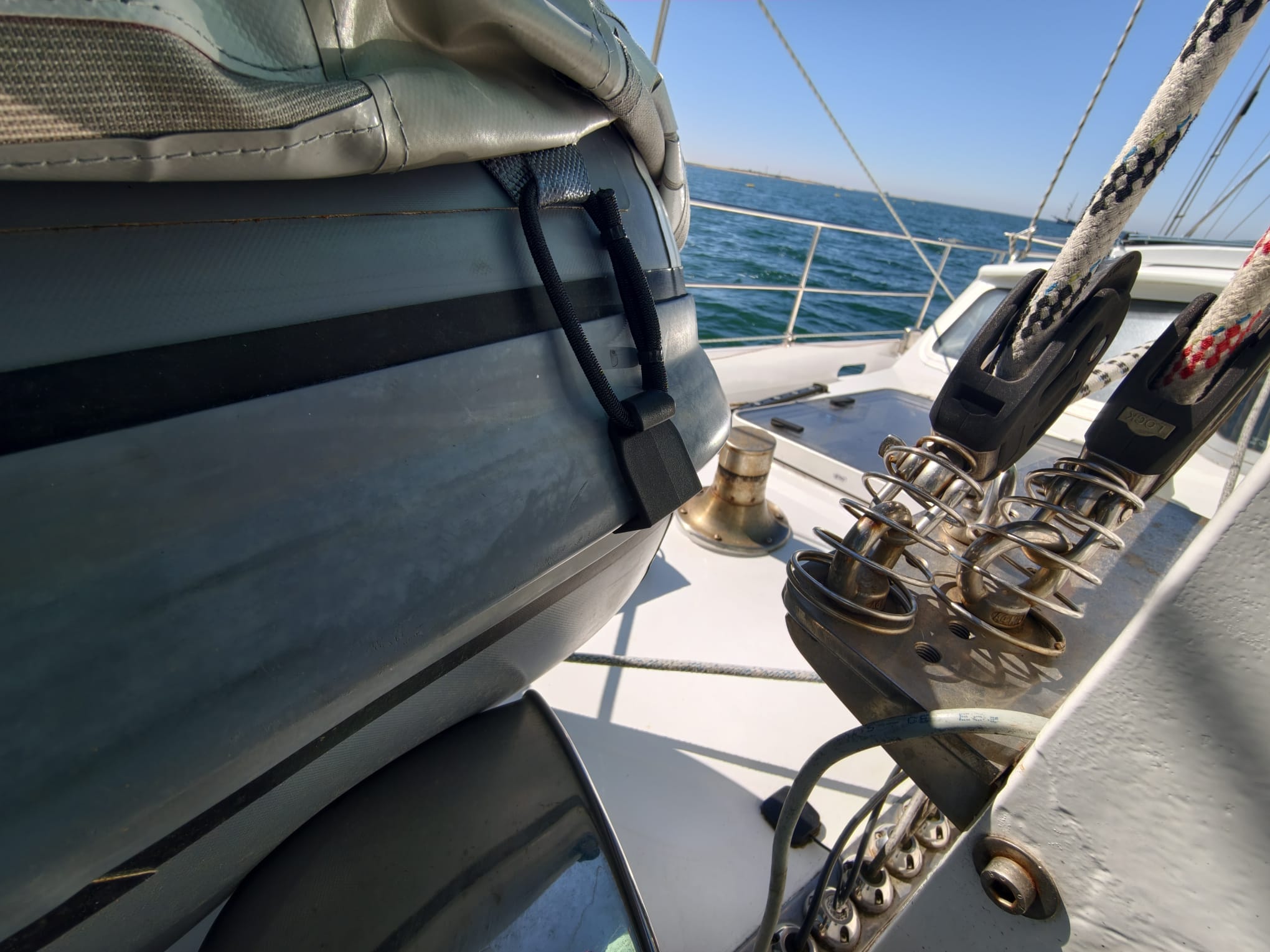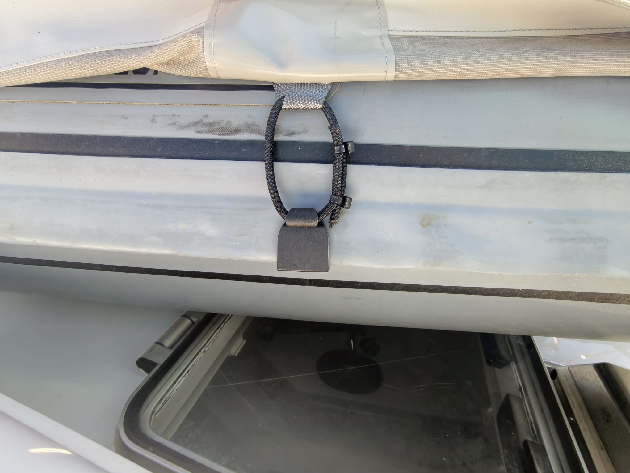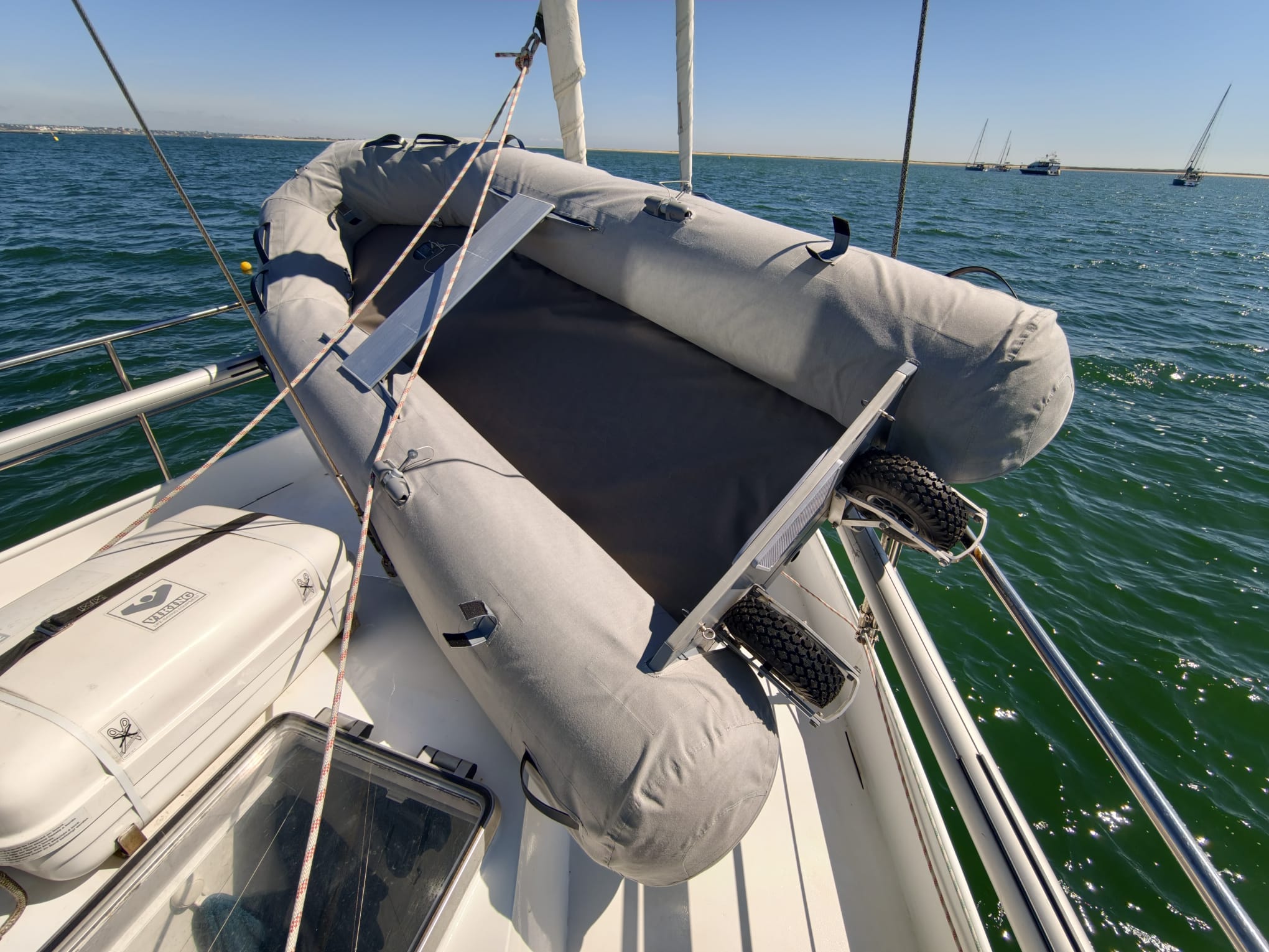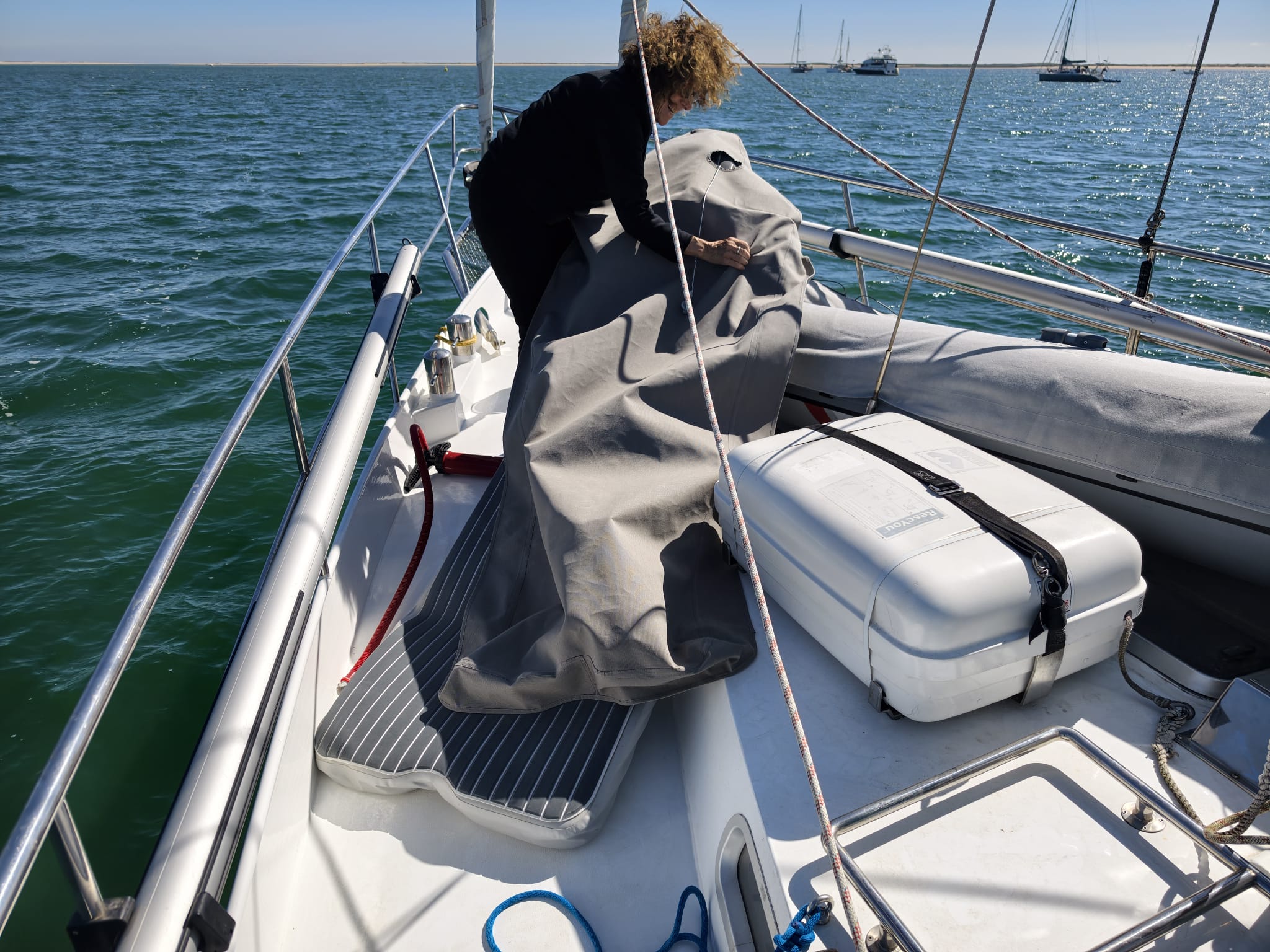 Then we put the deflated floor in the dinghy and pump it to pressure. The floor holds the tube covers nicely in place on the inside. Dinghy fully dressed! 🤩