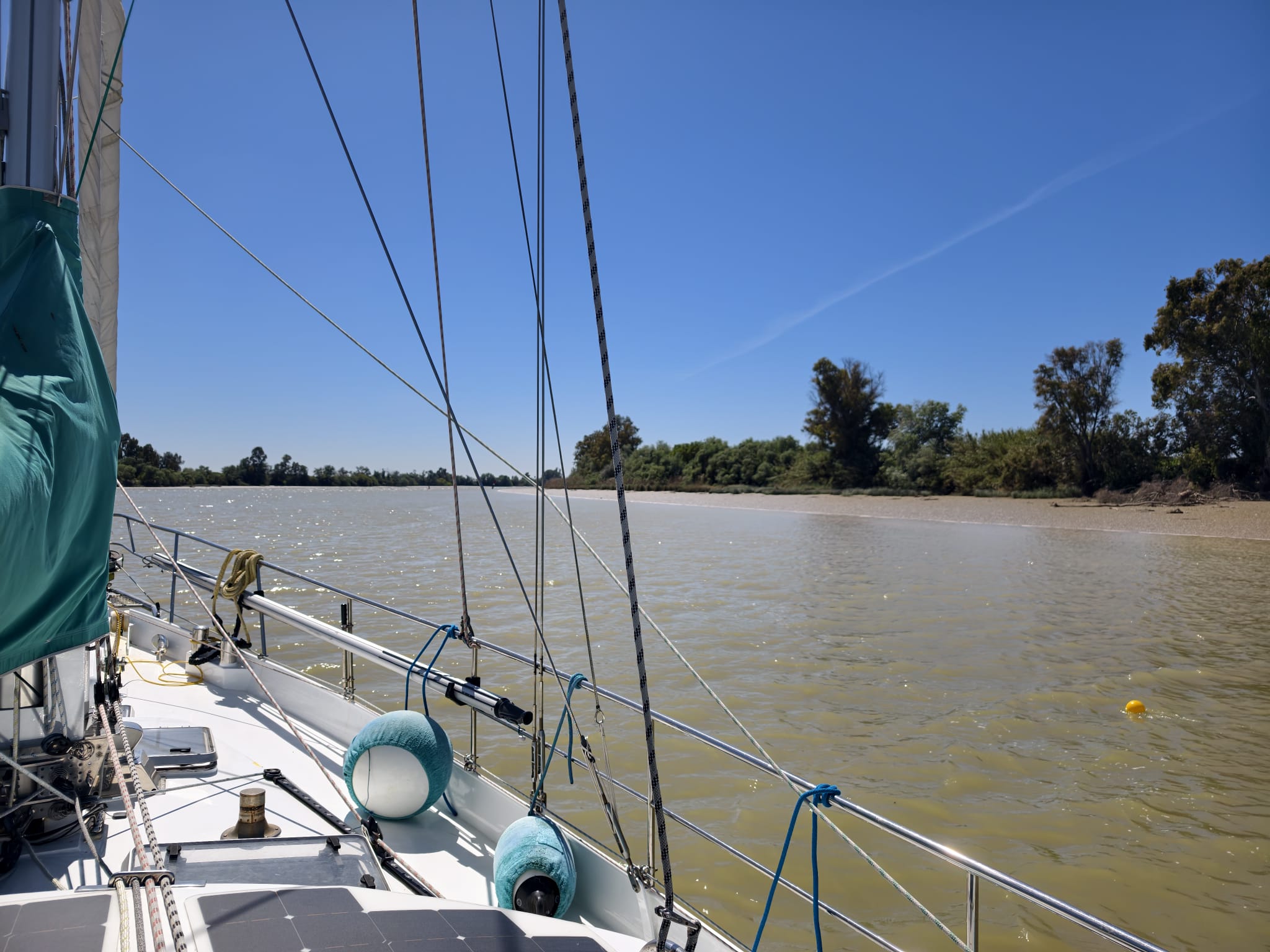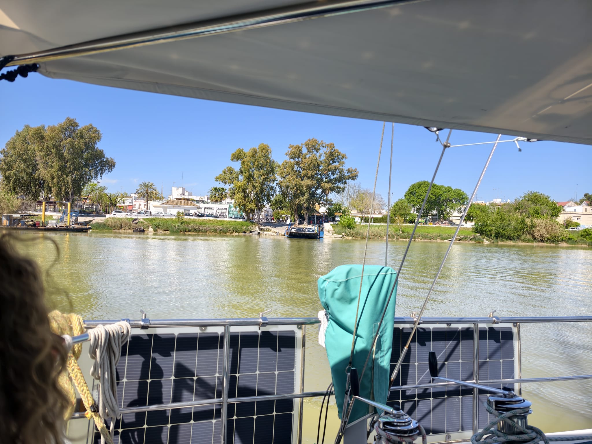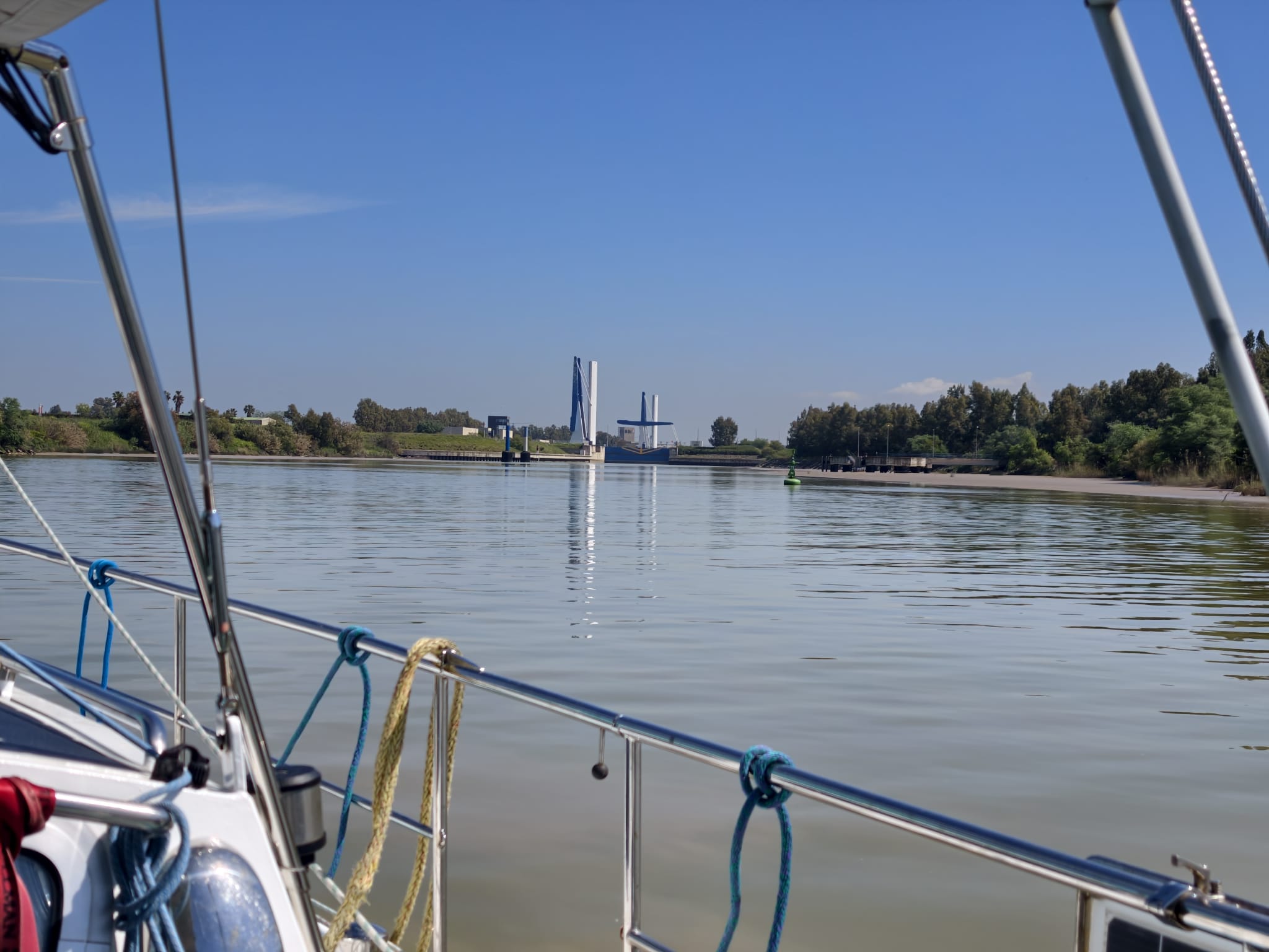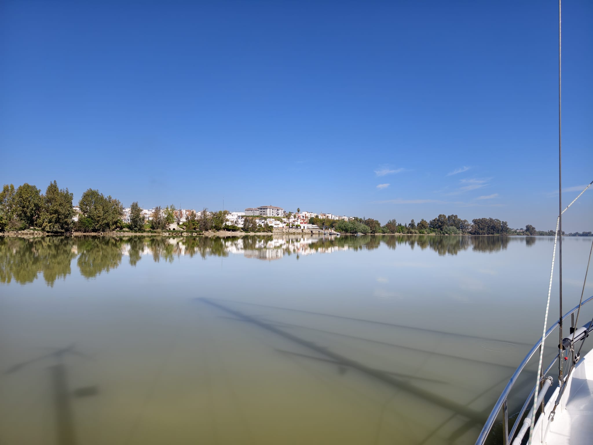 Now it’s time to leave the marina and work our way up the Guadalquivir river entrance towards Seville. Chipiona at our stern. There’s almost no wind and the weather is gorgeous. We enjoy the little trip!