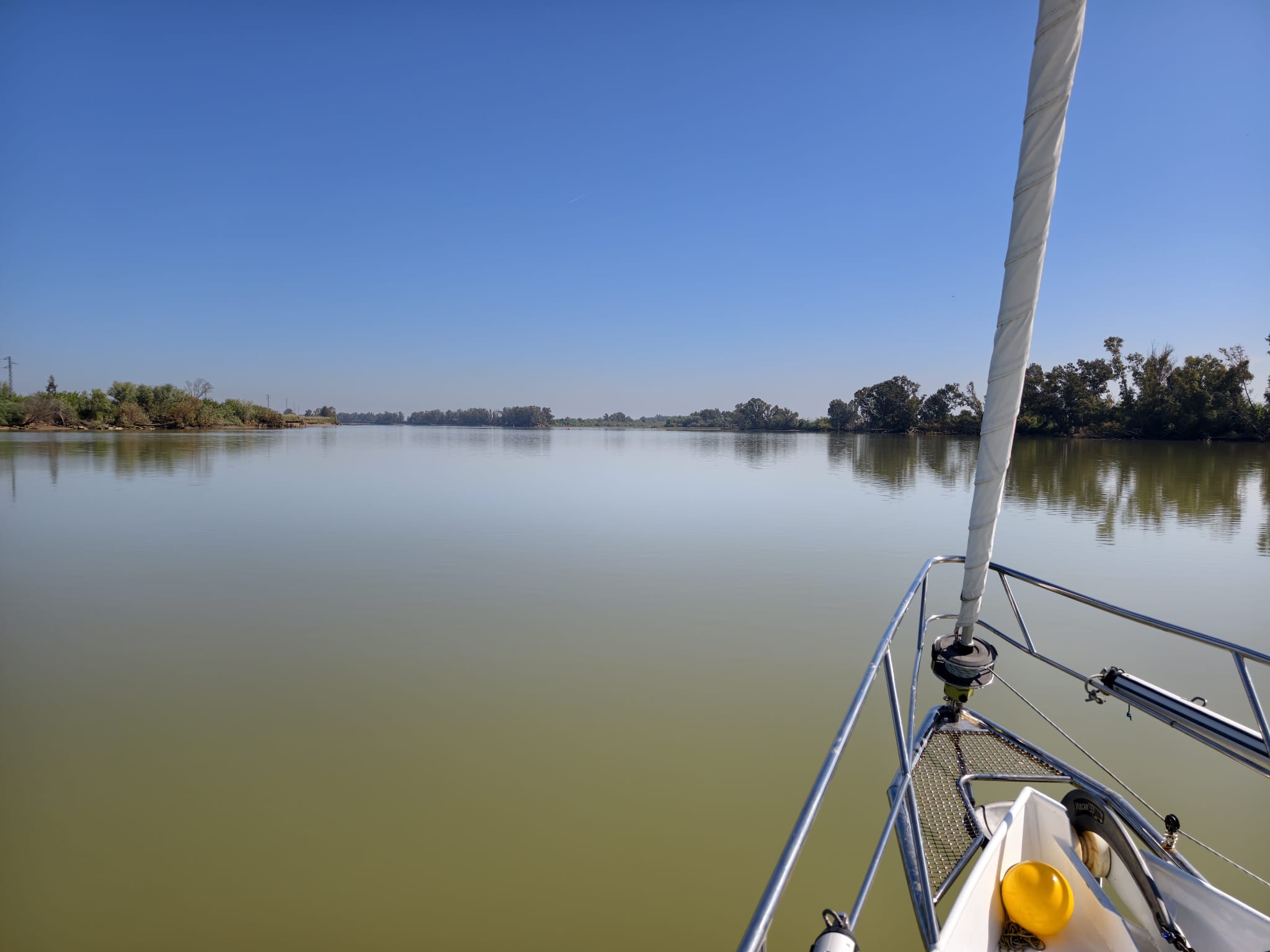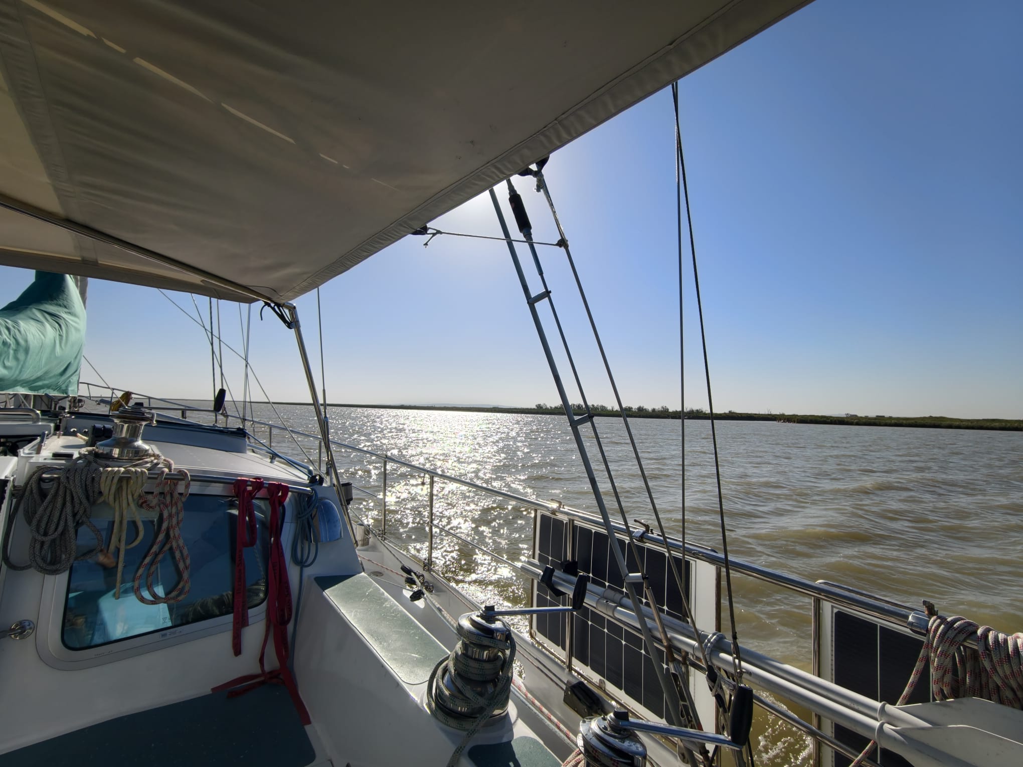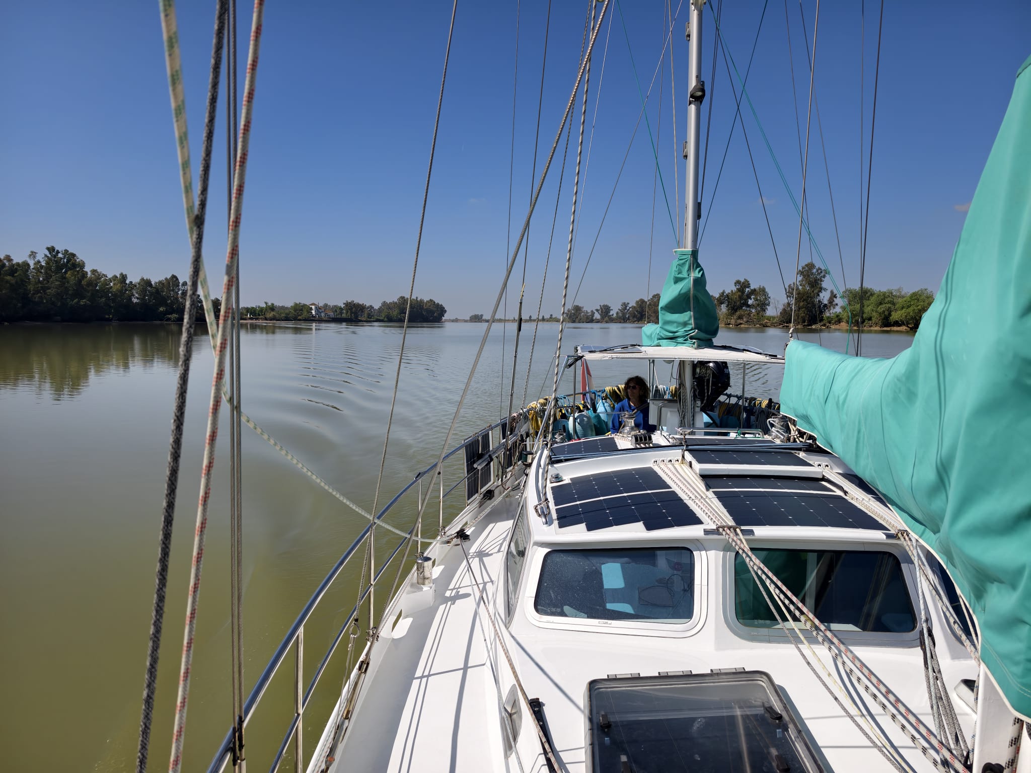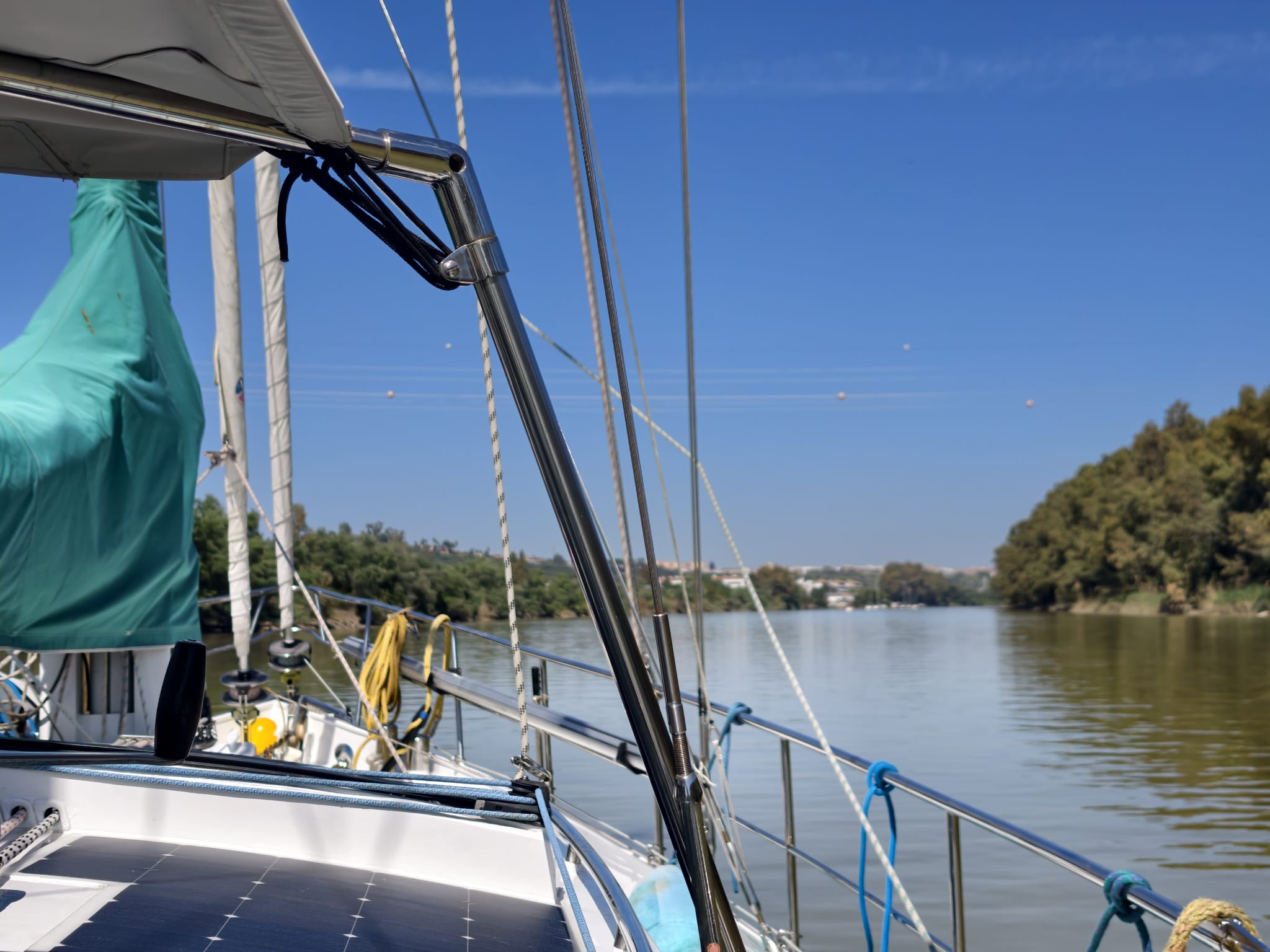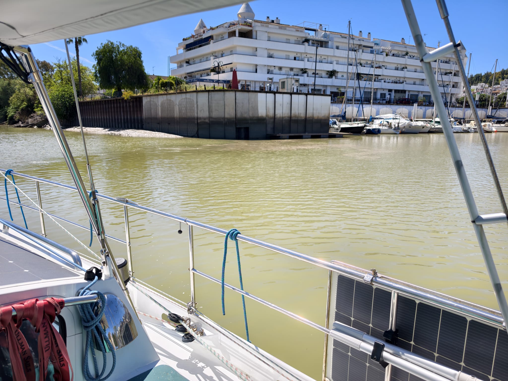 Now it’s time to leave the marina and work our way up the Guadalquivir river entrance towards Seville. Chipiona at our stern. There’s almost no wind and the weather is gorgeous. We enjoy the little trip!