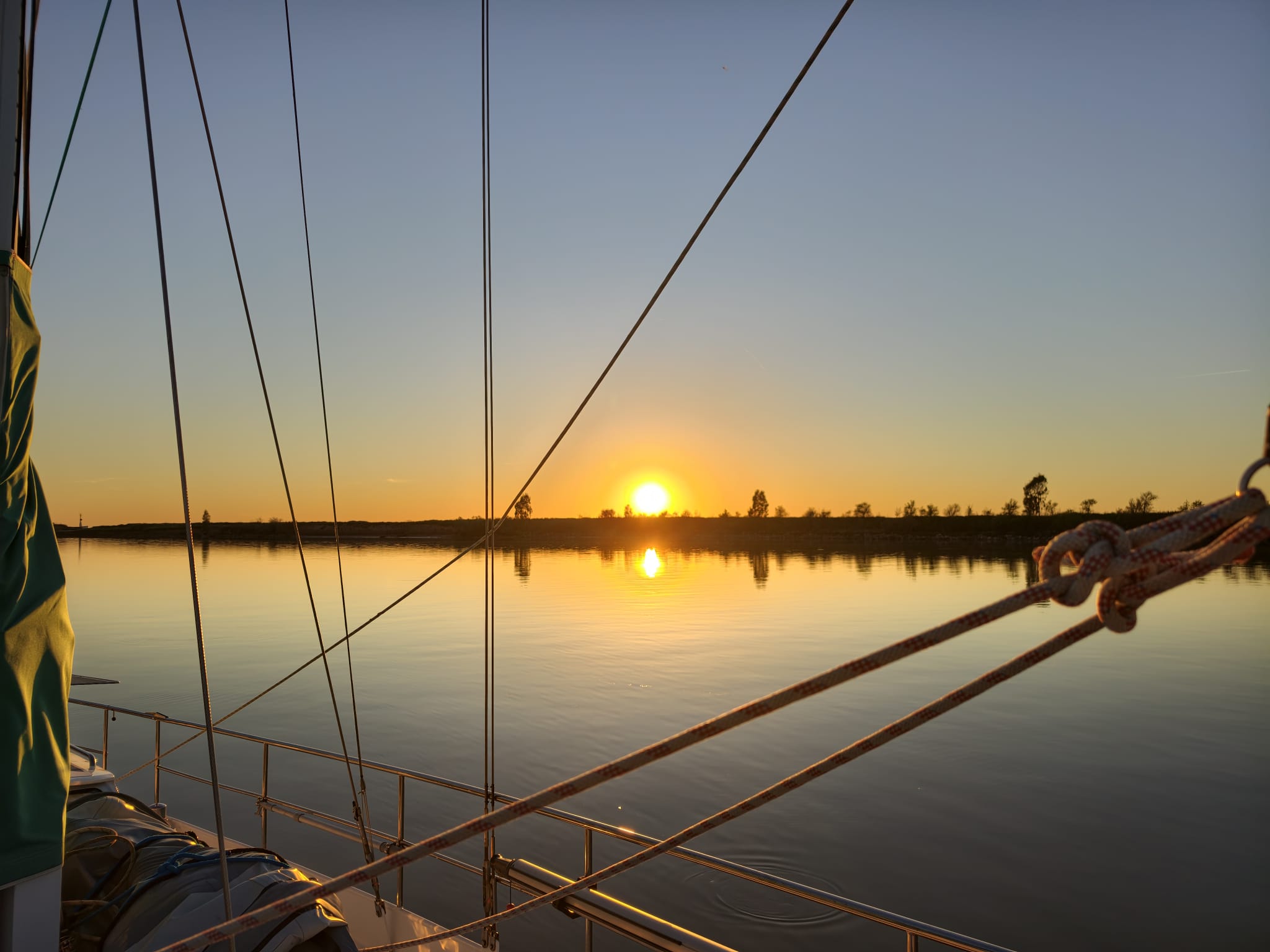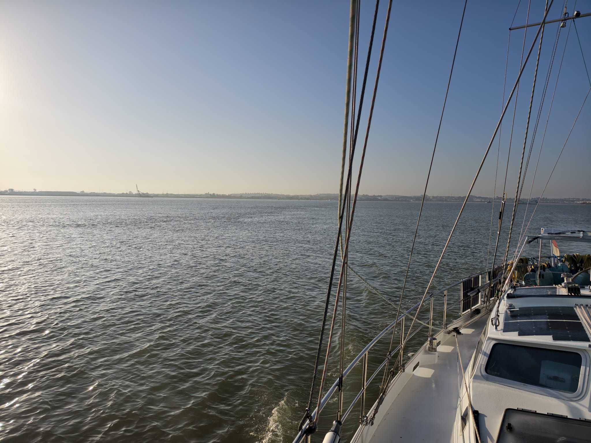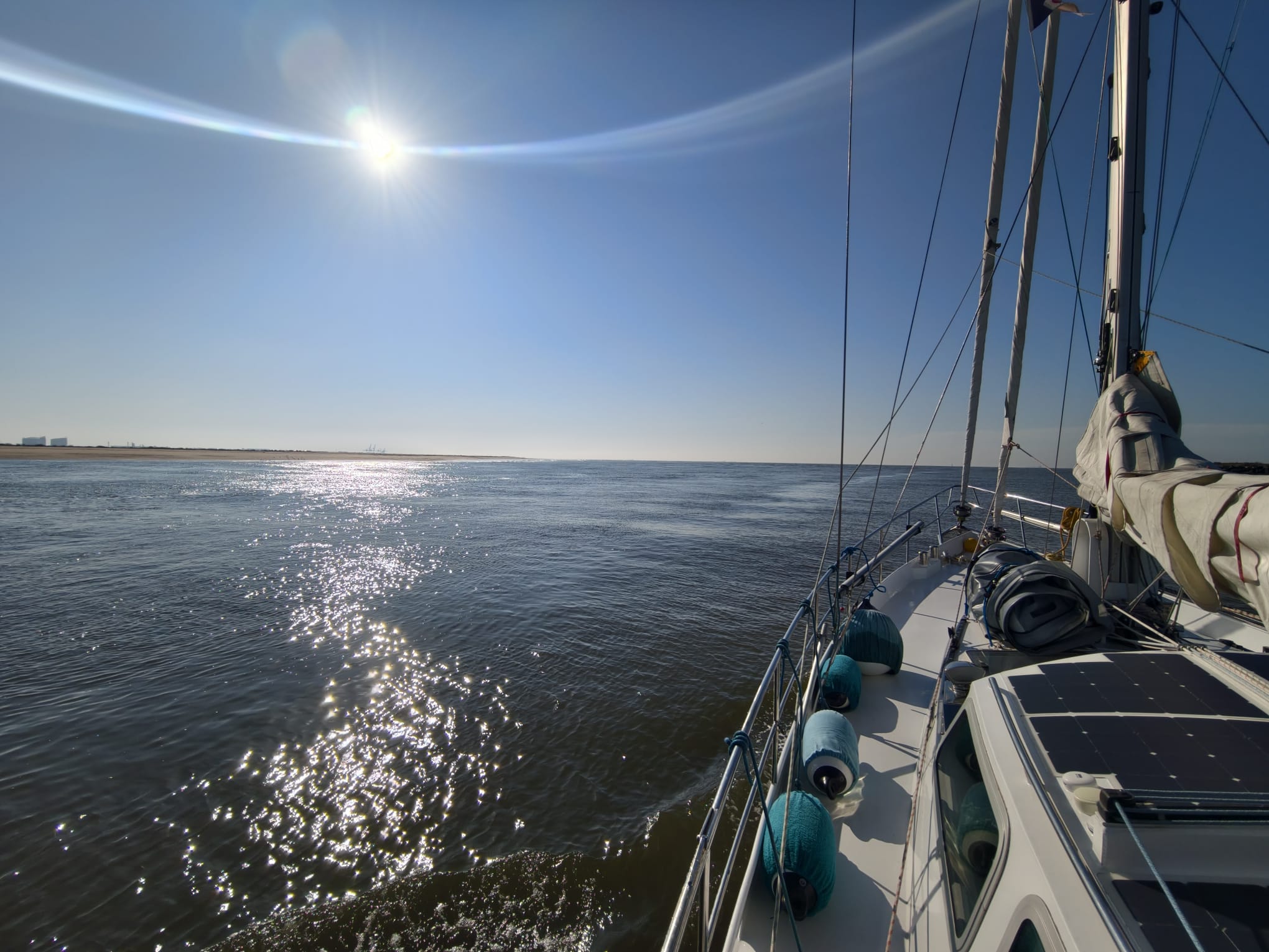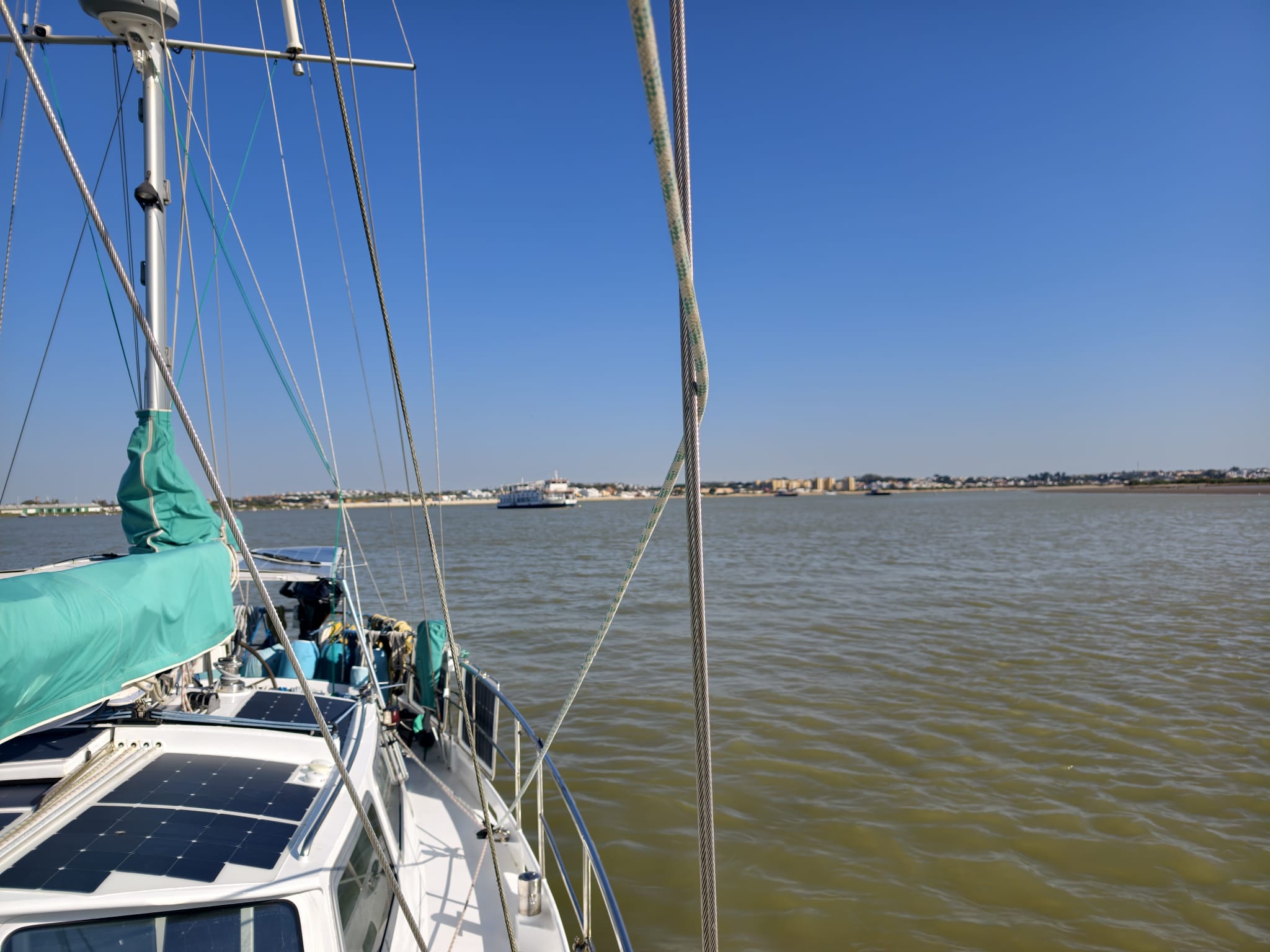 Now it’s time to leave the marina and work our way up the Guadalquivir river entrance towards Seville. Chipiona at our stern. There’s almost no wind and the weather is gorgeous. We enjoy the little trip!