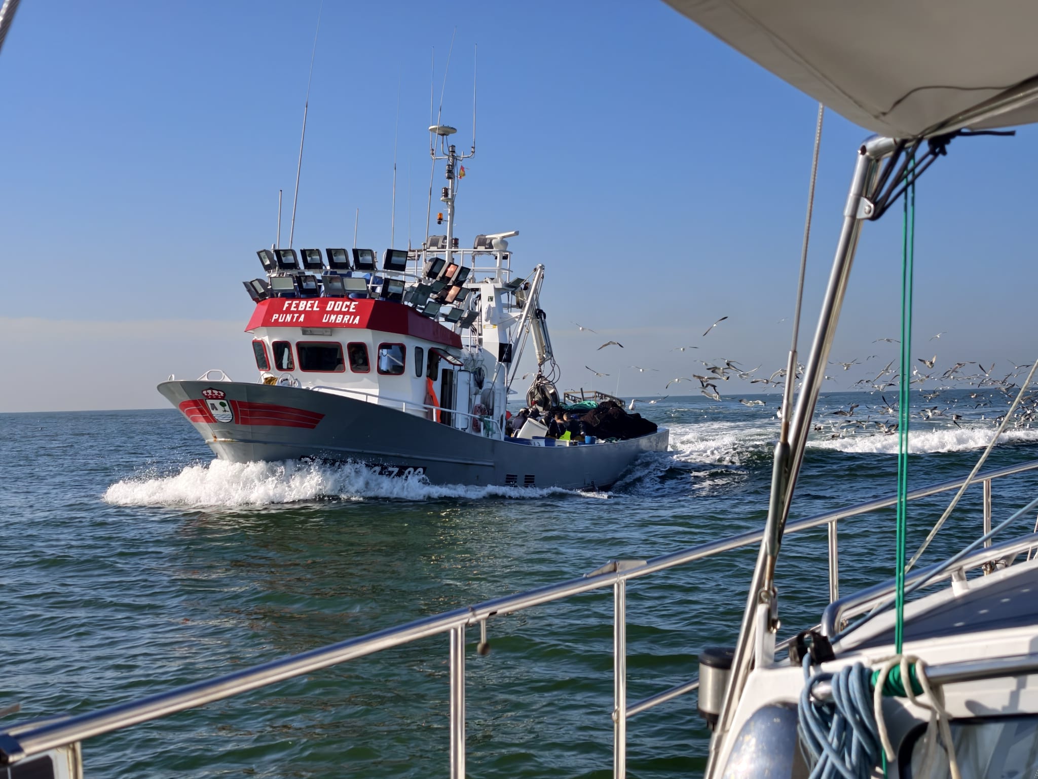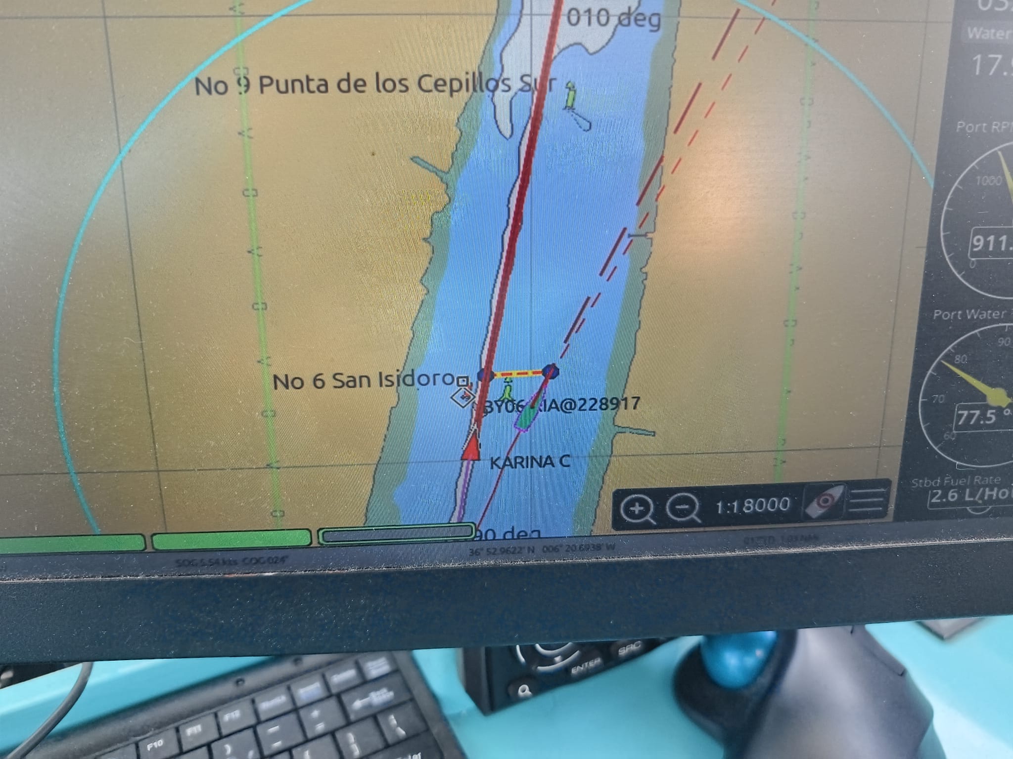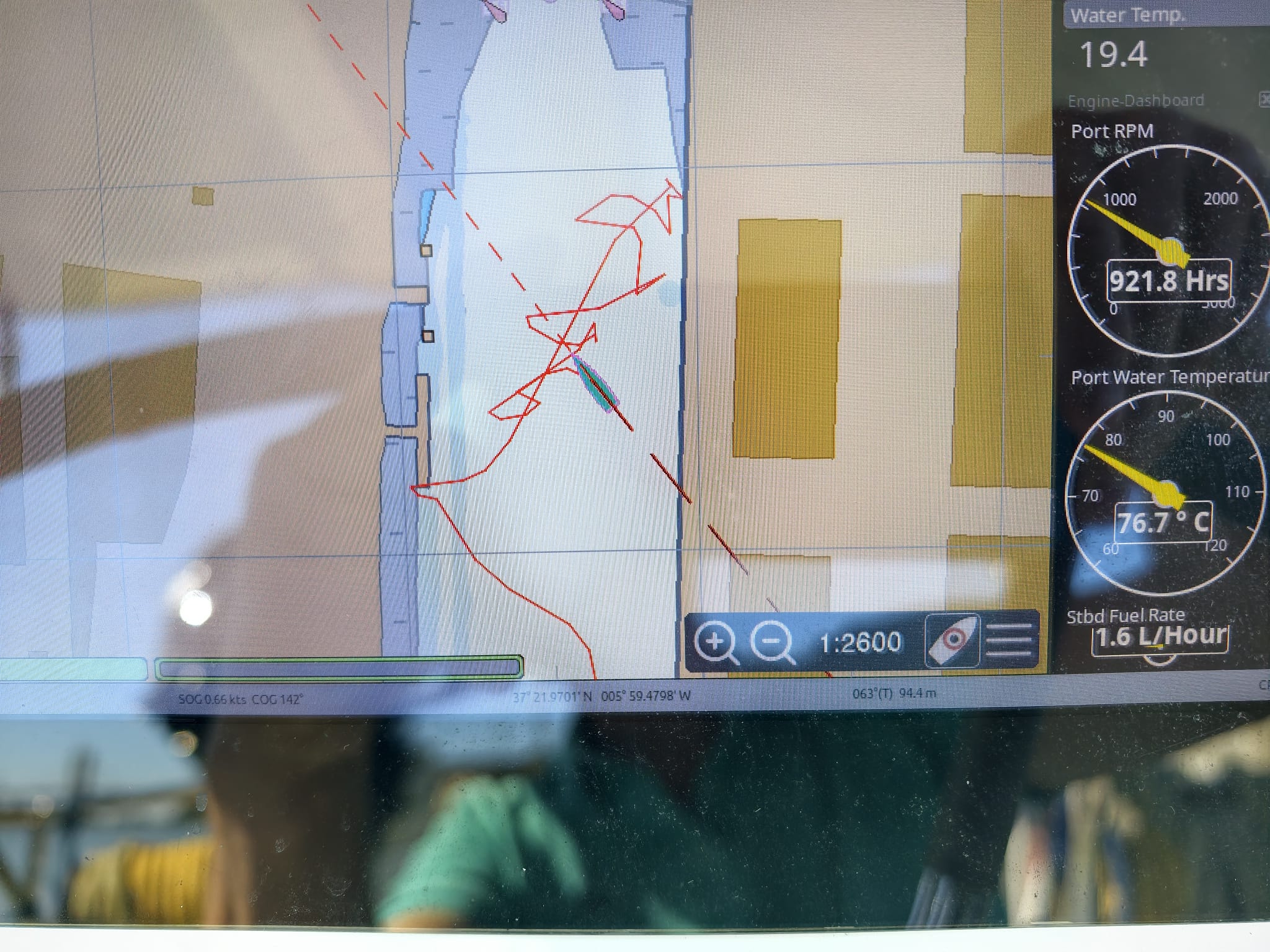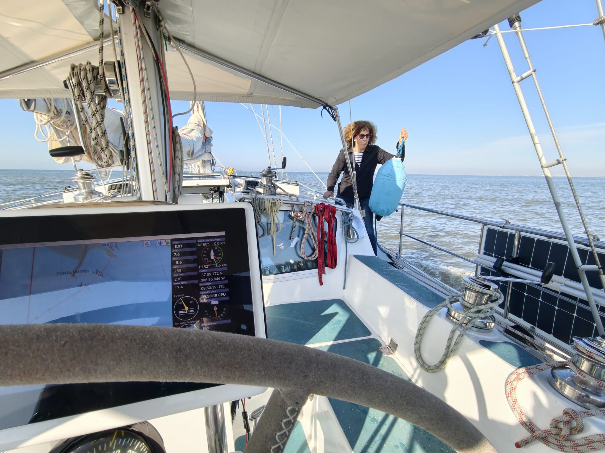 But getting out of the marina in Punta Umbria is a bit tricky. 1-3 hours after high tide, the current in the marina is very strong. Making maneuvering dangerous. Well, high tide is 0500h this morning so we wait until the current eases. But not too long because we have to get over the shallow sand banks: at low tide there’s 1,2m and we need 1,4m so we have to be there well before low tide…