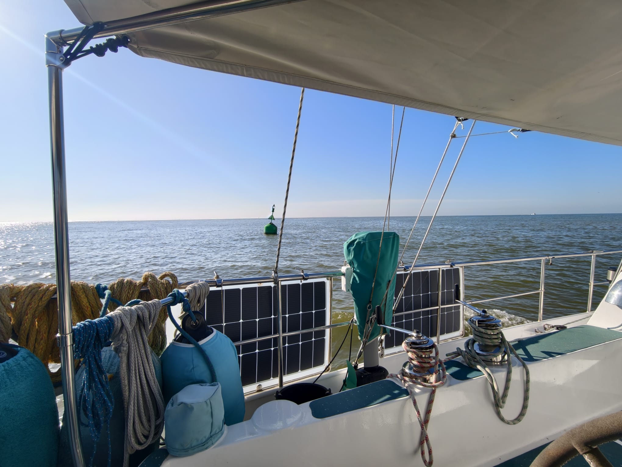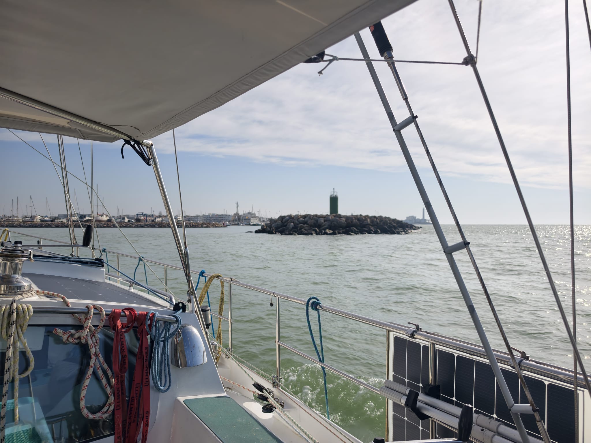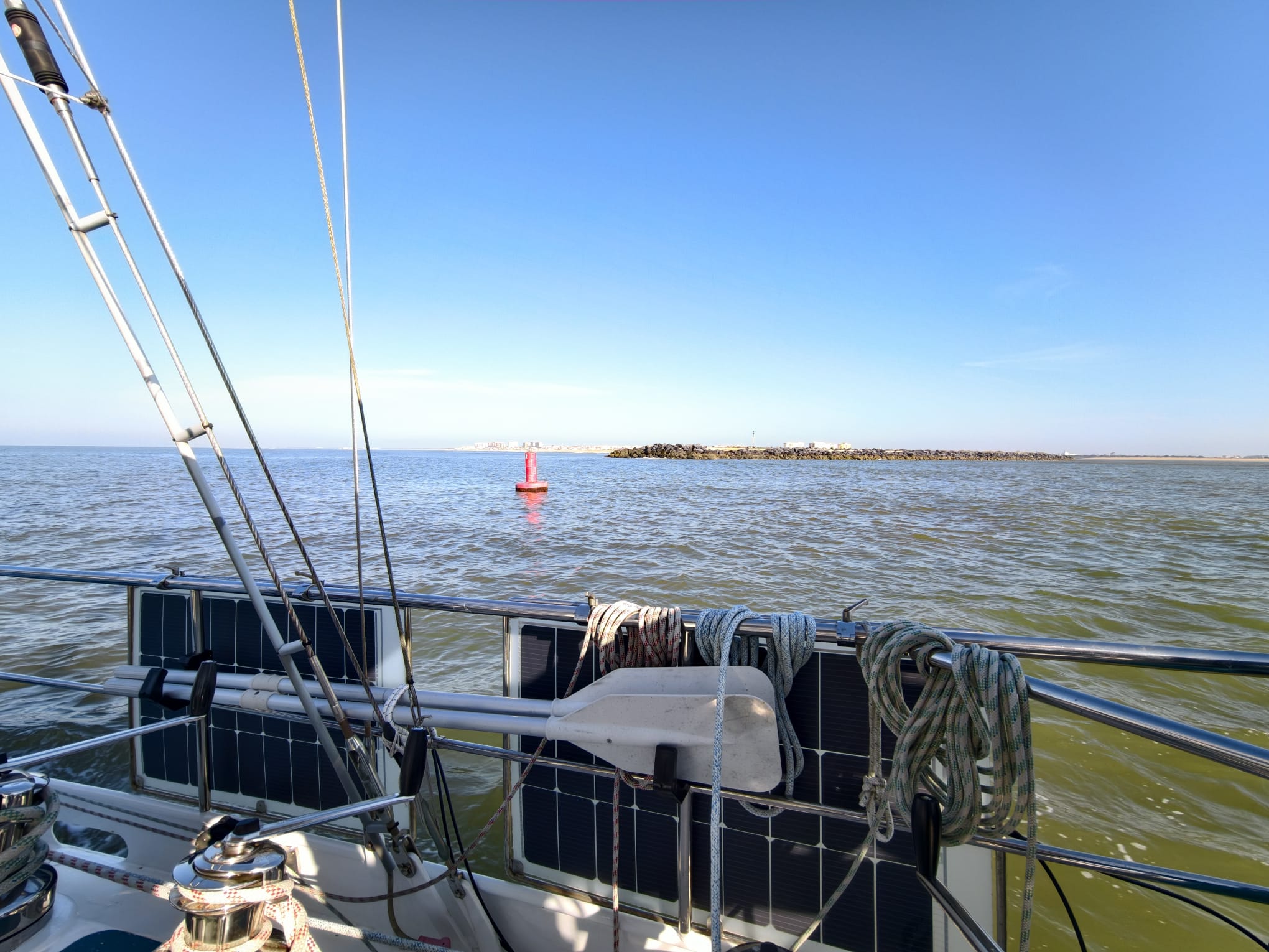 Once we’re outside the breakwaters we follow the buoys that mark the narrow channel between the sandbanks. We see a minimum of 3,20m of depth.