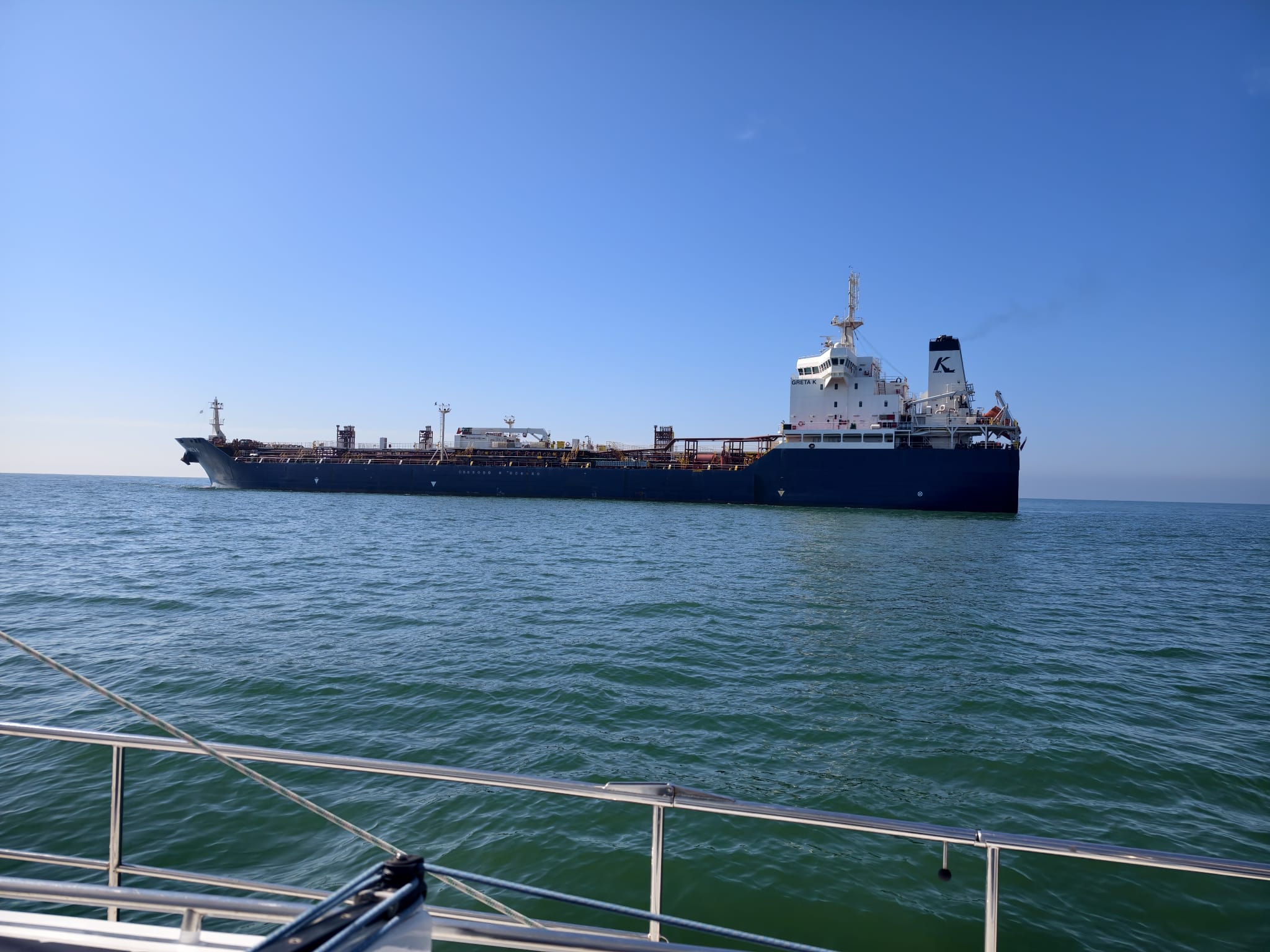 It’s a calm and bright afternoon. Some big ships pass us, making us rock heavily with big wake and suction.