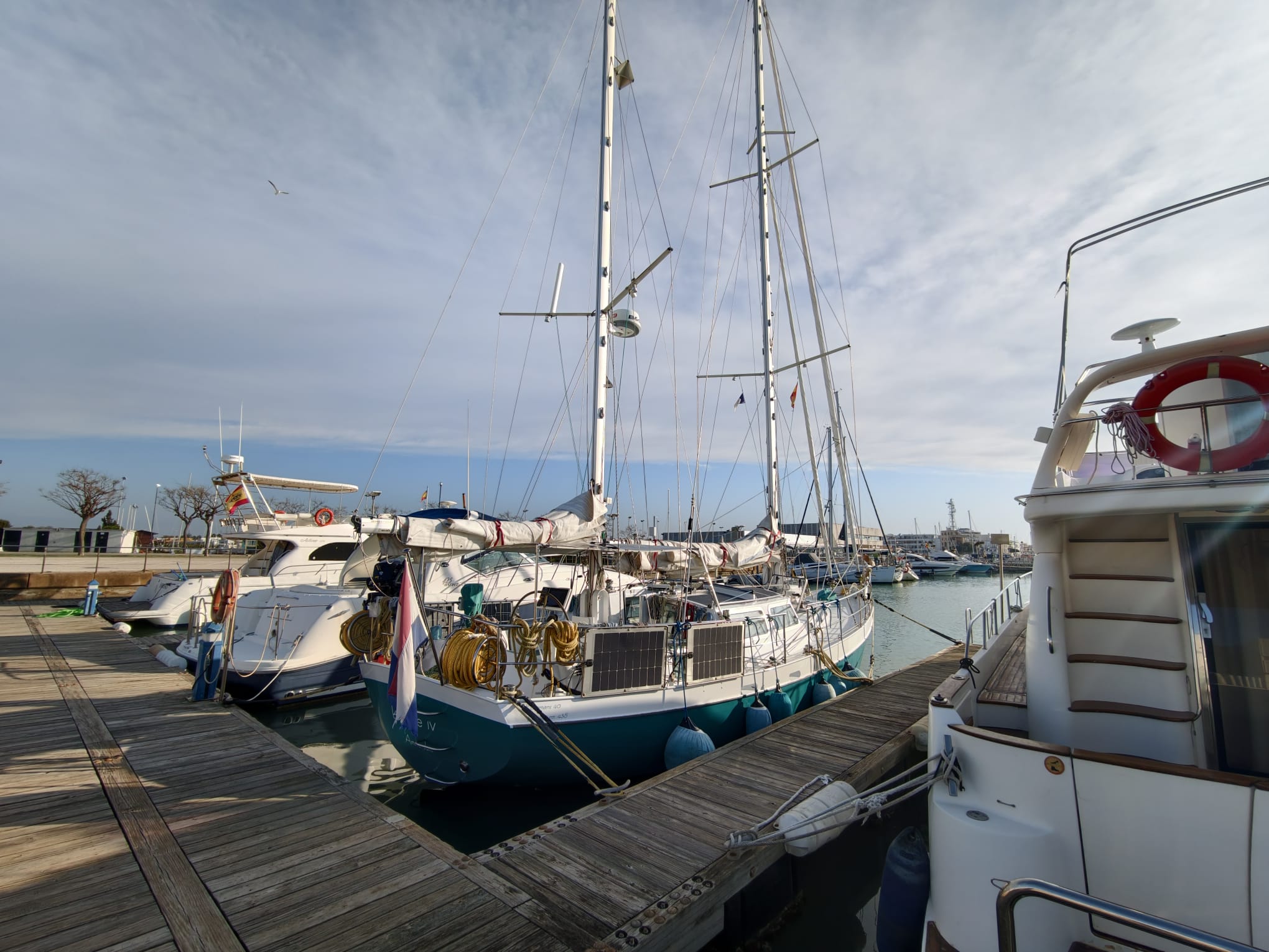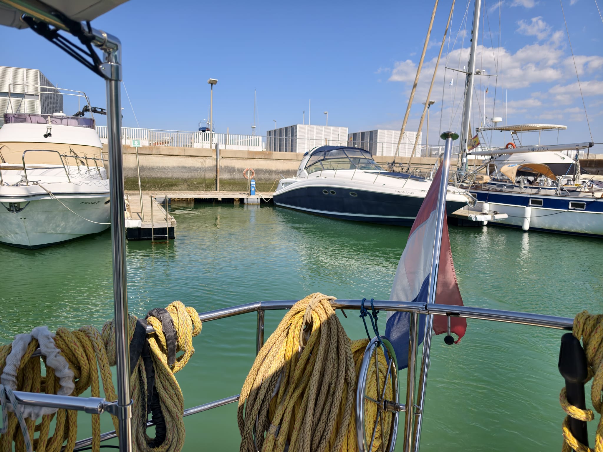 After low tide (we hit the bottom and see 10cm below our waterline) we wait till we’re afloat and at 1430h we depart from Gelves marina.