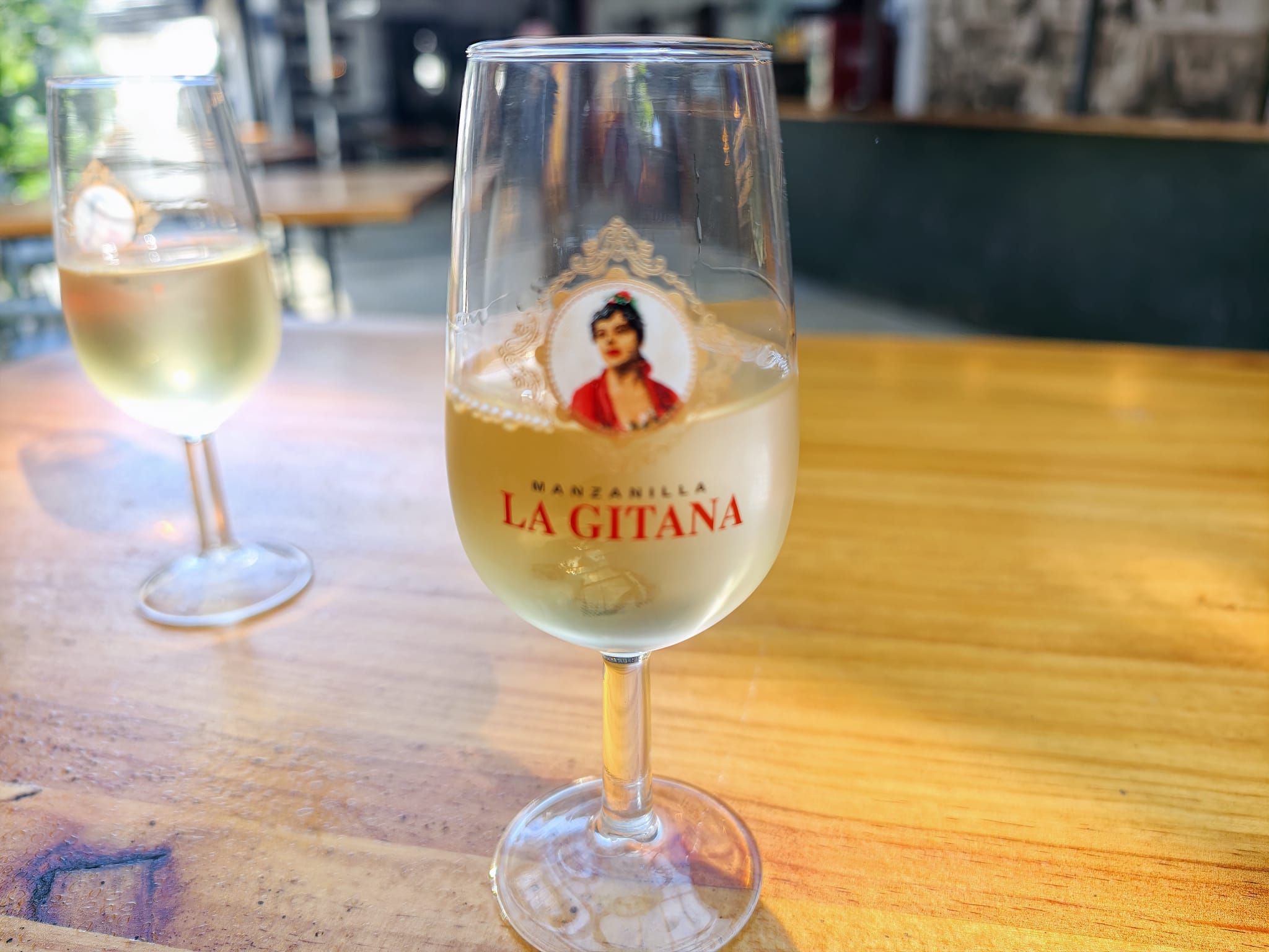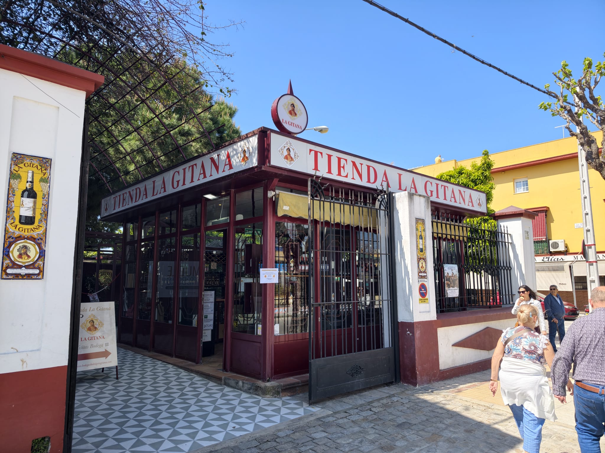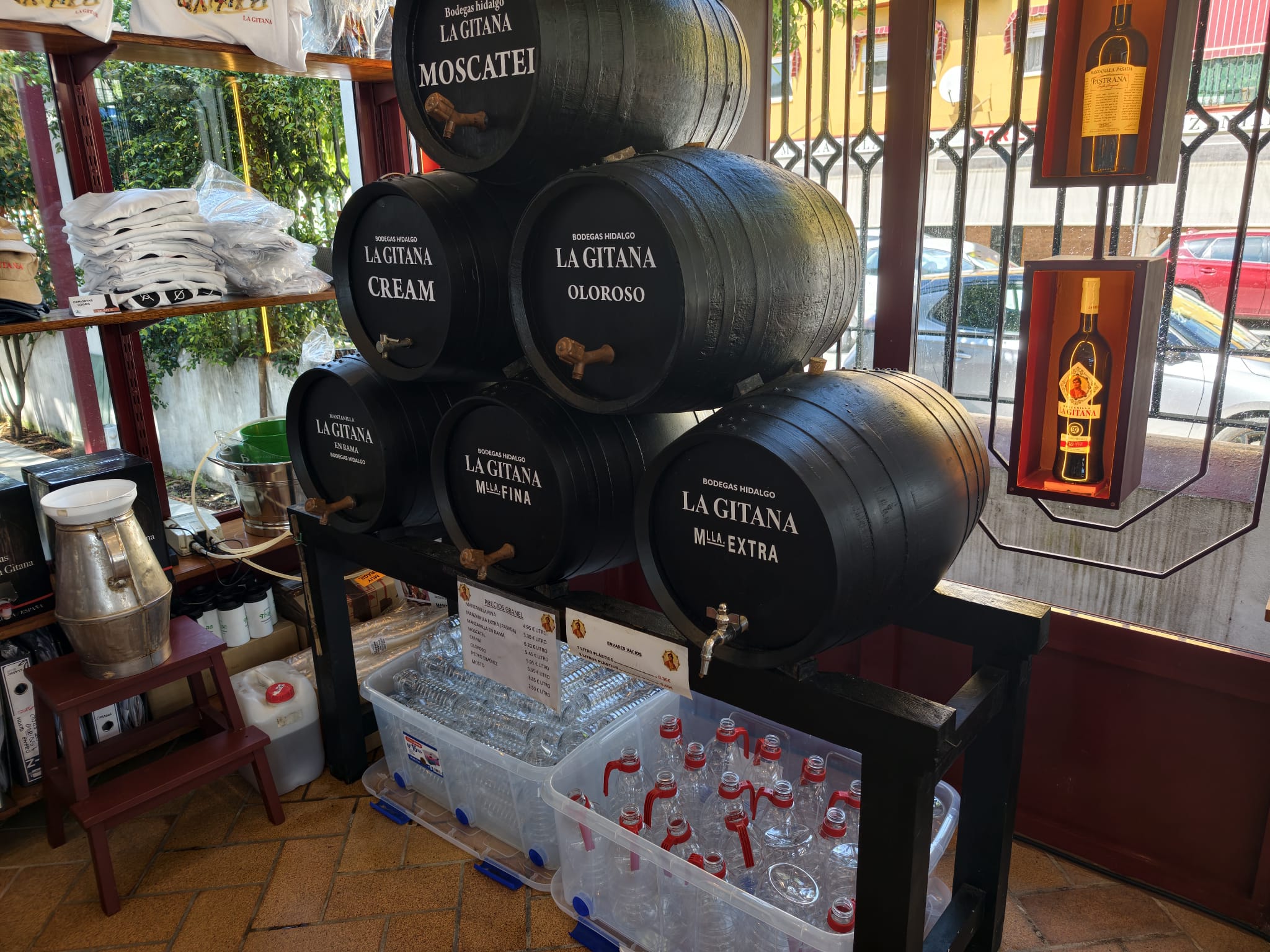 There’s a kiosk where they sell their Hidalgo La Gitano Sherry directly from the casks as well as in bottles. You bring your own bottle and they fill it. Sher has been here in 2021, so she knew about this and brought 2 of our water bottles! (who needs water when you can have delicious Sherry!