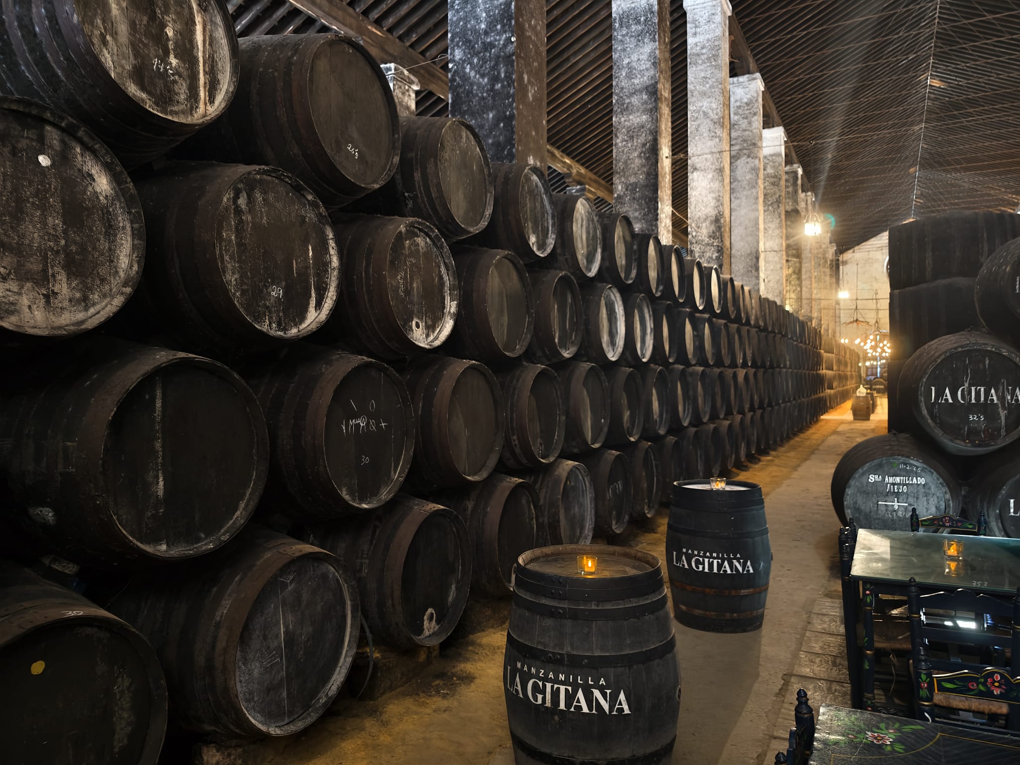 This is what they call “The Cathedral”. Hundreds of Sherry casks are stored here. The breeze from the sea keeps them cool and moist, also in summer.