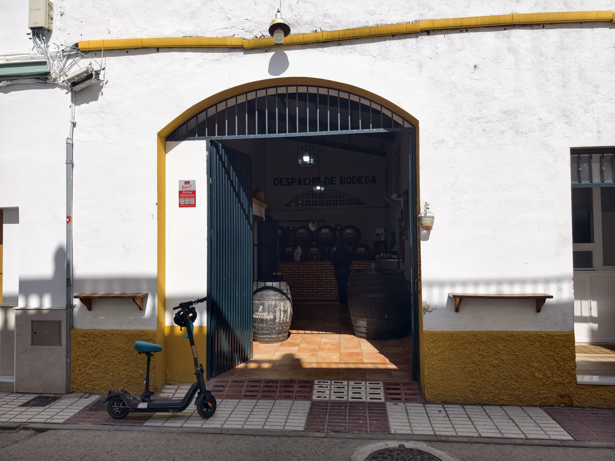 After a lovely scooter ride (about 6km over a nice bike path through an agricultural area) we arrive at the Bodega de La Gitana. Our appointment is at 11 and they’re still closed. We have to wait 10 minutes.