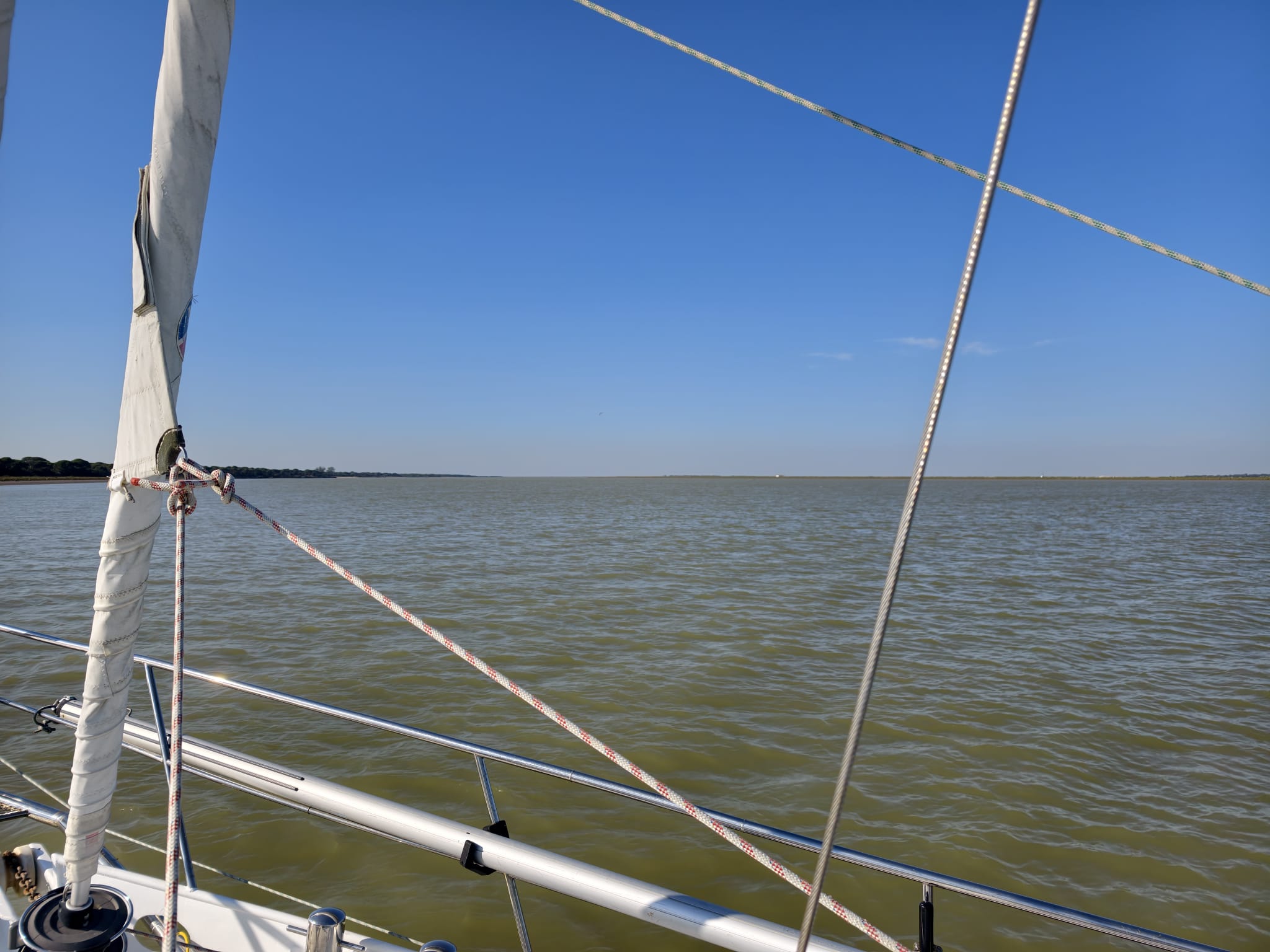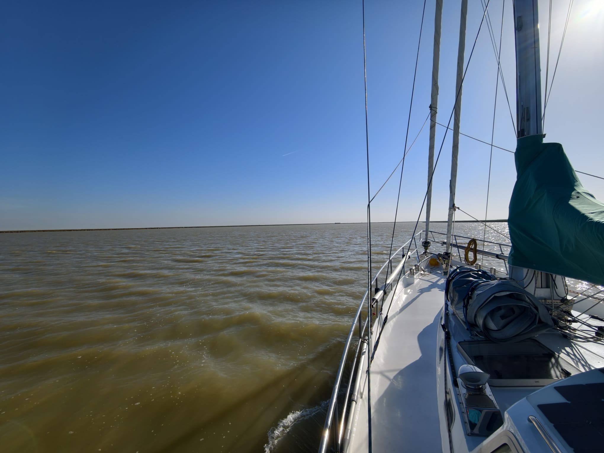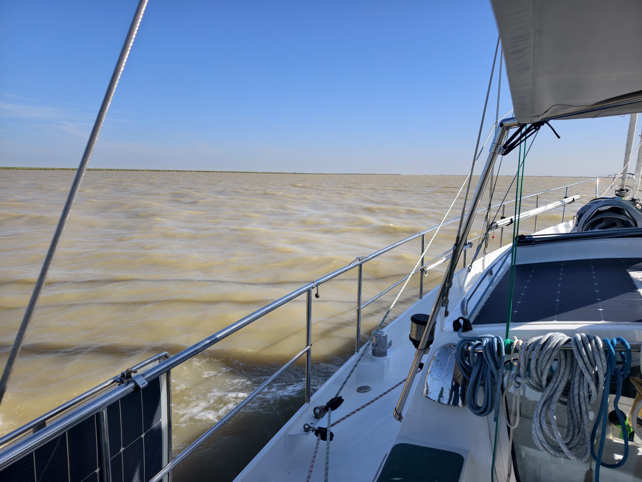 Well, the river isn’t scenic… The land is flat and seems totally uninhabited. No villages, no fishermen, no boats, no trees, no bridges, nothing. The water gets brown, more and more. In the meantime, the current has increased to 2 knots.