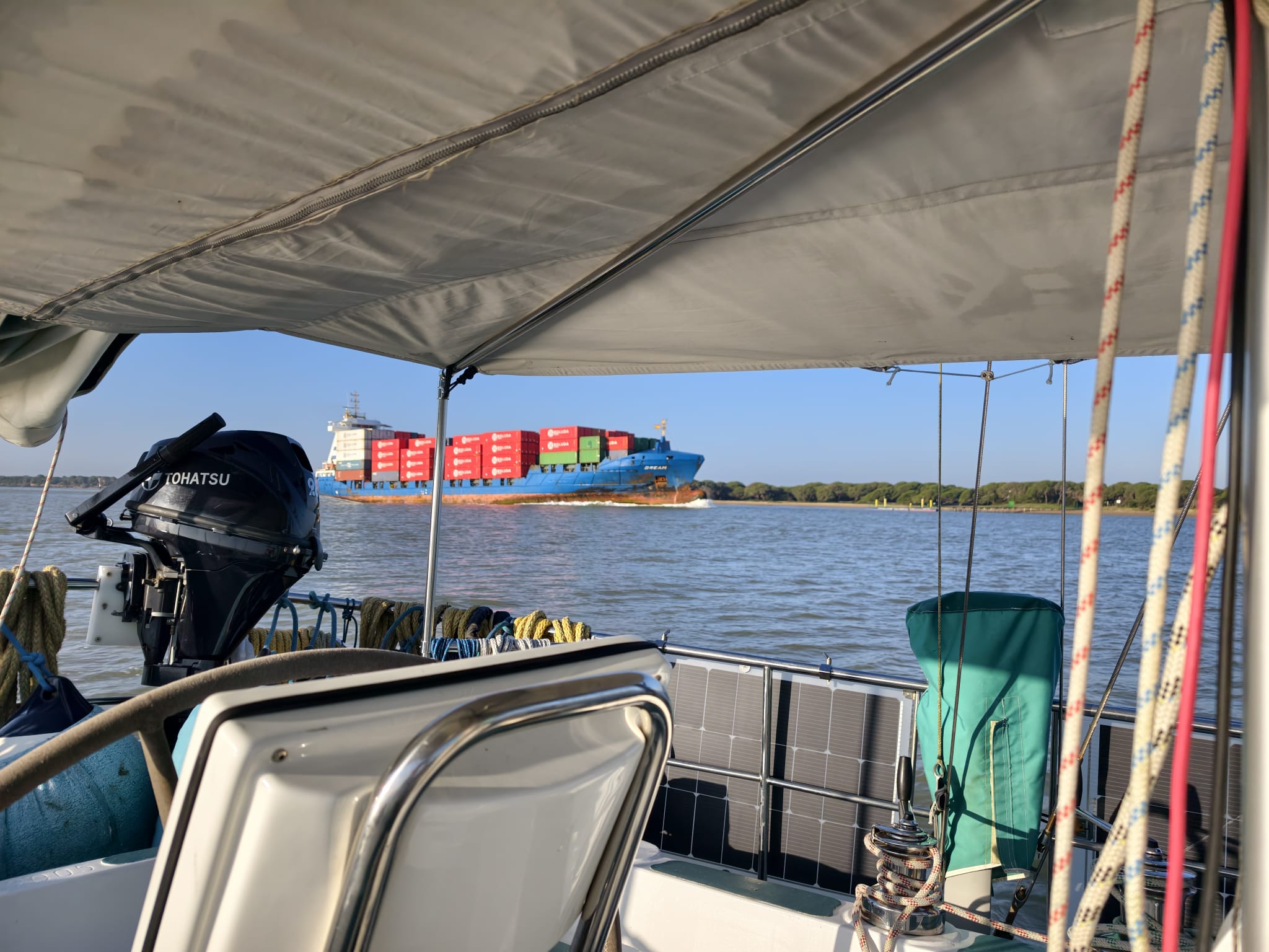 We are only about 50m outside of the green buoy so they pass quite close. But we’re at a depth of 2m (at low tide) so they wouldn’t try to pass outside that buoy, with their draft of 6m…